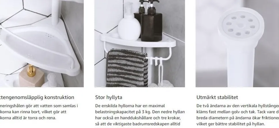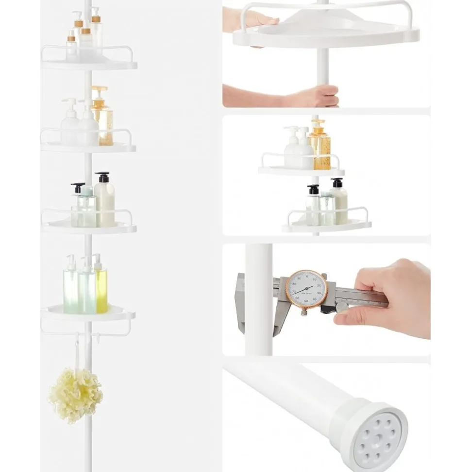 Duschhylla med rör av pulverlackerad stål och hyllplan av plast. Justerbara hyllplan med dräneringshål. Monteras mellan golv och tak