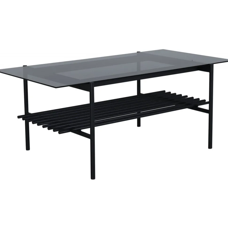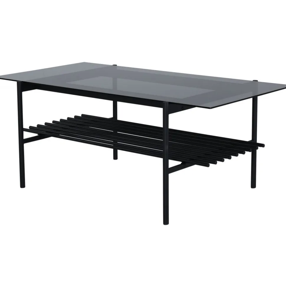 Soffbord av metall och rökfärgat glas.