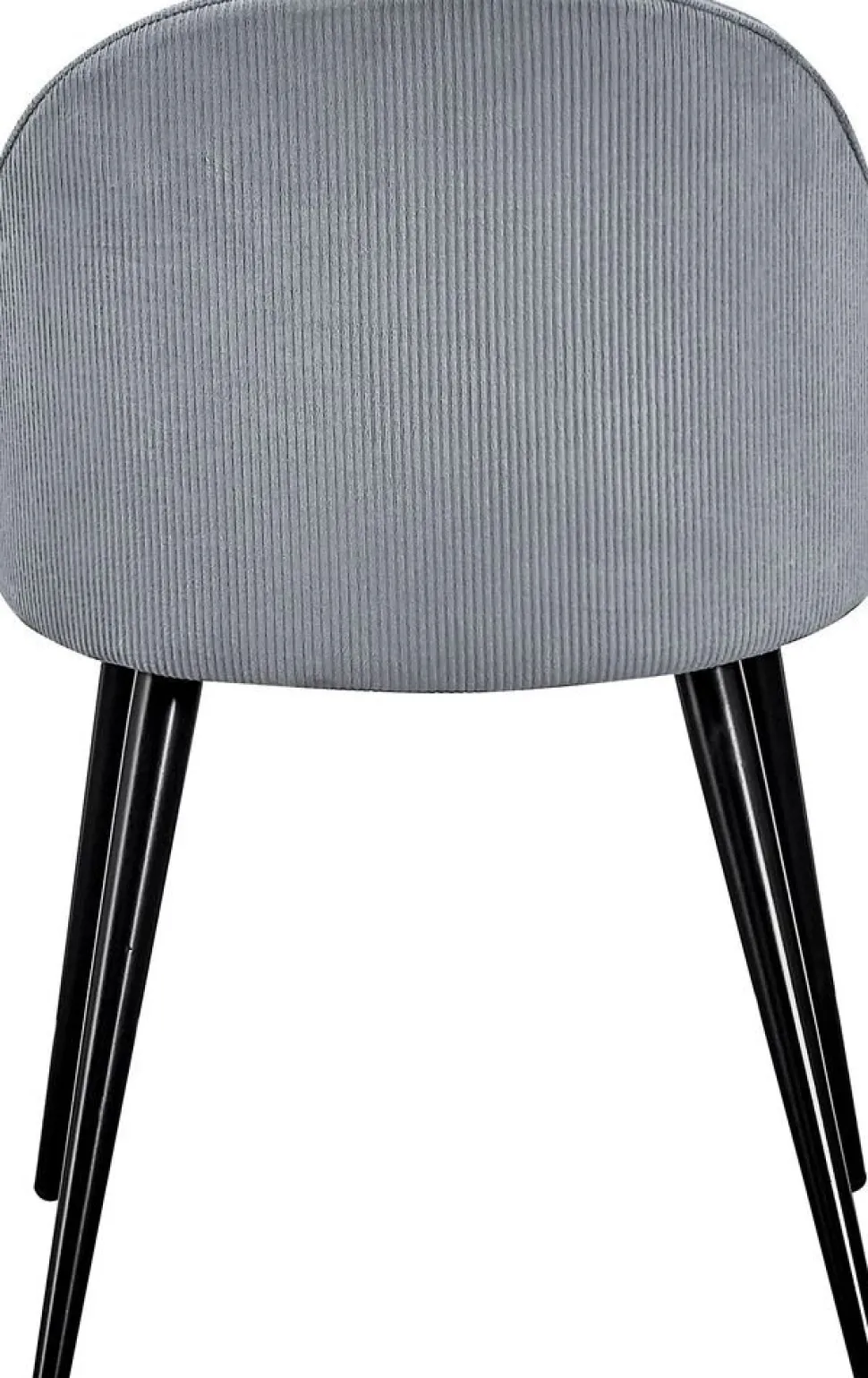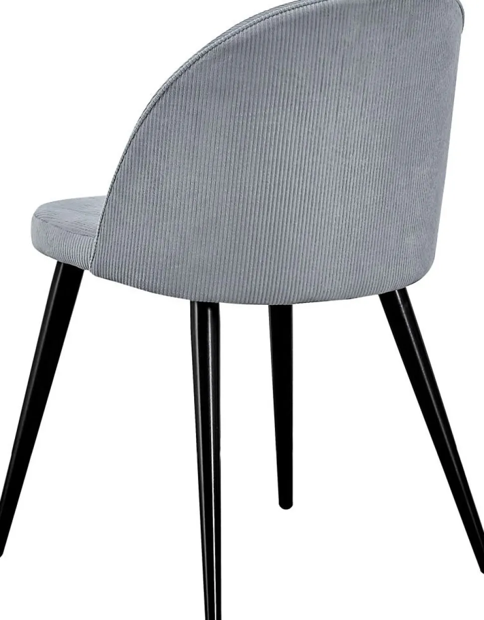 Matstol klädd med ljusgrått tyg, 100% polyester. Sits- och rygg är skumstoppade. Svarta ben i metall.