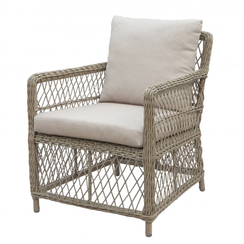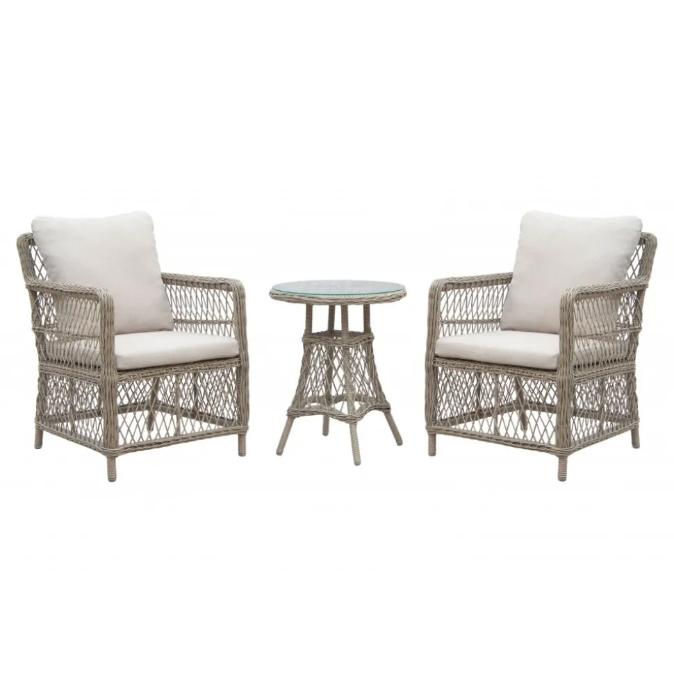 Gränna balkongset bestående av 2 st fåtöljer kompletta med rygg och sittdynor samt ett matchande sidobord. Naturfärgad konstrotting och beige kvalitetstyg på 230gram. Stomme i aluminium för att hålla i många år. Bordet med toppskiva av tempererat glas.