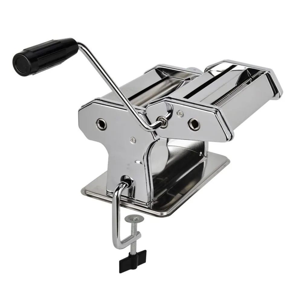 Pastamaskin i kromat utförande. Tillverkad av stål, aluminium och PC (plast).