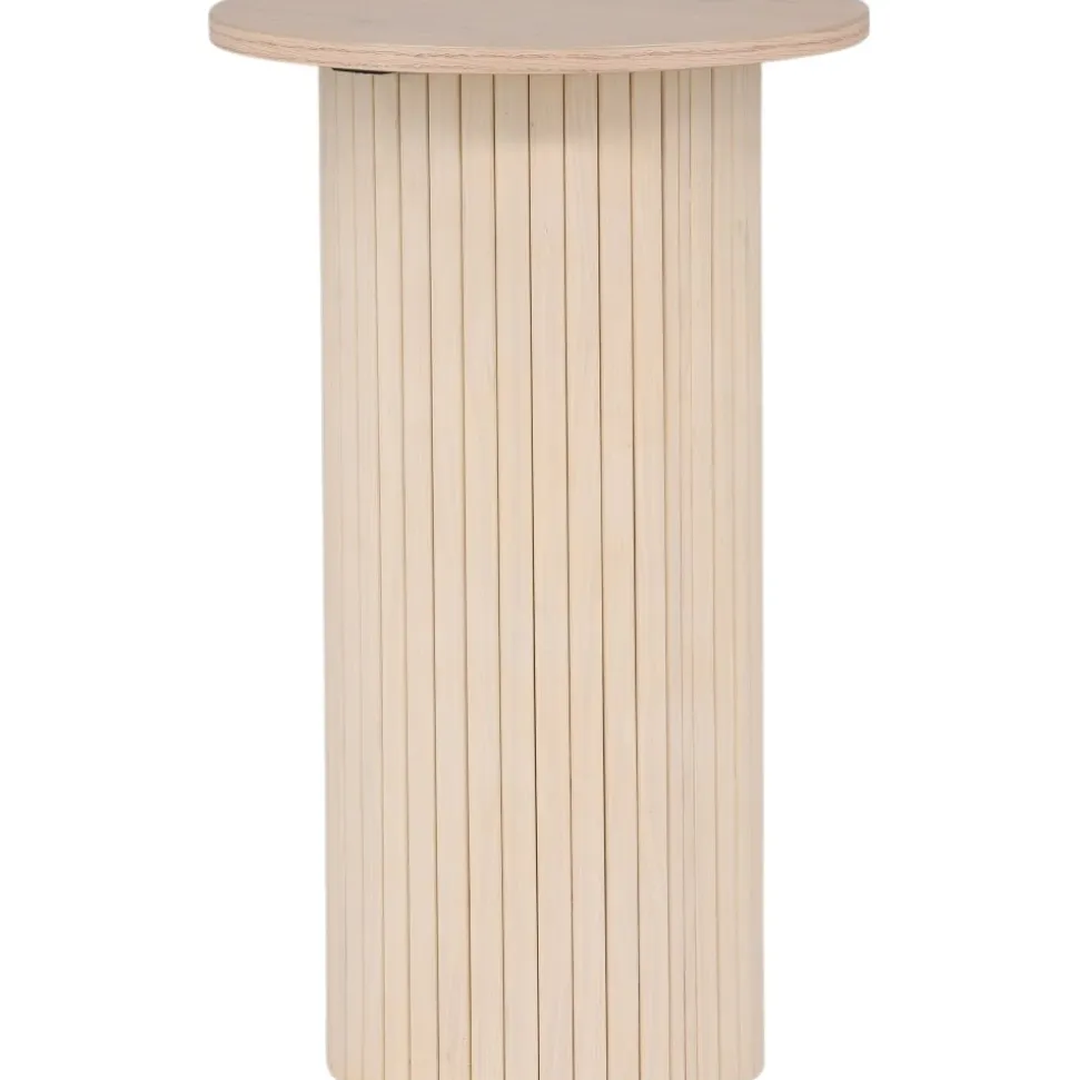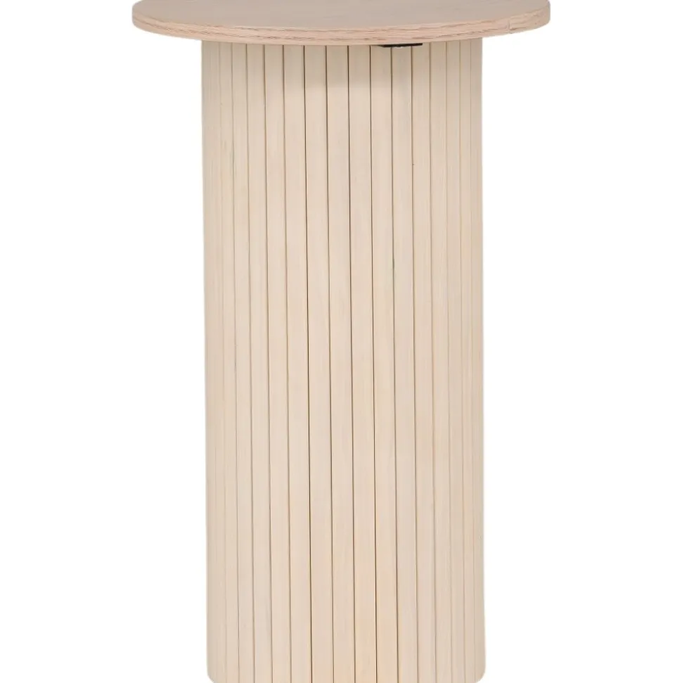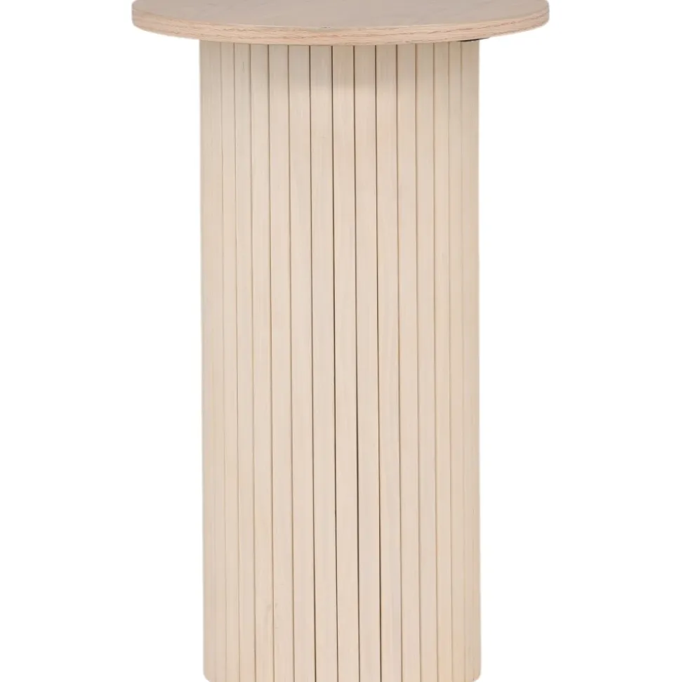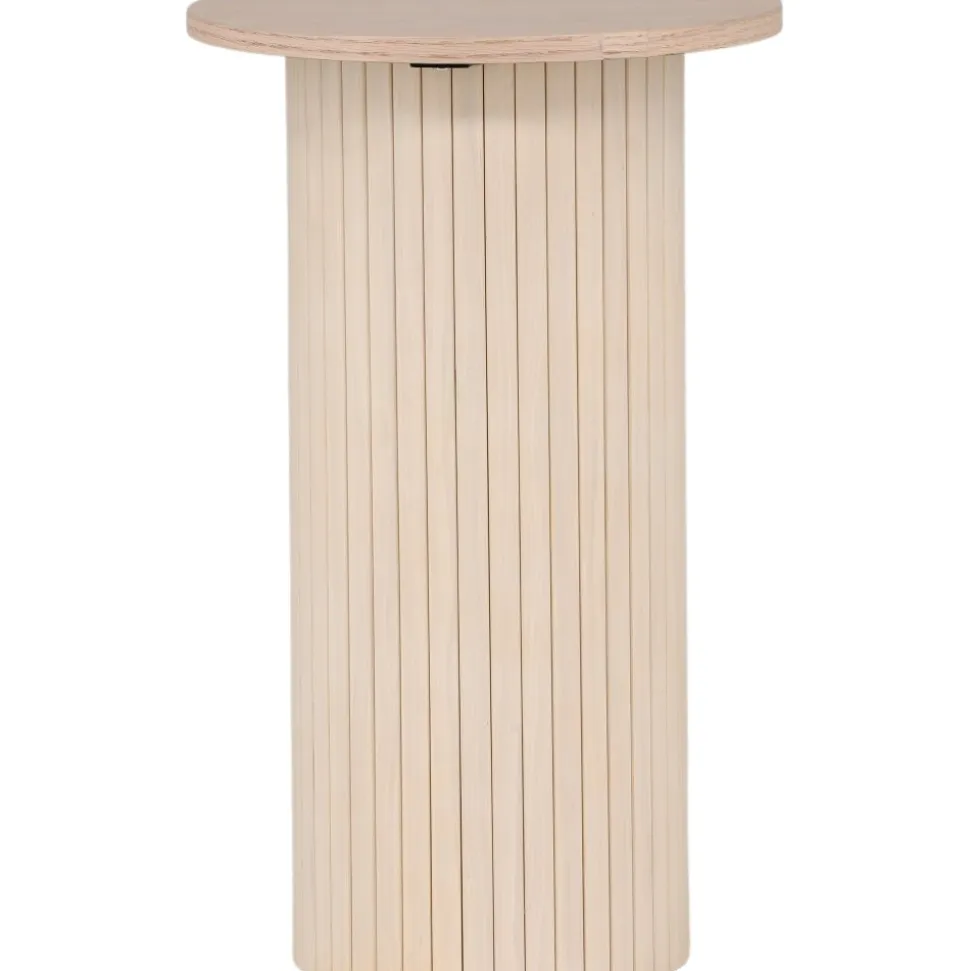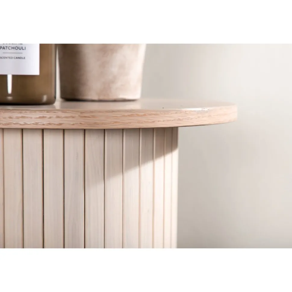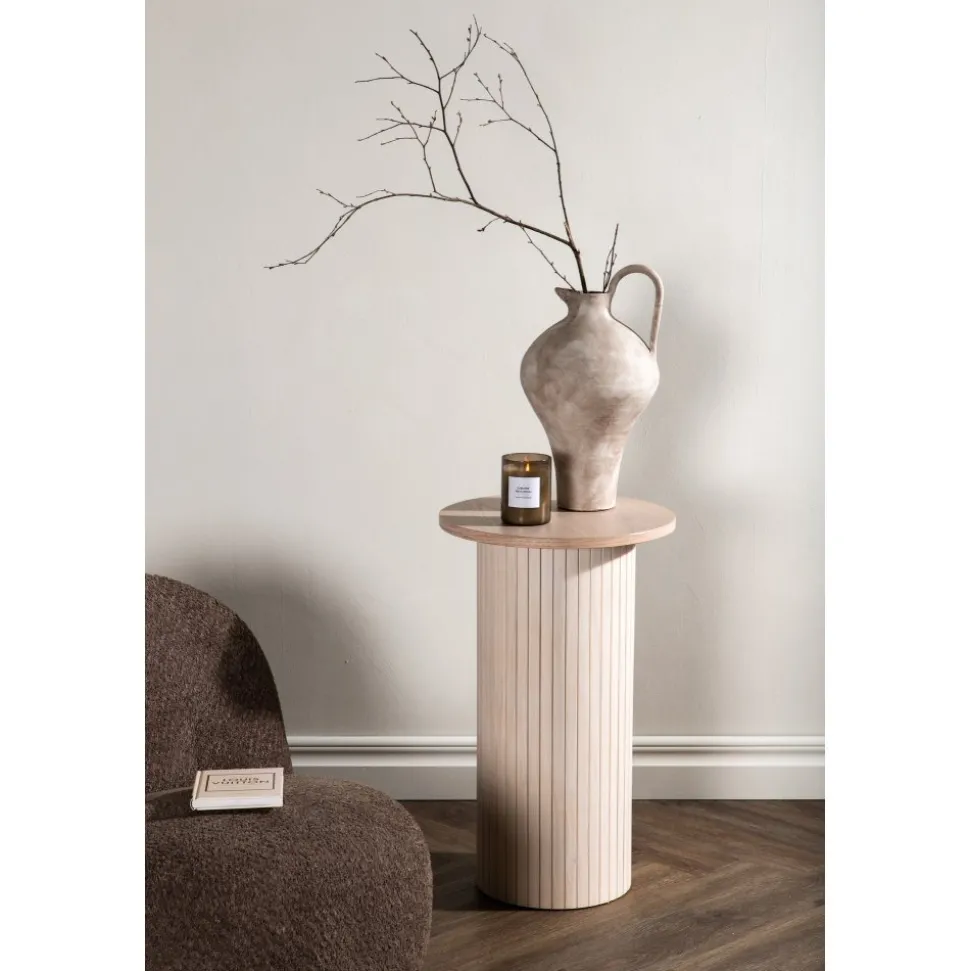 Stilrent som är lika smart som iögonfallande med sin trendsäkra, skandinaviska design och många användningsområden. Det här läckra sidobordet är genomgående tillverkat i MDF med fanér i en vittvättad finish. Bordsskivan är tunn i en rund utformning och stommen är robust med cylinderformat ben i ribbad design. Den genomtänkta helheten med mjuka nordiska former skapar en varm och modern känsla till rummet. Använd som sidobord, avlastningsyta eller piedestal – bara fantasin sätter gränser!