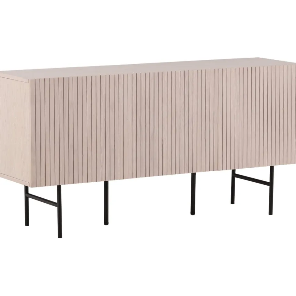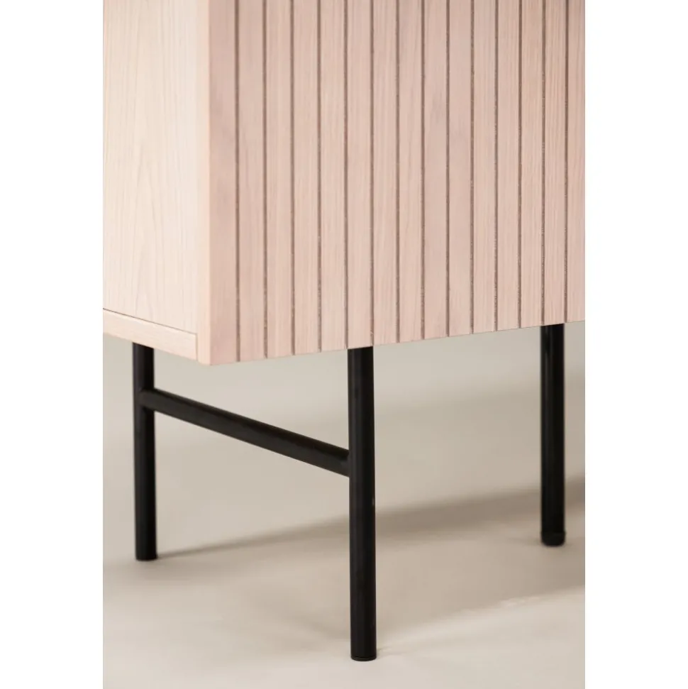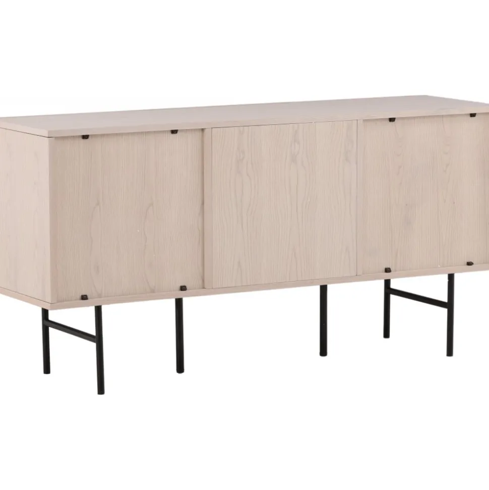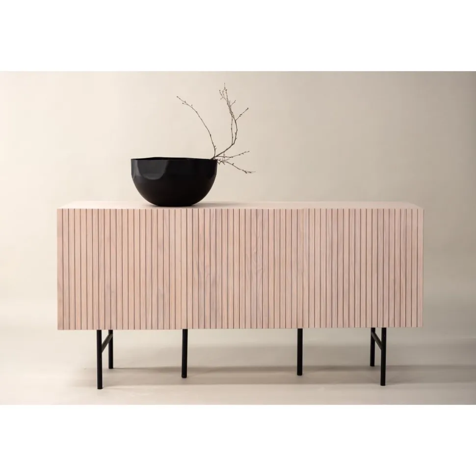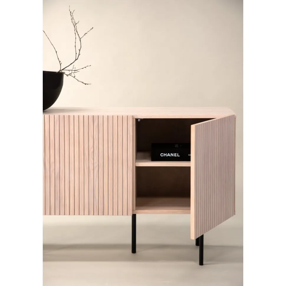 Skänk i skandinavisk design med stilsäker utformning. Den här skänken har tre luckor i ribbad design med två hyllplan som möjliggör dold förvaring. Den är tillverkat i vitputsad faner och lyfts upp av smala ben i svart stål. Använd som skänk med vackra dekorationer och ljusstakar på eller som tv-bänk i vardagsrummet. Här får du en möbel som är lika snygg som smart.