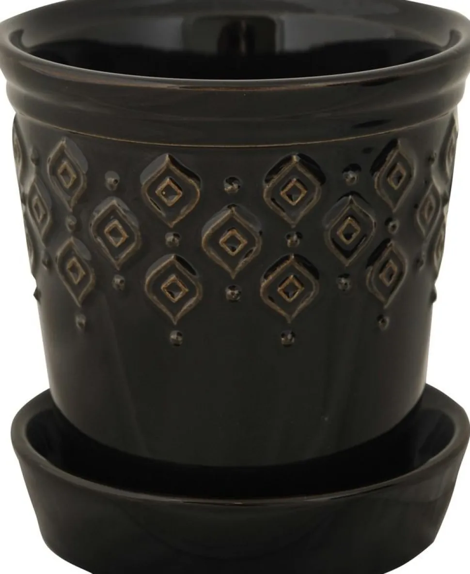 Blomkruka i glazed svart keramik med vattenfat.
