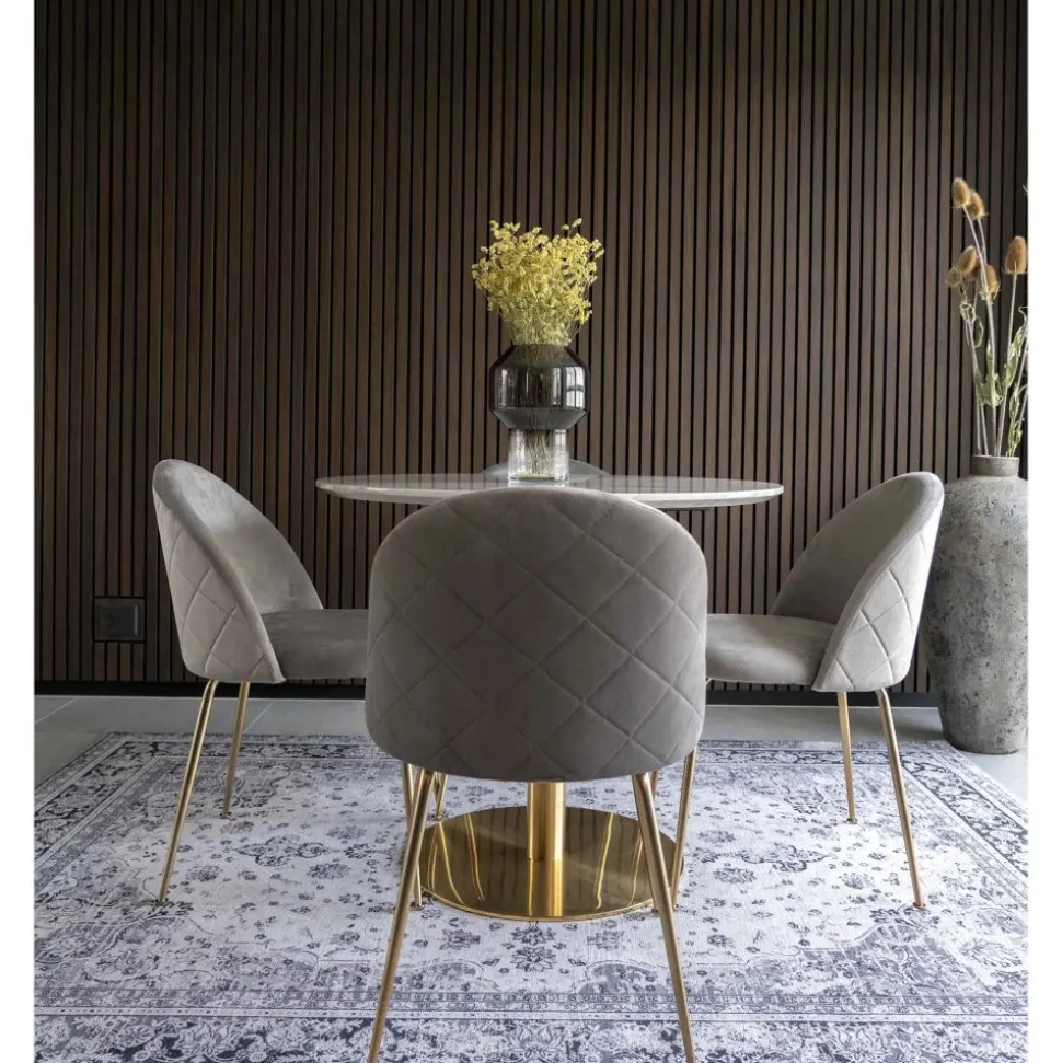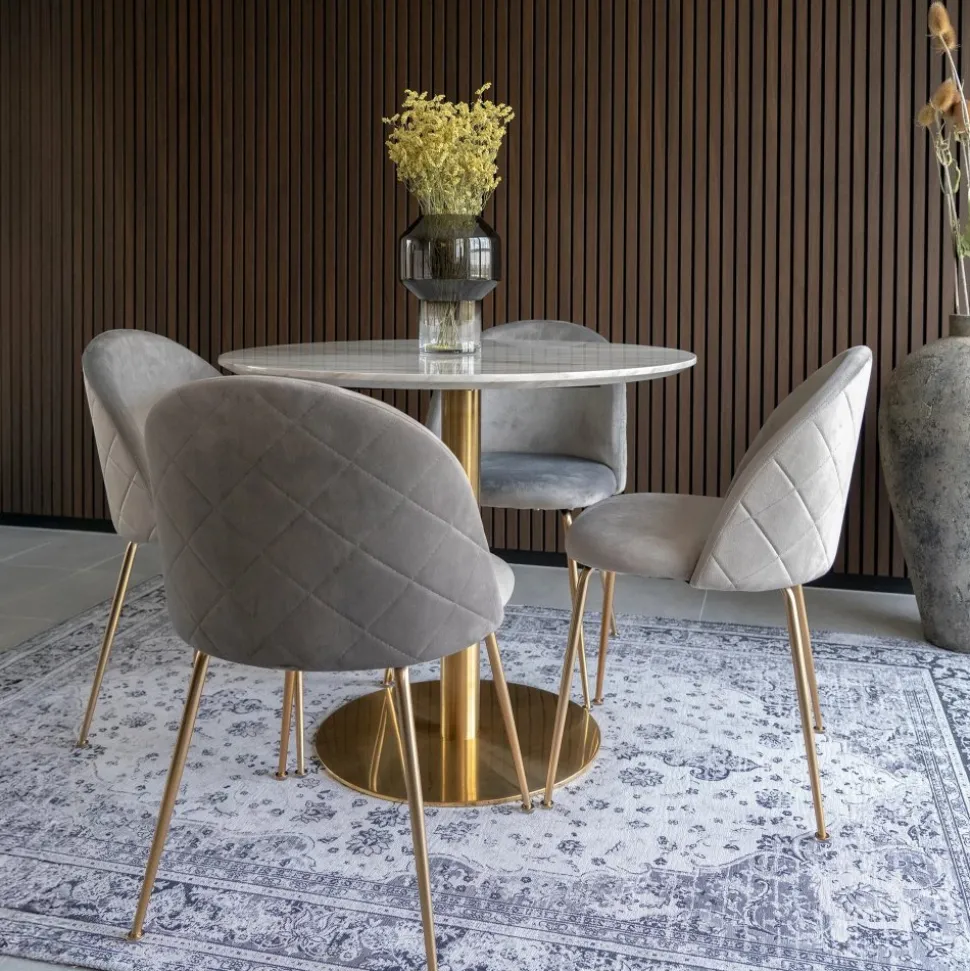 Matgrupp bestående av Bolzano matbord i vitt med guldfärgat underrede och 4 st Geneve matstolar i grått sammetstyg och guldfärgade ben. Levereras omonterad.