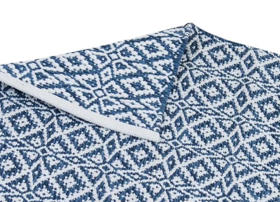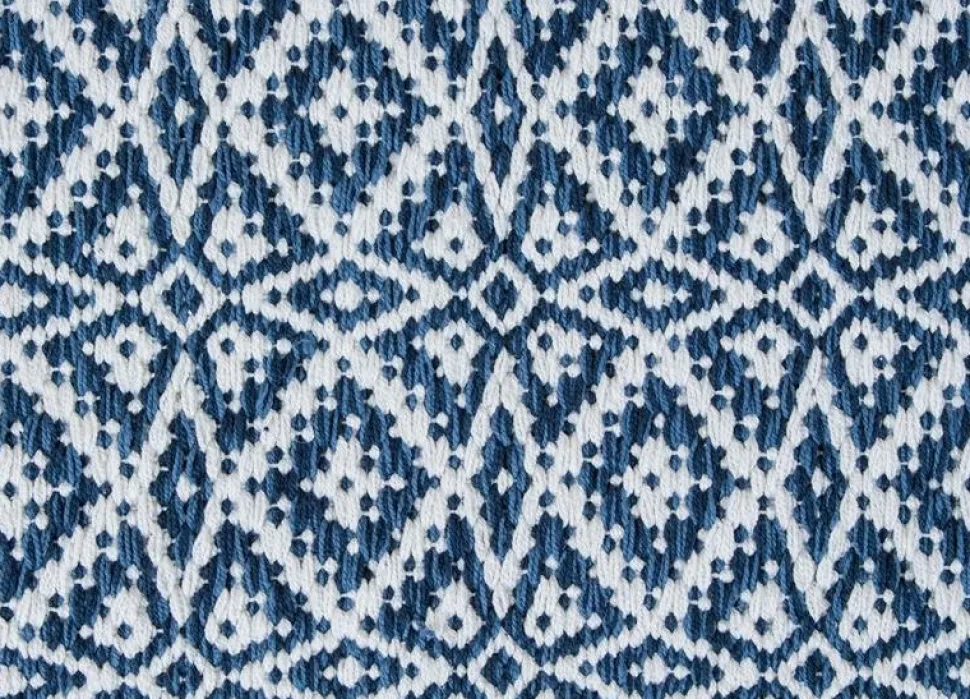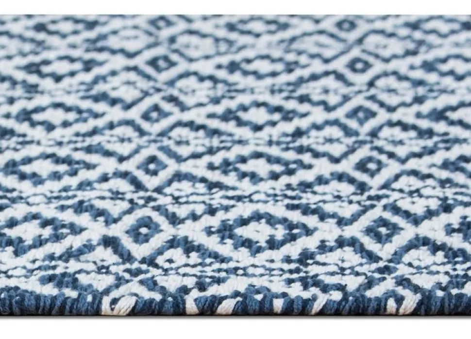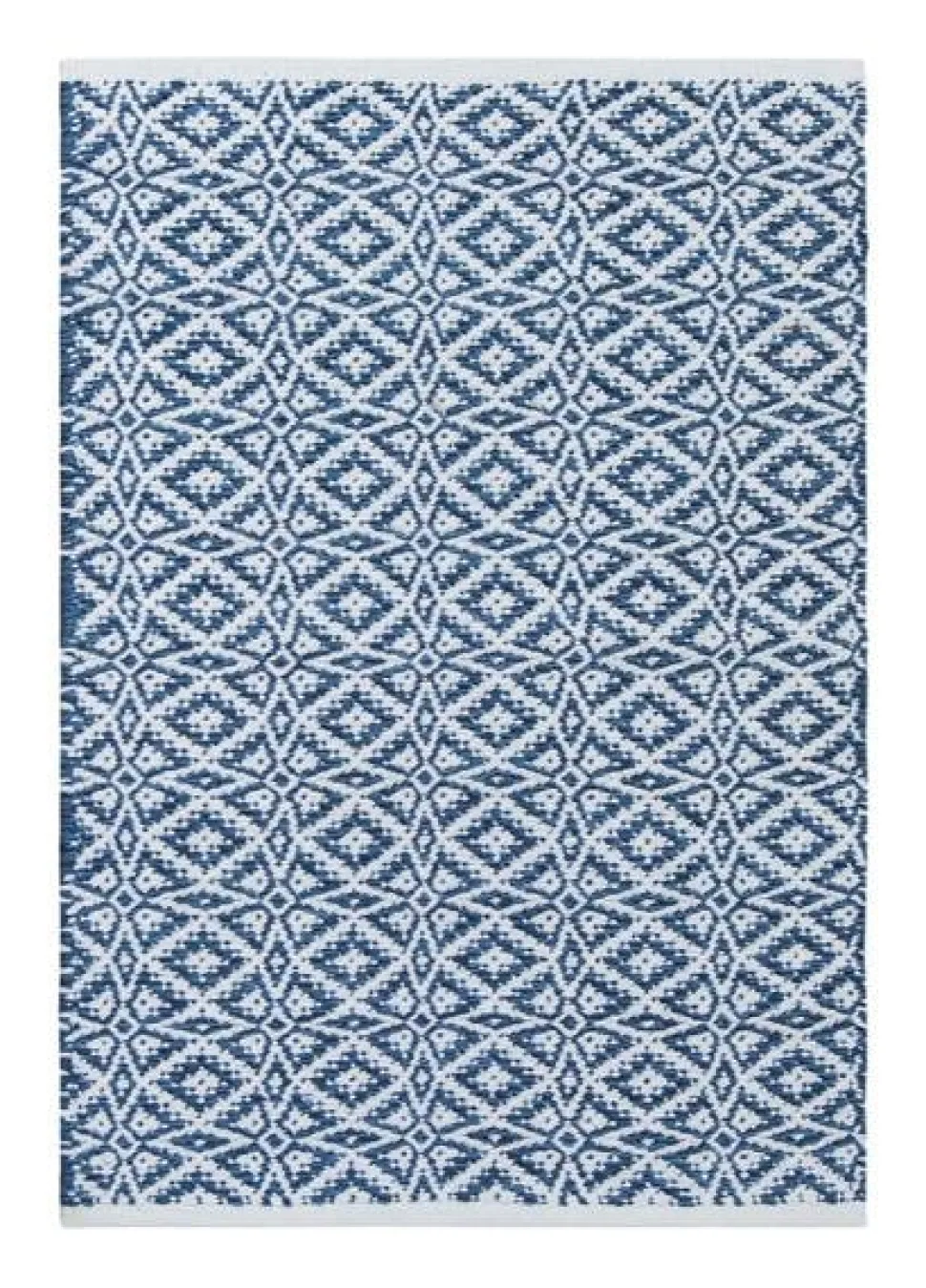 Davina garnmatta är vävd i 100% bomull och har ett mönster i vita och blå toner. Davina är garnvävd vilket innebär att garnet färgas innan vävning. Eftersom mattan handvävs så kan mönster och färg variera något mellan varje exemplar vilket gör att alla unika.