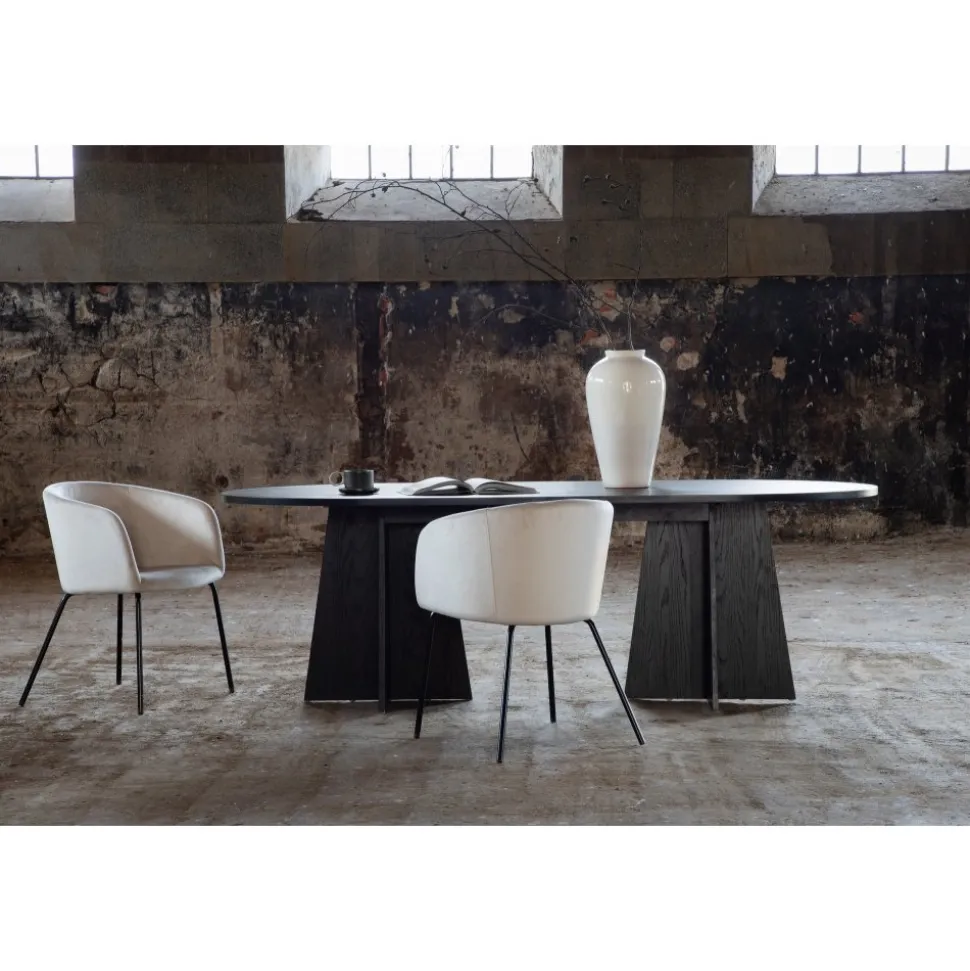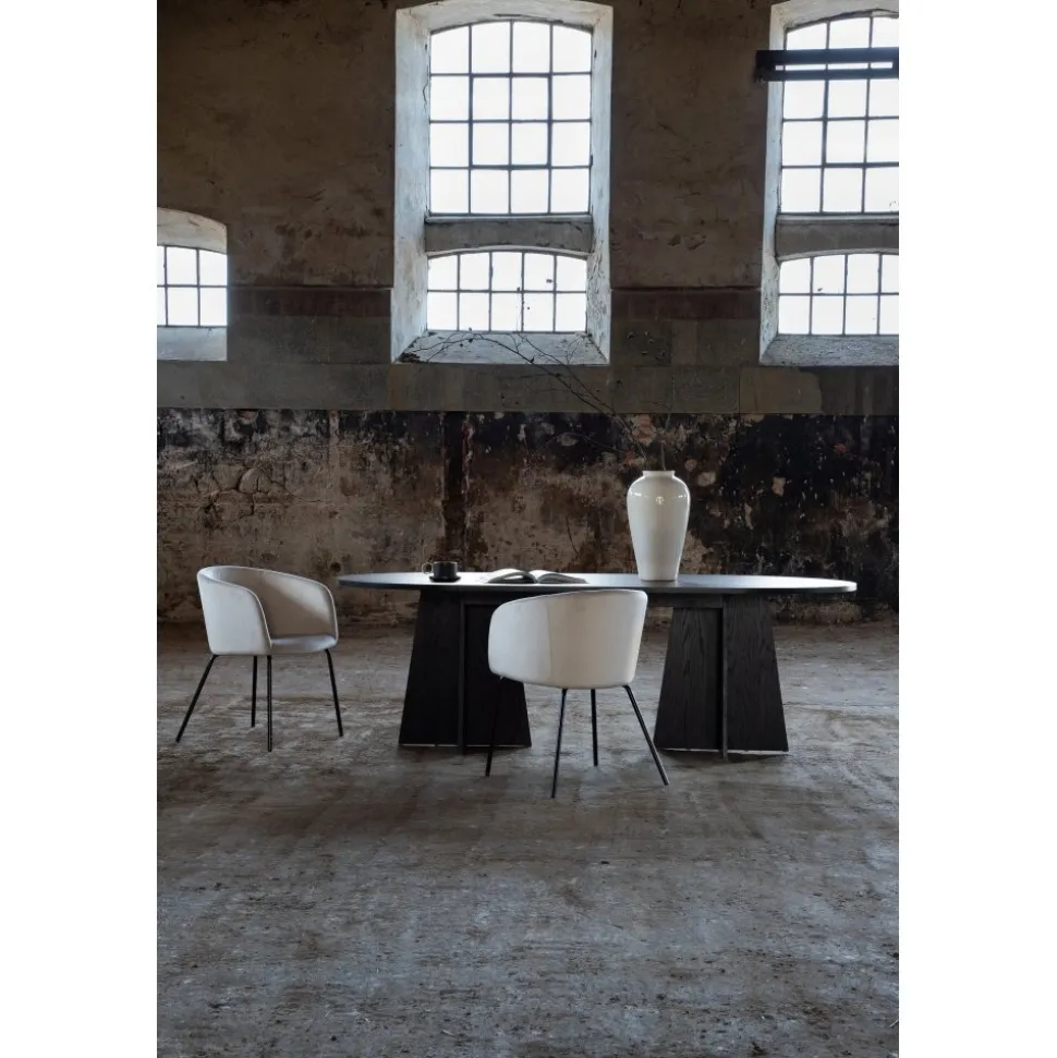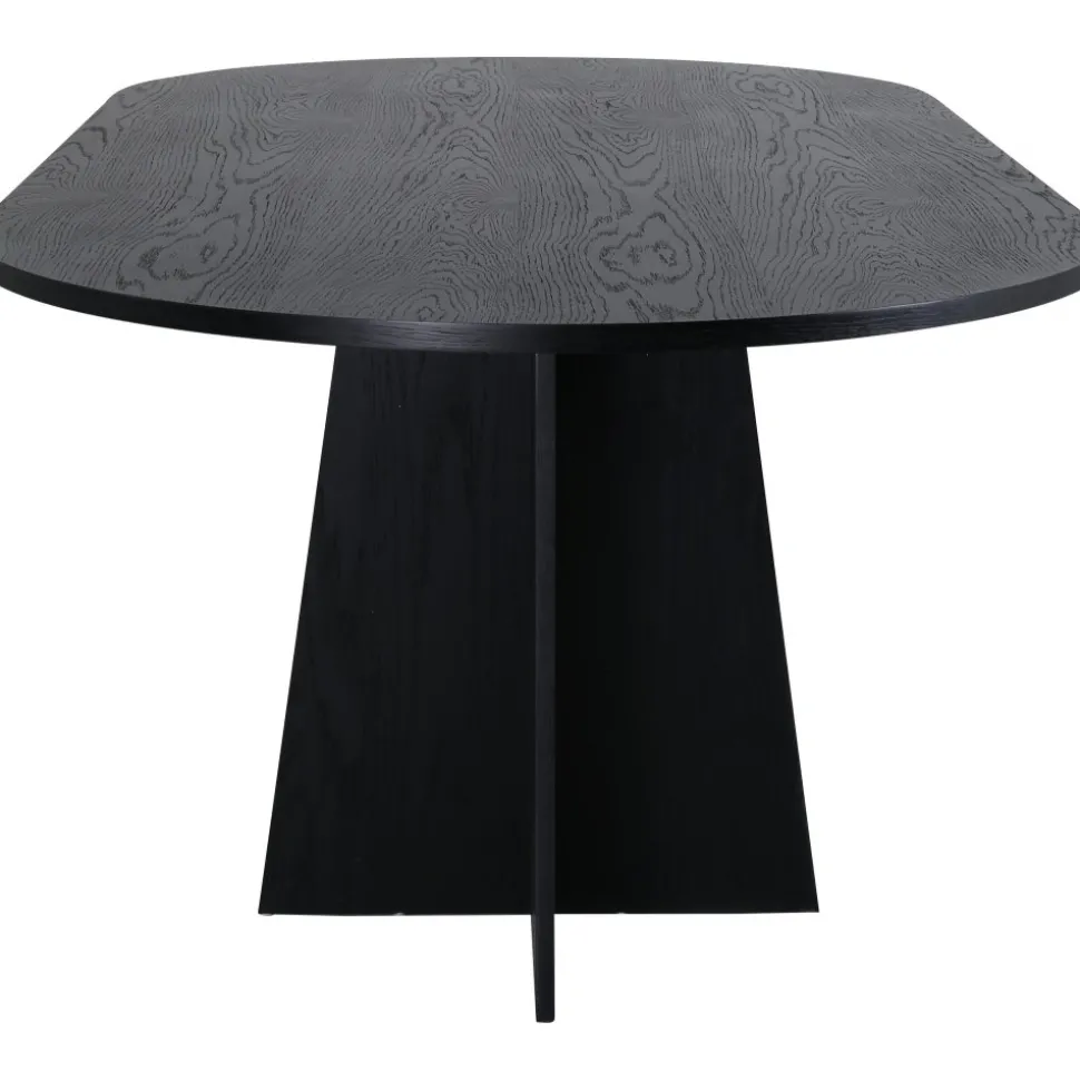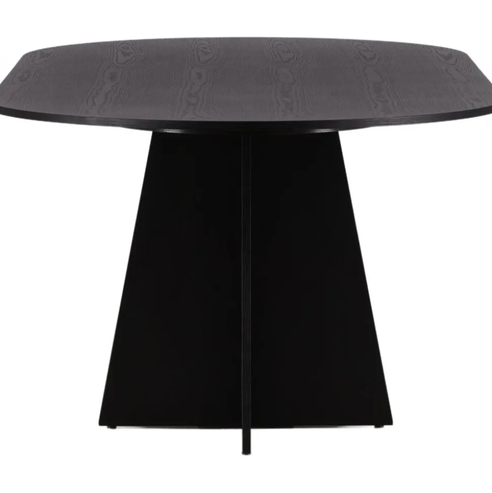 Matbord som har en unik design med en oval bordsskiva i svart MDF med fanéer och en säregen stomme med två konformade ben i öppen design. Den tunna bordsskivan skapar ett minimalistiskt intryck och är en smakfull kontrast till den mer robusta stommen. Matcha med ett par bekväma matstolar så får du en komplett matgrupp som står sig över tid.