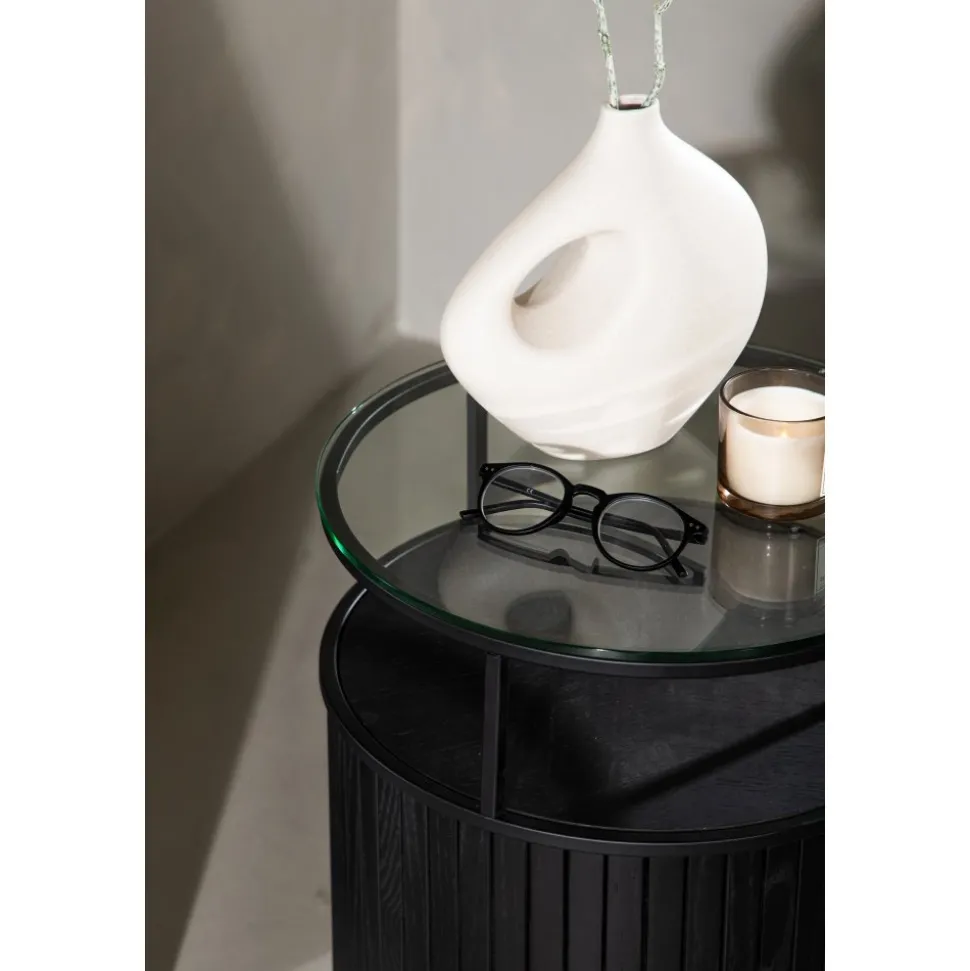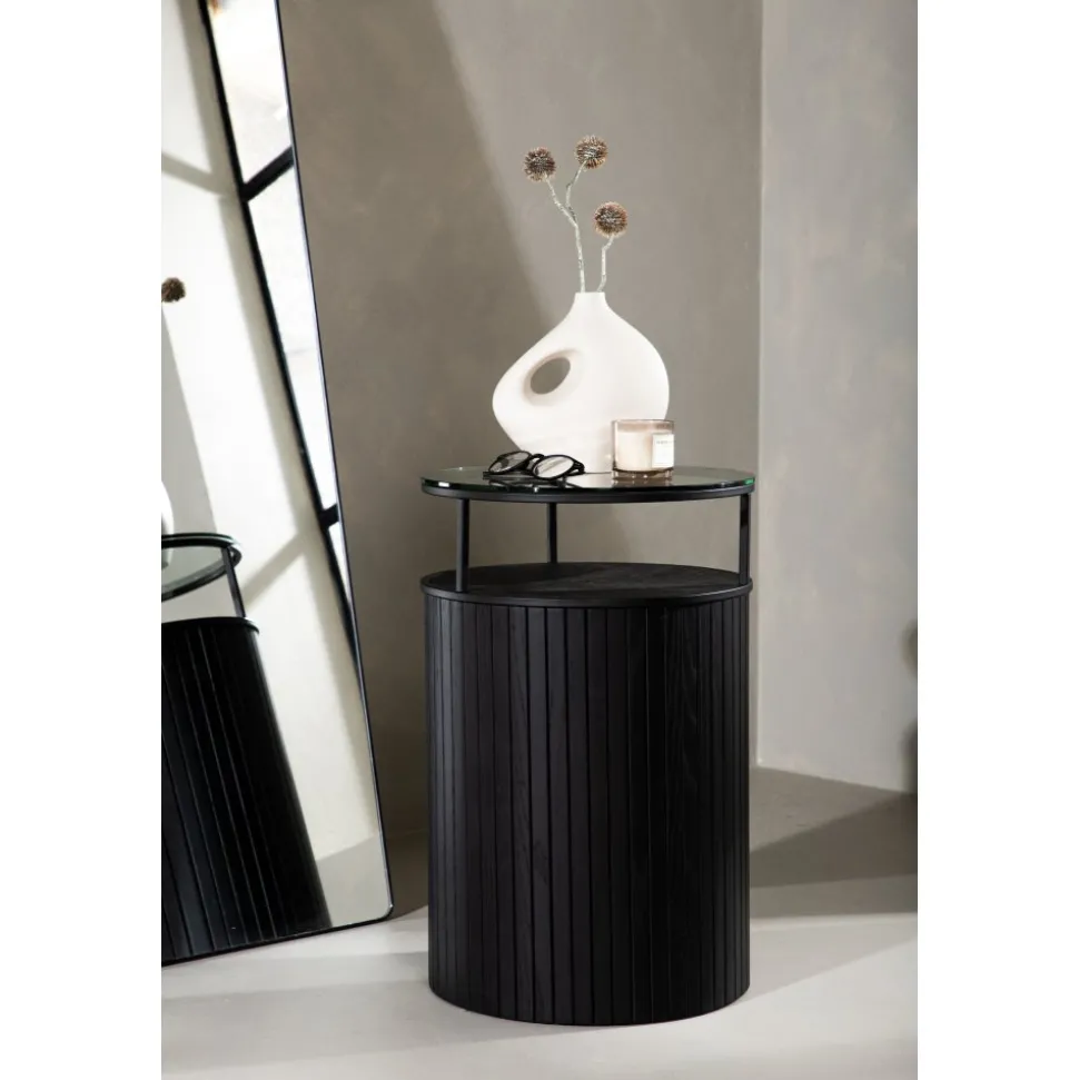 Sidobord som är lika iögonfallande som praktiskt med sin smarta storlek och modemedvetna design. Bordet har en robust, cylinderformad stomme i svart metall med en upplyft glasskiva som bordsyta. Lika användbar som avlastningsyta, piedestal eller . Pryd med vackra ljusstakar eller dekorationer och höj stilnivån i ditt hem till nästa nivå.