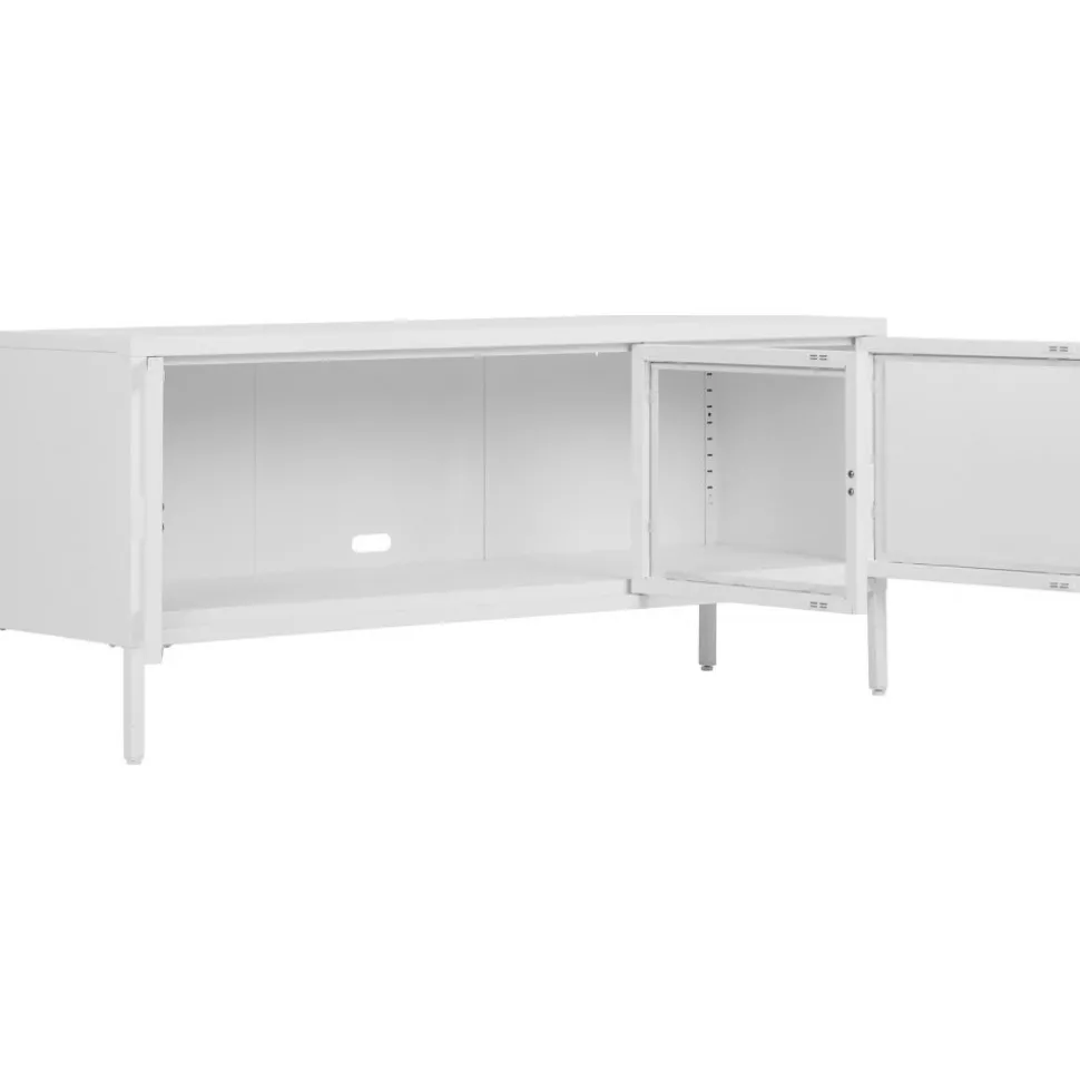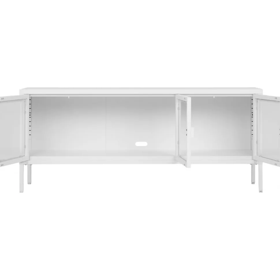 Mediabänk av stål med dörrar av glas.