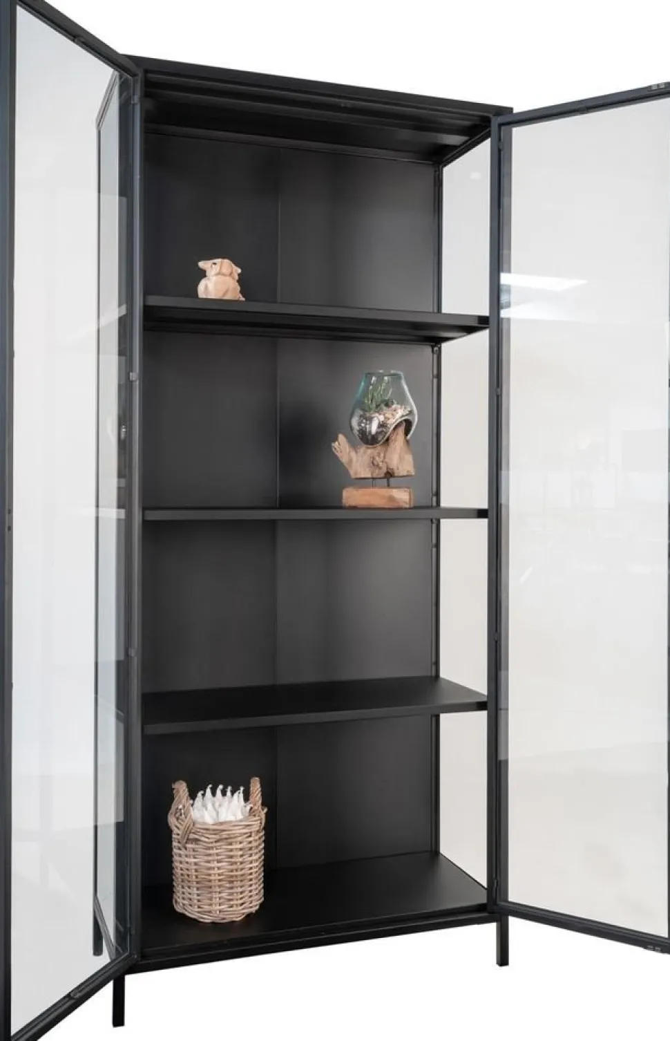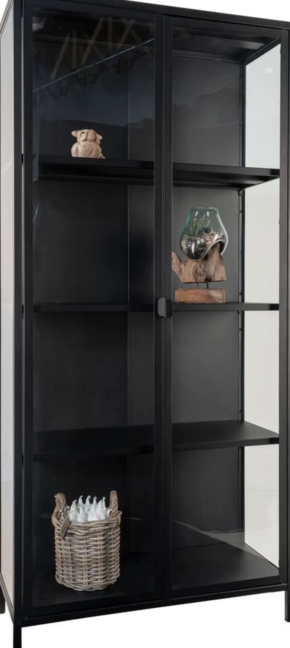 Vitrinskåp i svart med glasdörrar.