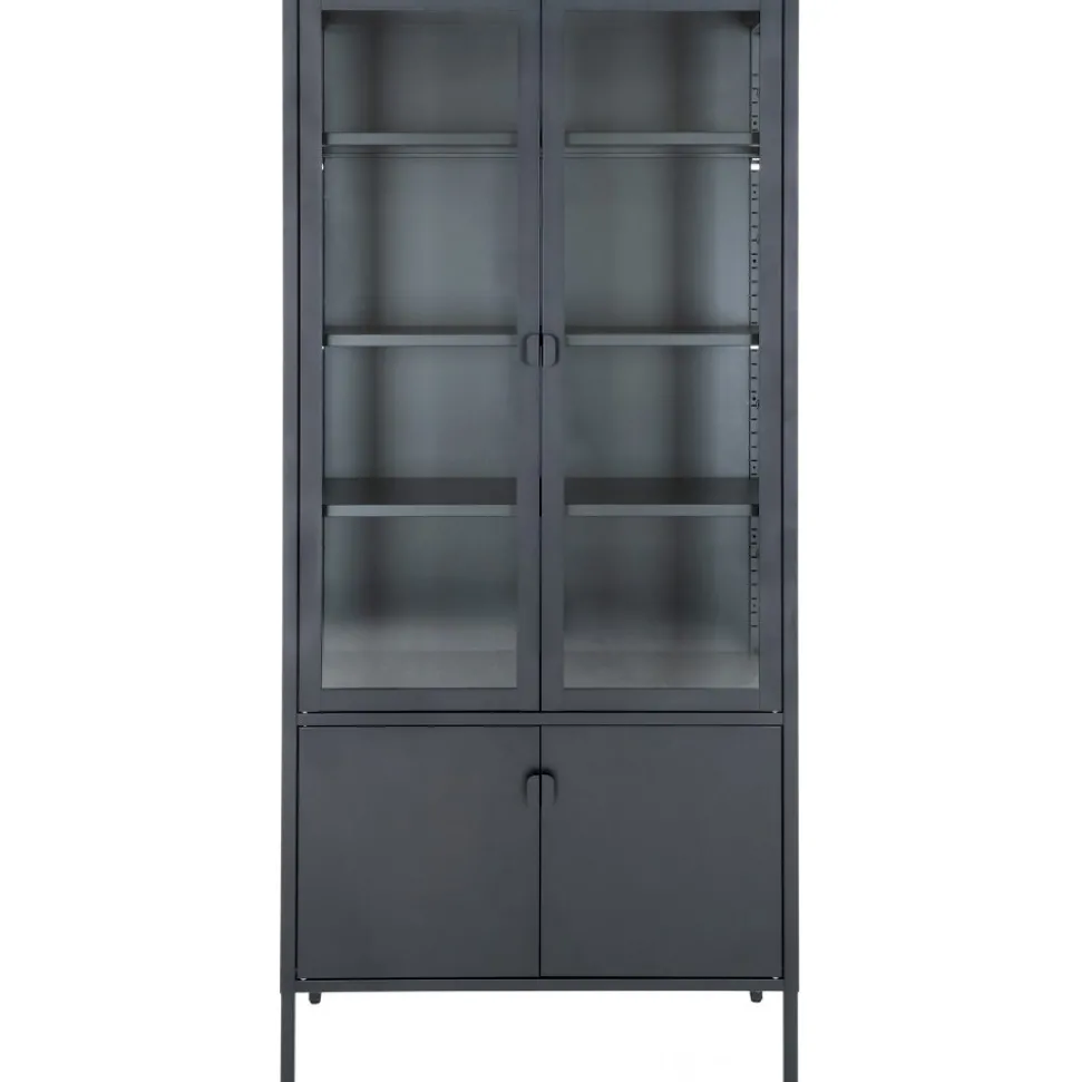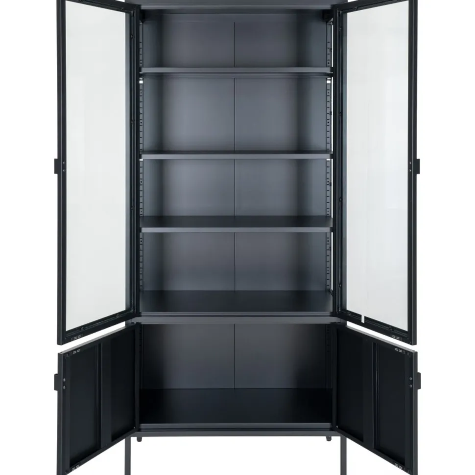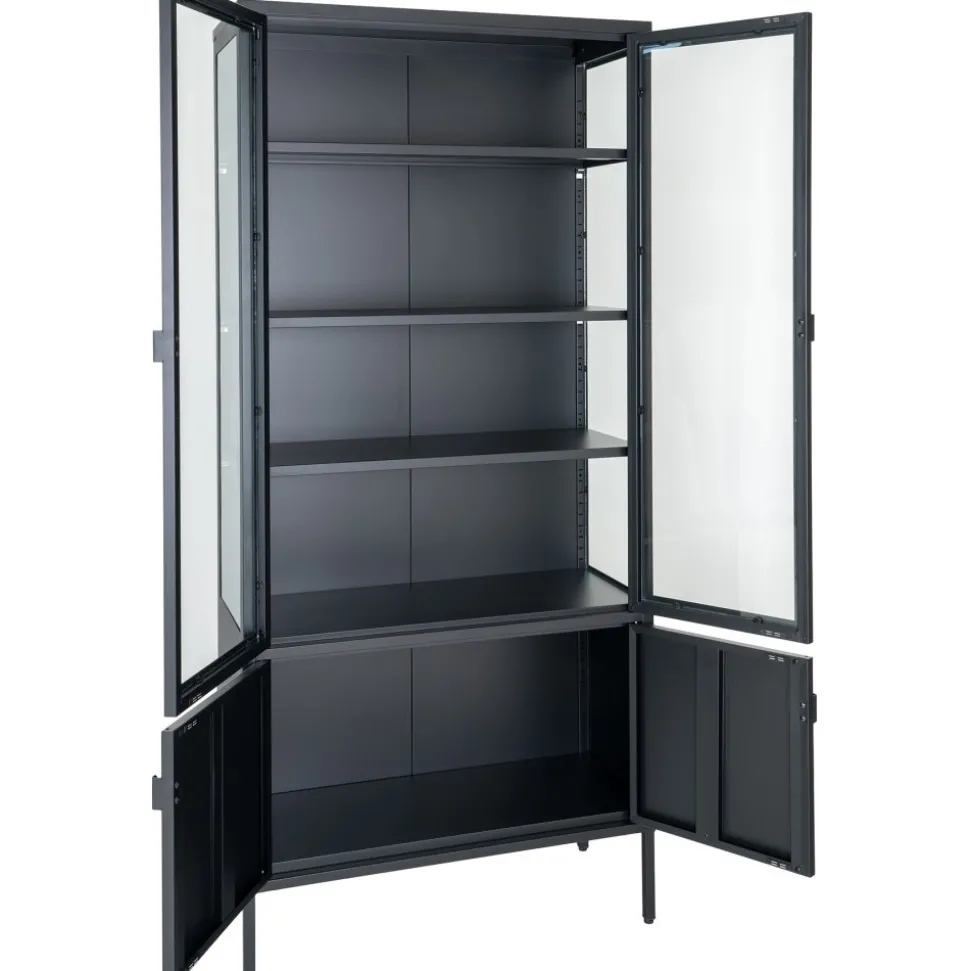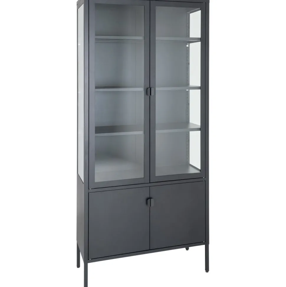 Vitrinskåp av stål med glasdörrar.