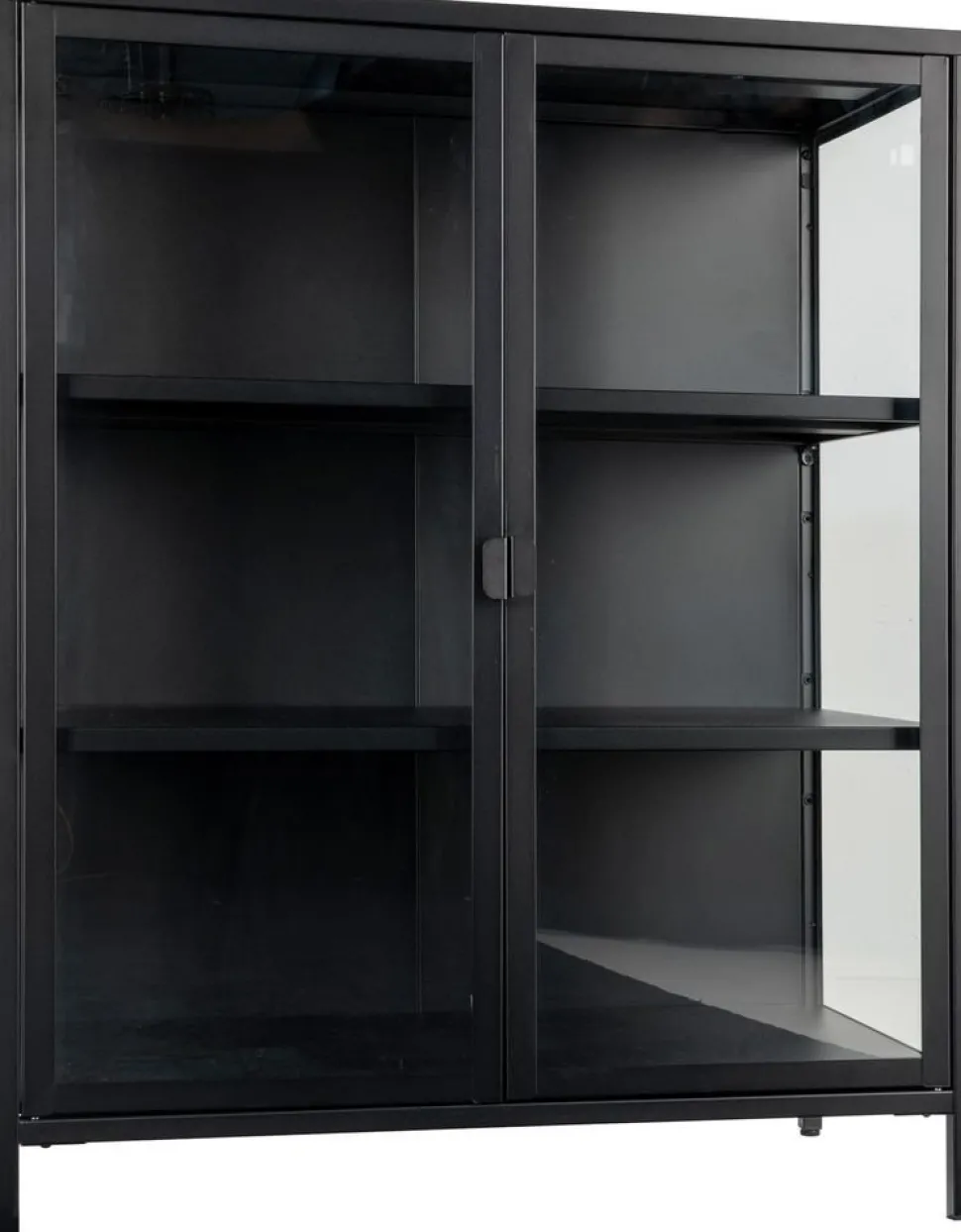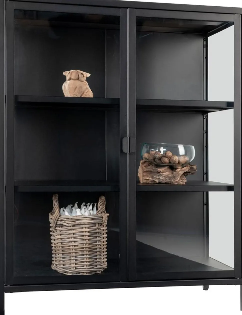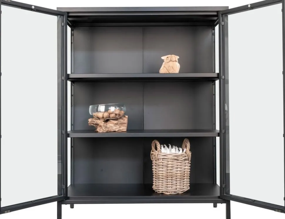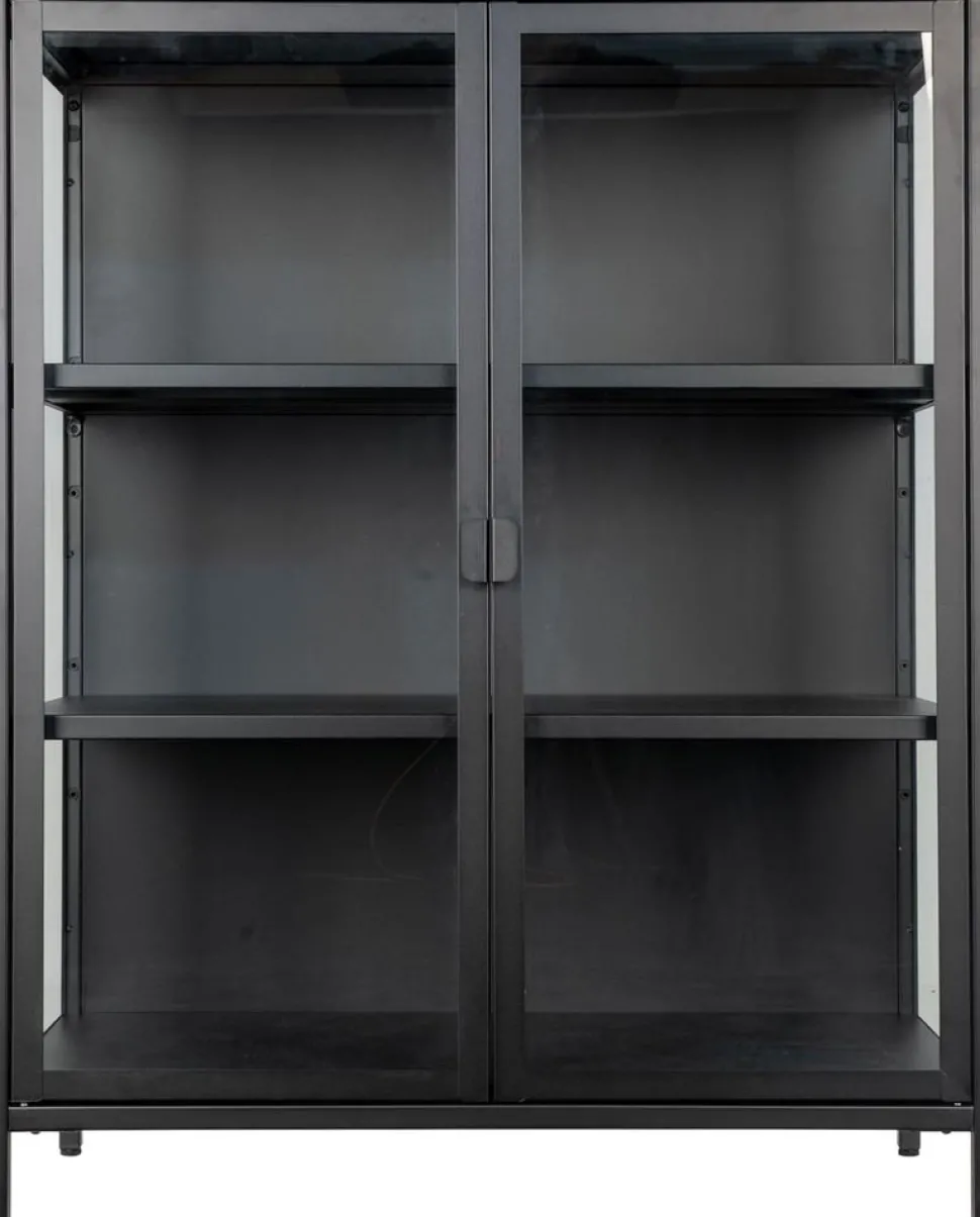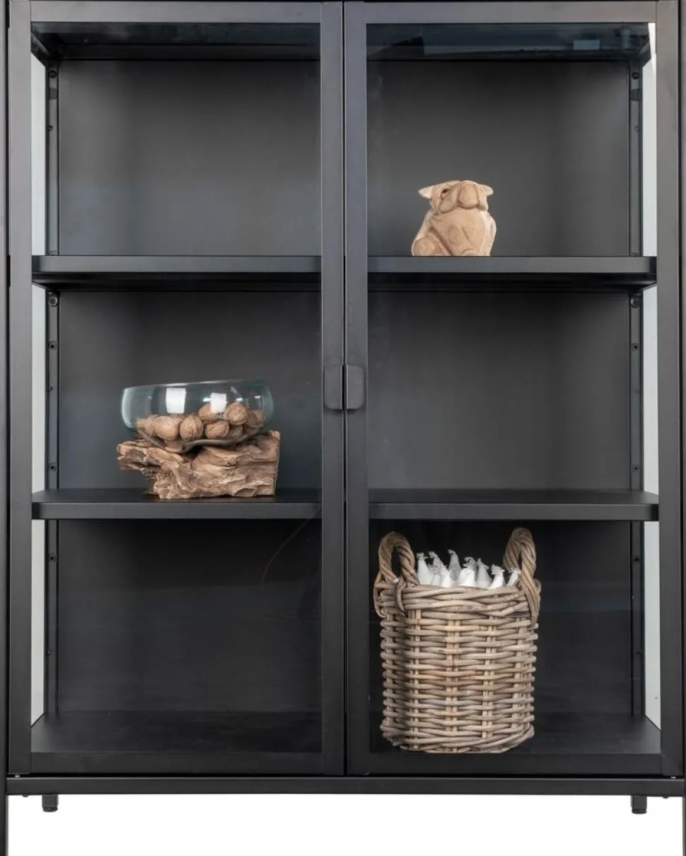 Vitrinskåp i svart med glasdörrar.