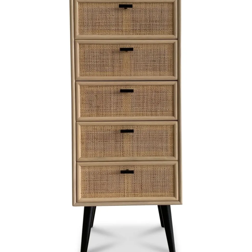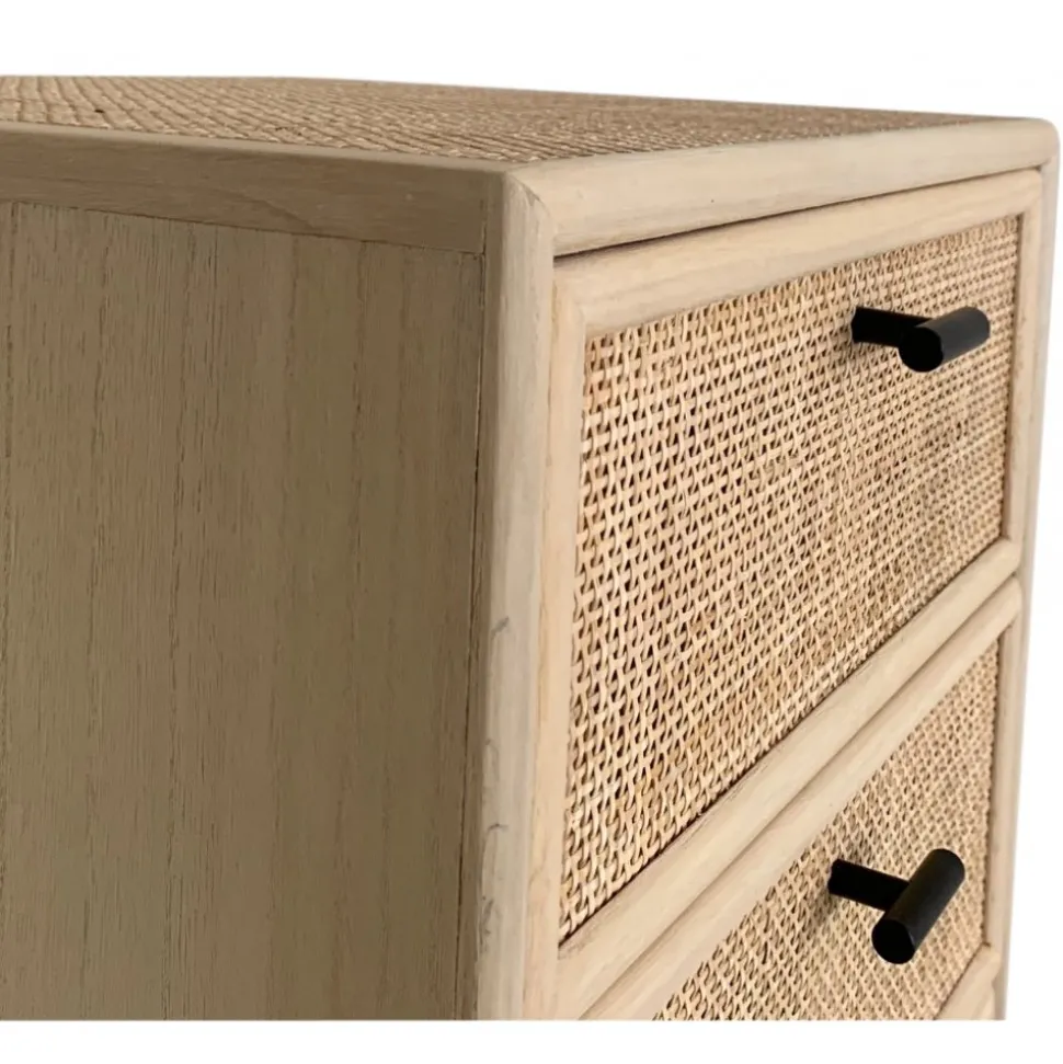 Lådorna är prydligt försedda med stiliga svarta handtag i metall, som inte bara tillför en modern touch, utan också gör det enkelt att öppna och stänga. Den handgjorda karaktären hos React-serien innebär att det är naturligt med lite råare detaljer i både träet och rottingen. Ytorna är inte helt släta, och det kan förekomma färgskiftningar som ger varje möbel sin egen personlighet och charm.