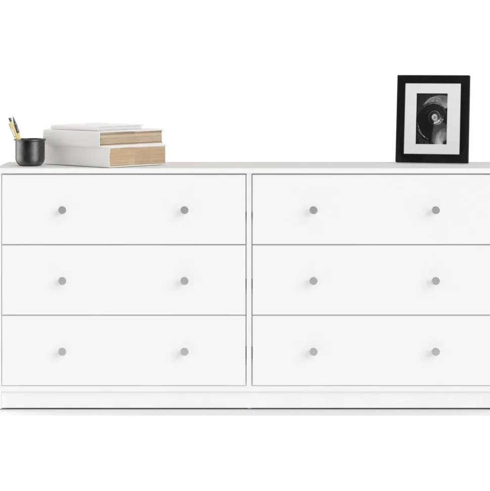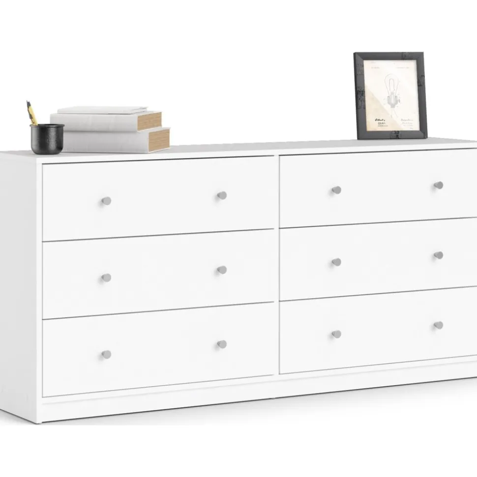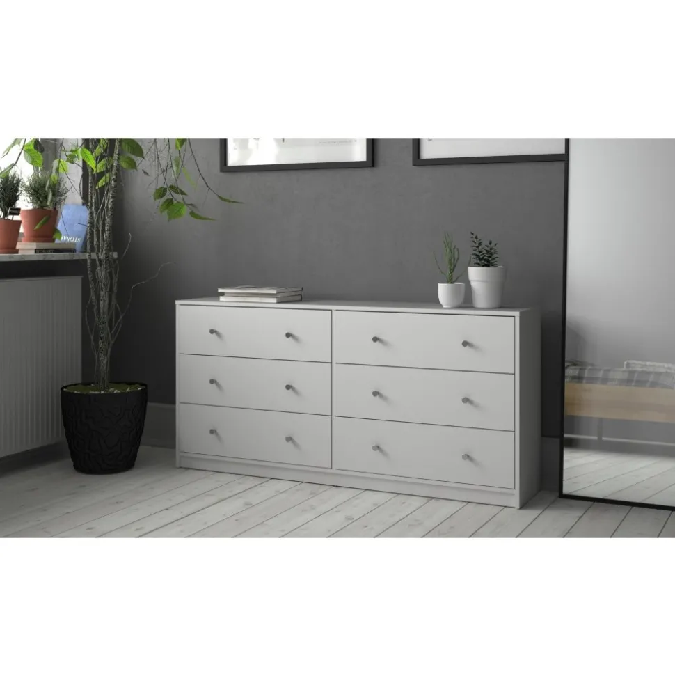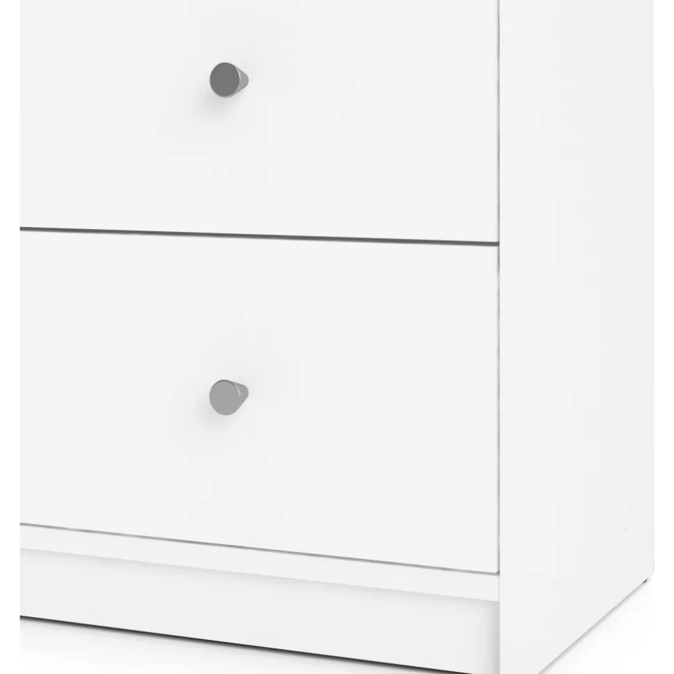 May vit är tillverkad av trä vilket ger en robust och hållbar struktur. För att öka hållbarheten och skydda ytan har byrån kantband av melamin, vilket bidrar till en slät och lättskött finish. Byrån är utrustad med praktiska handtag och ben i plast, vilket inte bara ger en modern touch, utan även gör den lätt att flytta och positionera. Den minimalistiska designen passar in i olika inredningsstilar och adderar en stilren känsla i rummet.