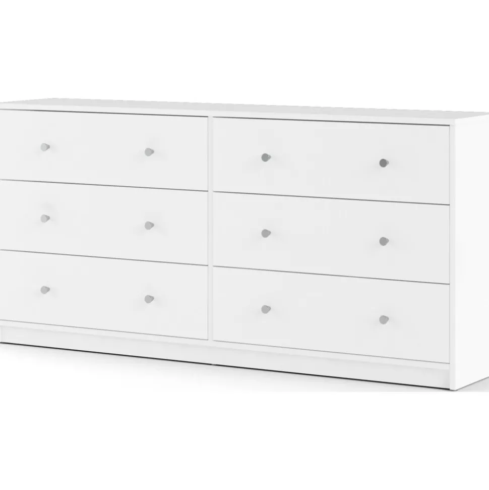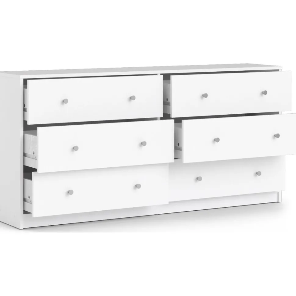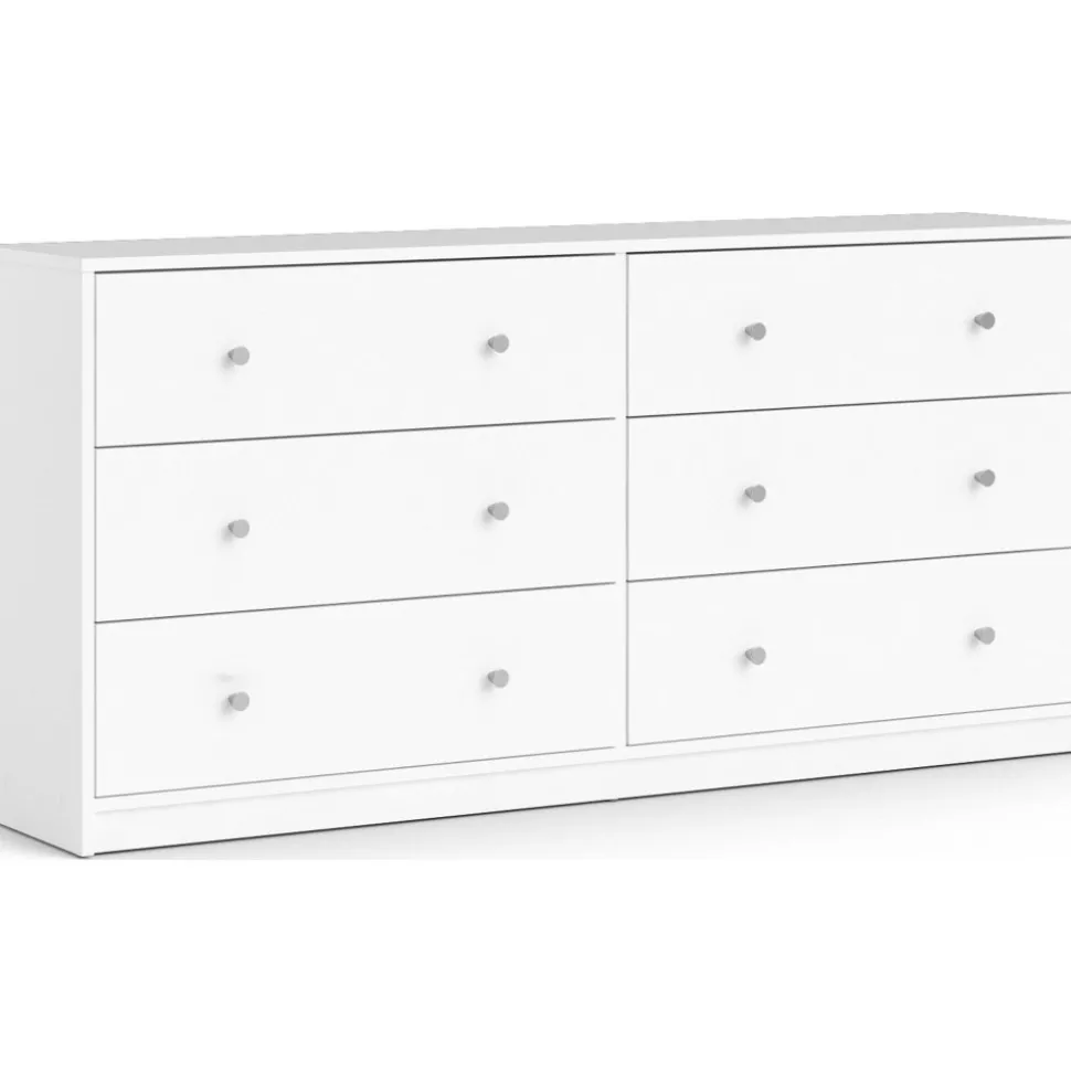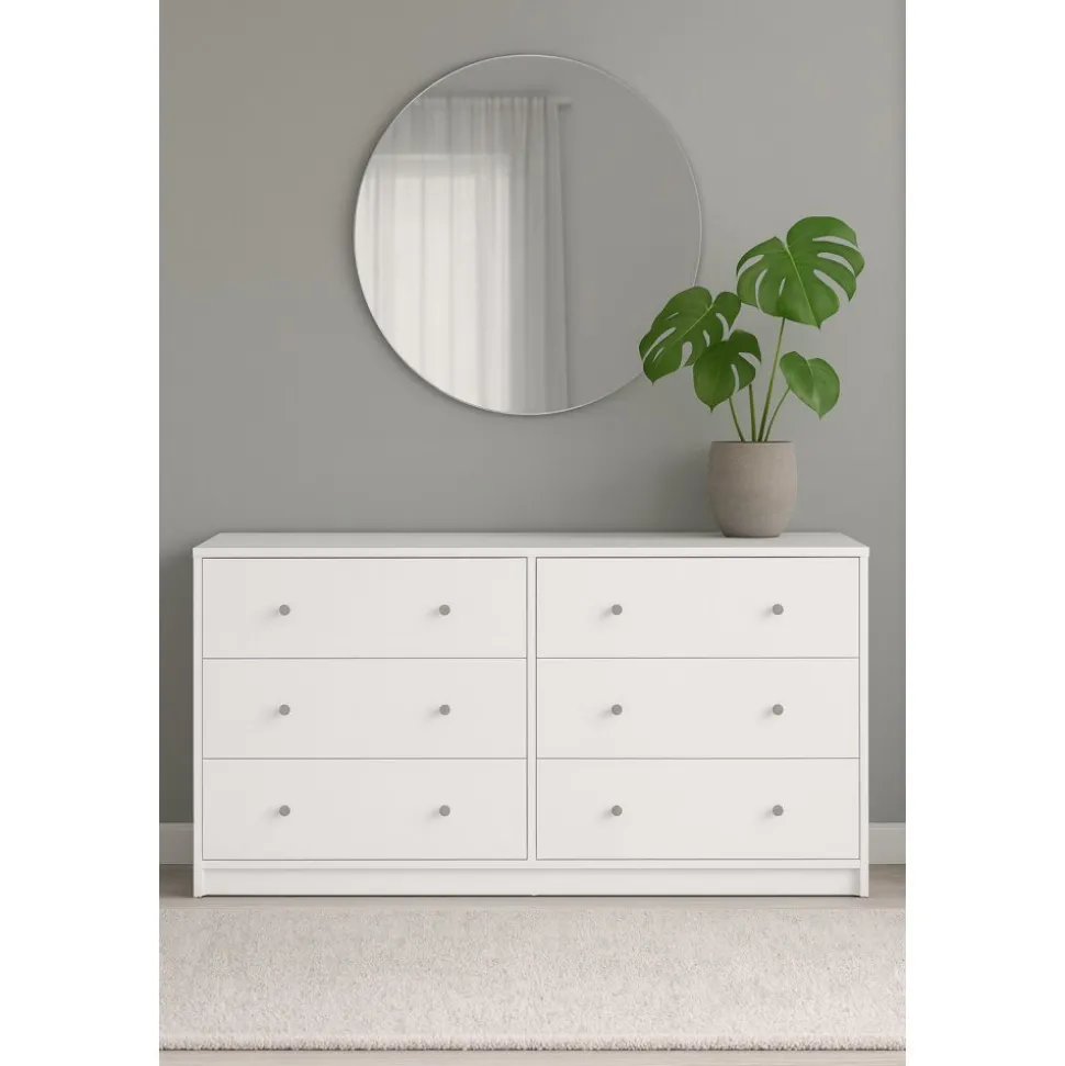 May vit är tillverkad av trä vilket ger en robust och hållbar struktur. För att öka hållbarheten och skydda ytan har byrån kantband av melamin, vilket bidrar till en slät och lättskött finish. Byrån är utrustad med praktiska handtag och ben i plast, vilket inte bara ger en modern touch, utan även gör den lätt att flytta och positionera. Den minimalistiska designen passar in i olika inredningsstilar och adderar en stilren känsla i rummet.