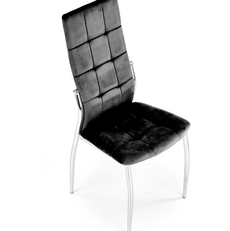 Matstol med underrede av kromat stål och klädsel av sammetstyg.