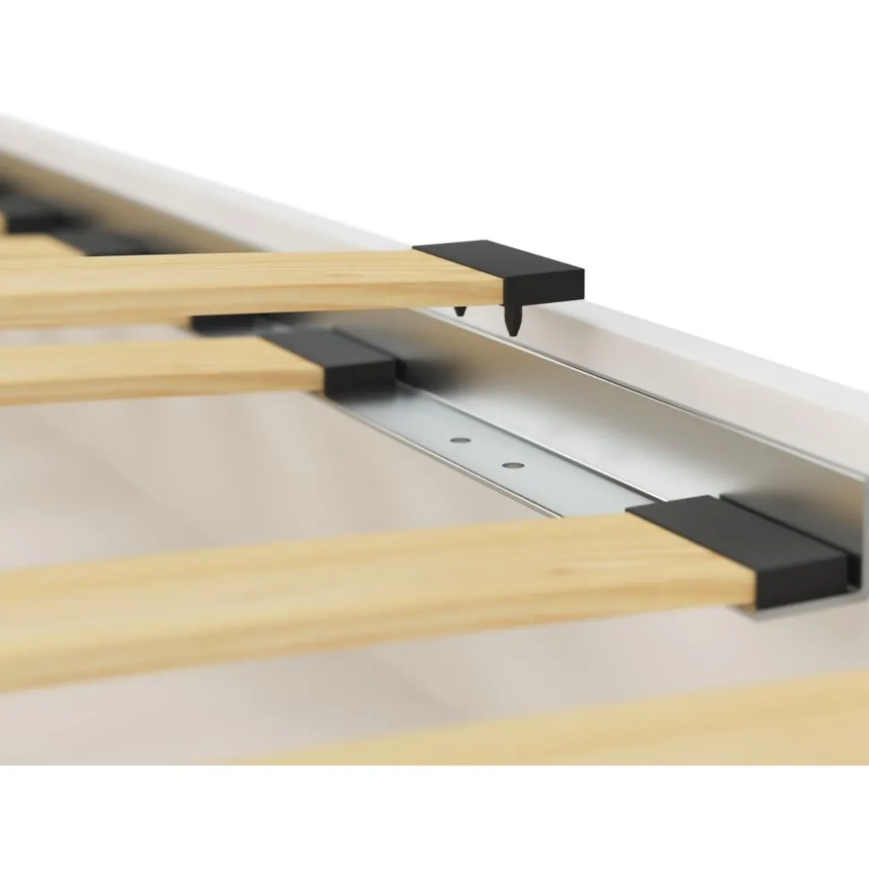 Barnsäng med hjulförsedd, utdragbar extrabädd under sängen. Skyddsbarriär och låda kan monteras på valbar sida. Monteras med klick-klack-system. Madrasser ingår till båda sovytorna.