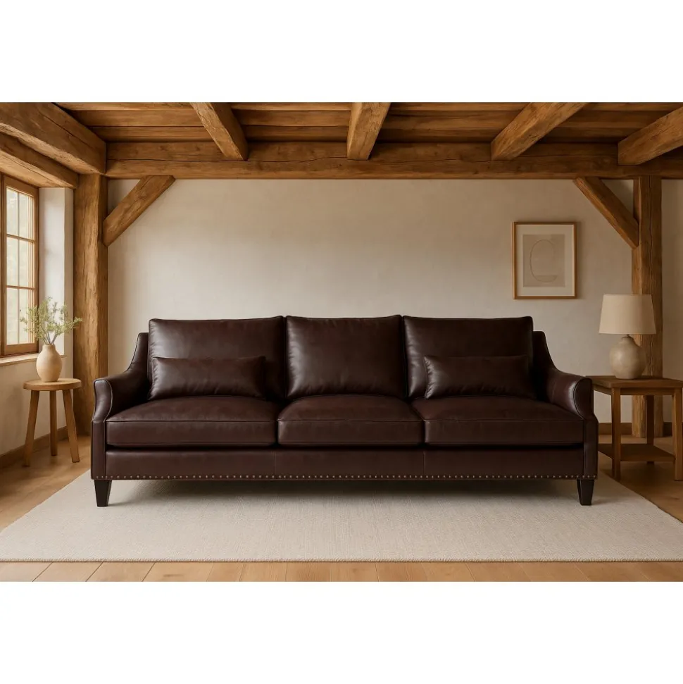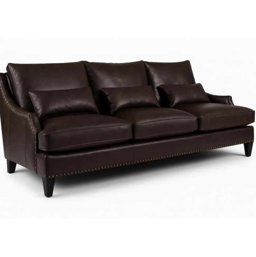 Elegant med svarta träben, stilfullt svängda armstöd och dekorativa nitar som pryder både framkant och armstöd. De mjuka, fylliga kuddarna bjuder in till avkoppling en perfekt soffa att sjunka ner i.