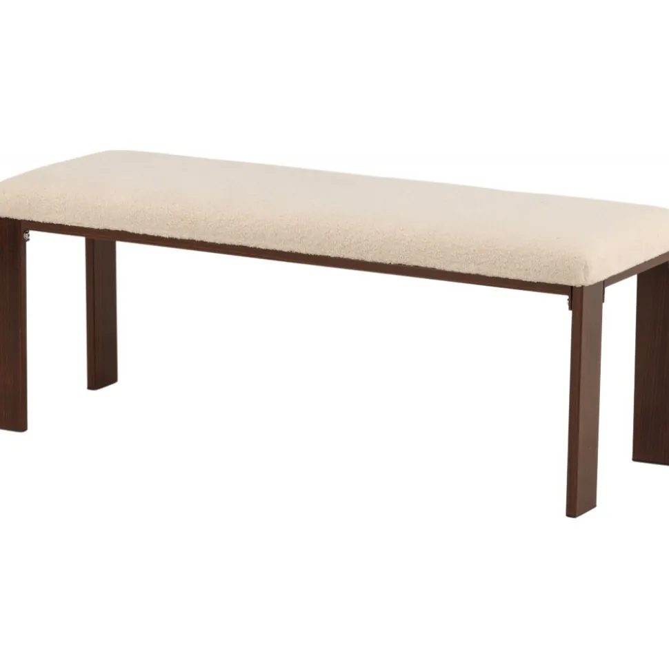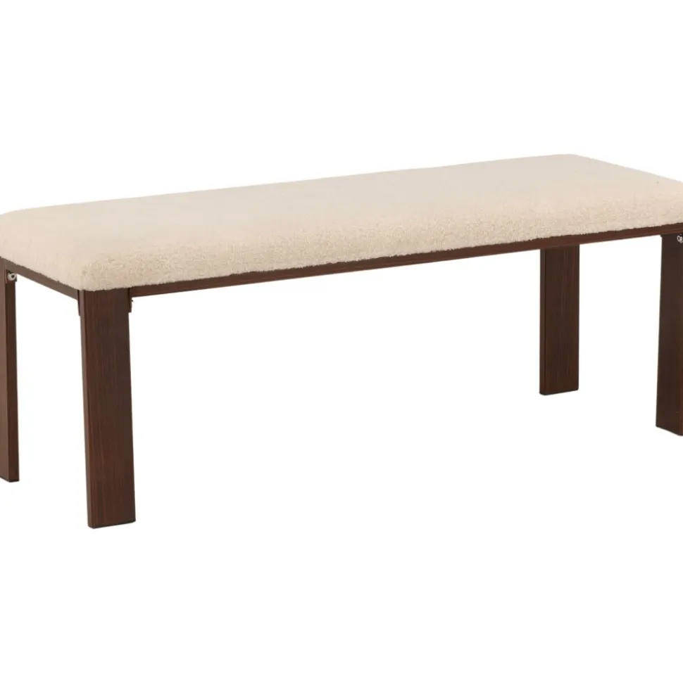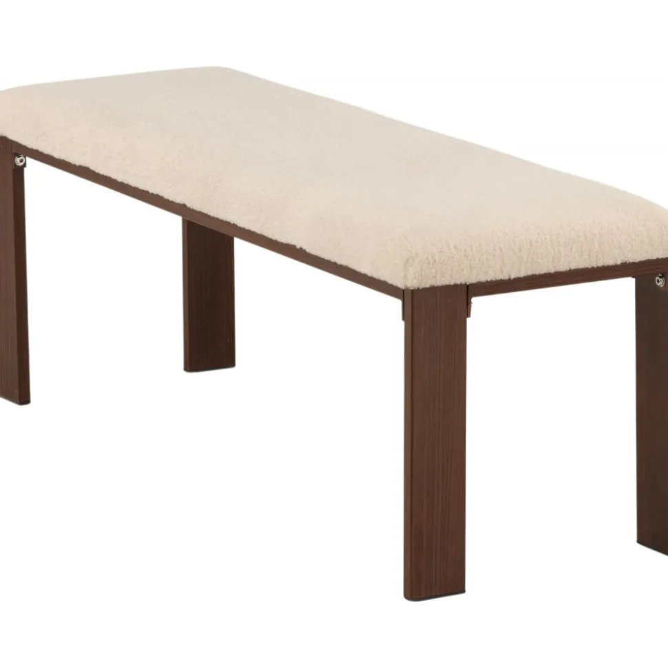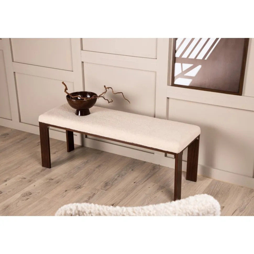 Bänk med rektangulär sits i mjukt fleecetyg med vit kulör och fyra ben i brunt valnötsfärgat trä. Den perfekta inredningsdetaljen till hallen eller vardagsrummet, som solitär stilikon eller för att skapa fler sittplatser i hemmet.