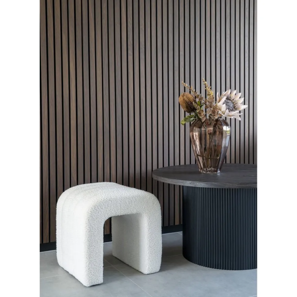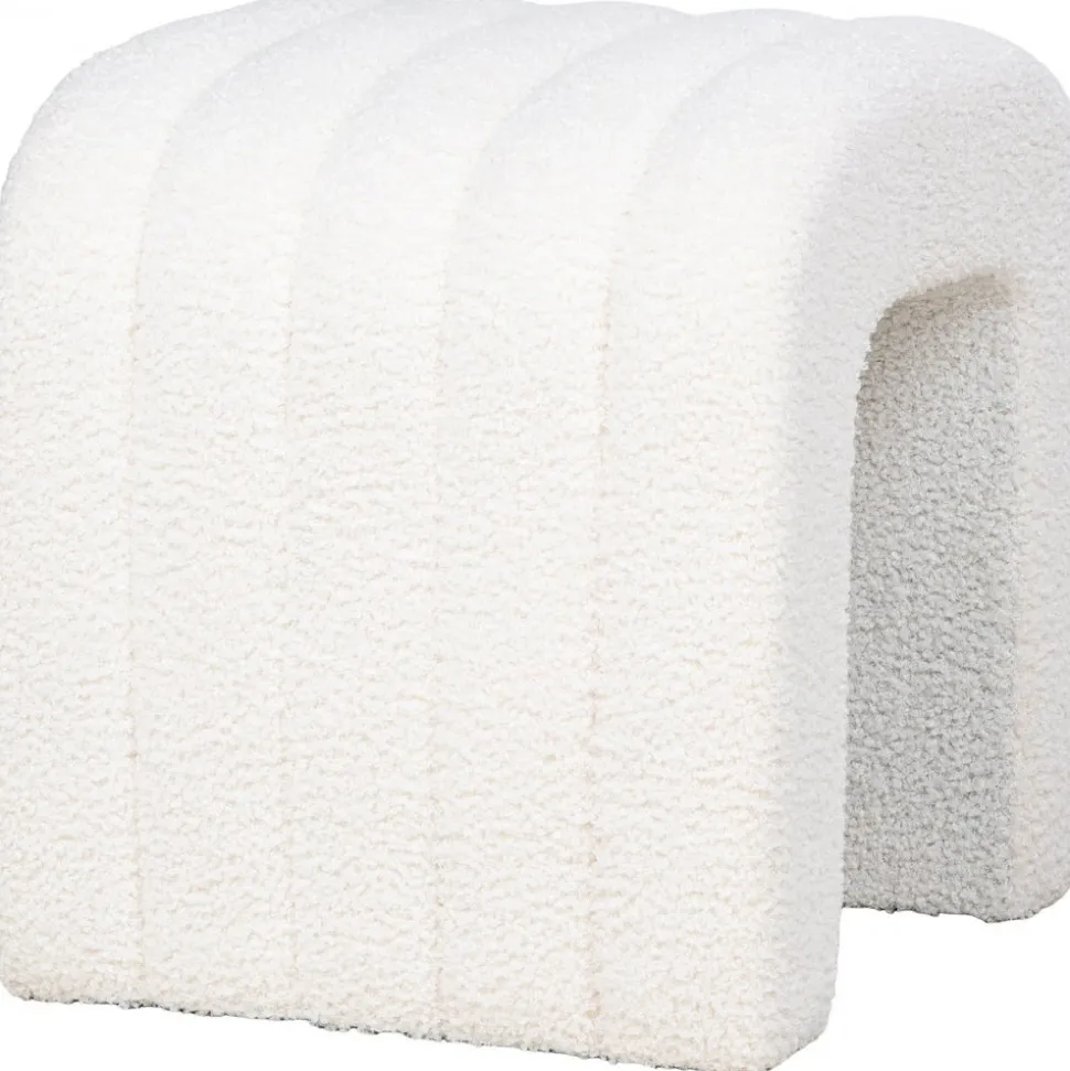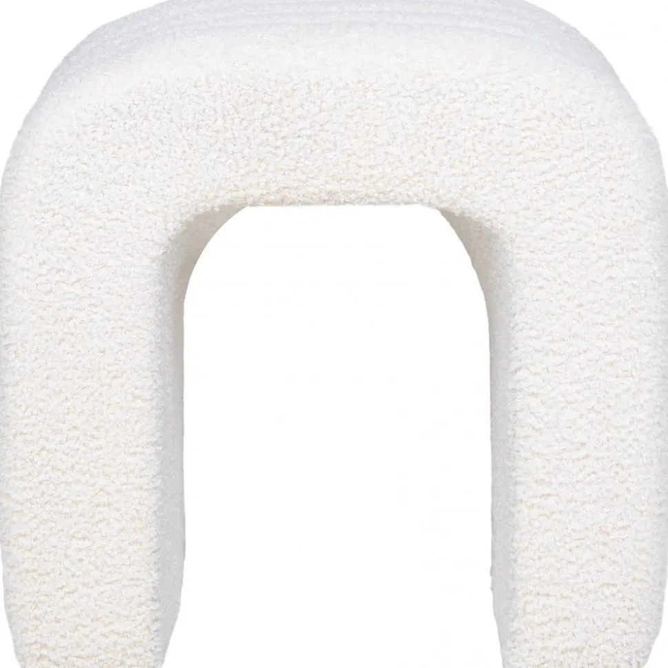 Sittpuff av MDF och furuträ med klädsel av bouclétyg. Levereras monterad.