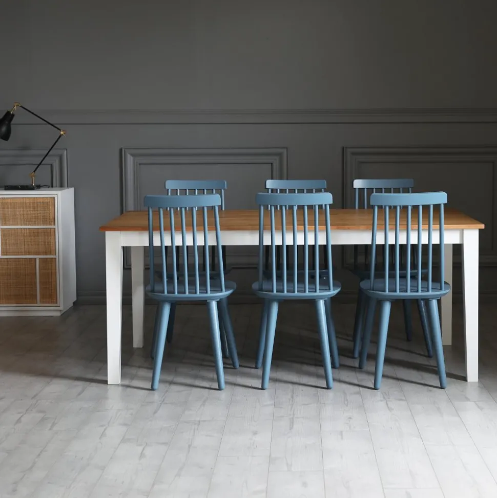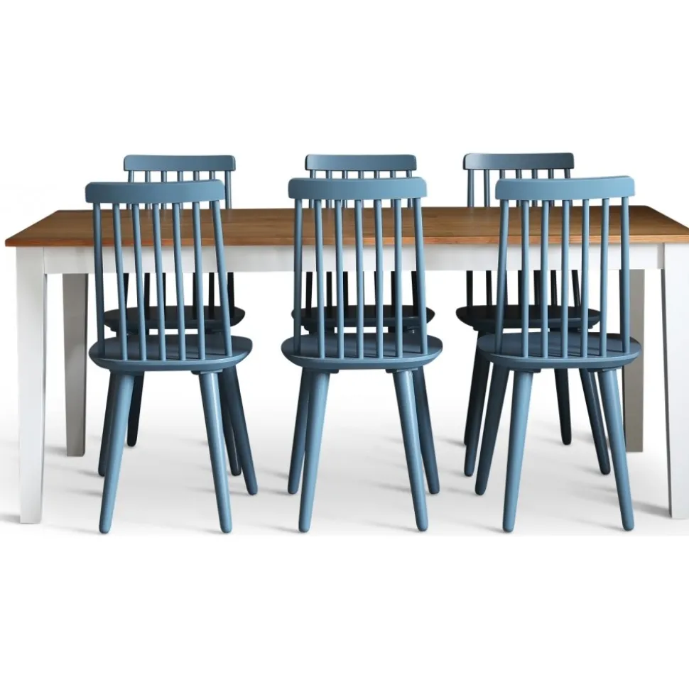 Dalsland med stort och bra matbord med toppskiva i oljad ek och svartlackat underrede. 6 st Dalsland pinnstolar i en läcker duvblå lack (RAL5007)