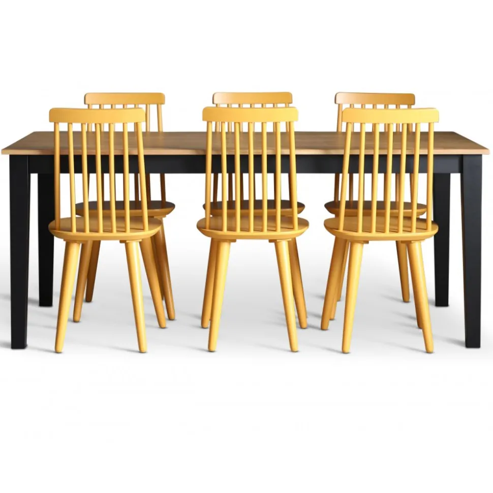 Dalsland med stort och bra matbord med toppskiva i oljad ek och svartlackat underrede. 6 st klassiska Dalsland pinnstolar i gul-lackat massivt trä.