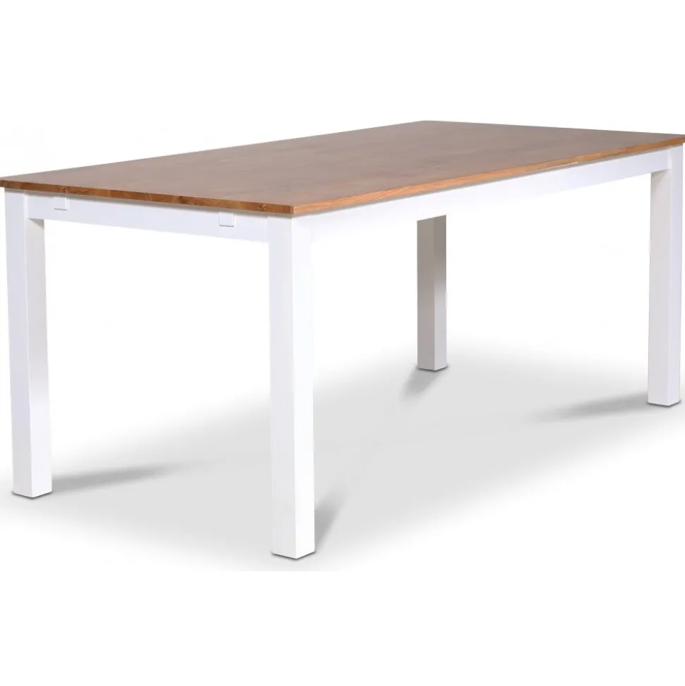 Dalsland med stort och bra matbord med toppskiva i oljad ek och vitlackat underrede. 6 st sköna Tuva Decutique stolar i blå sammet med vita ben.
