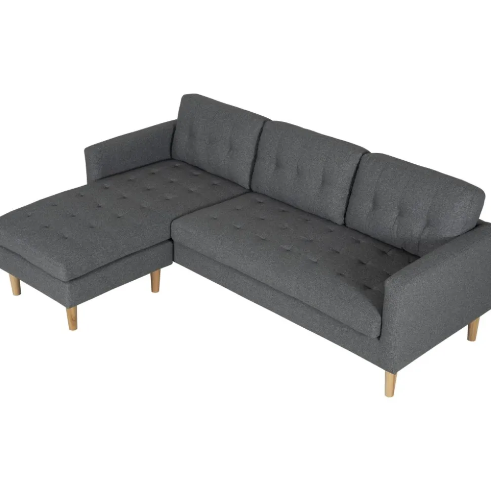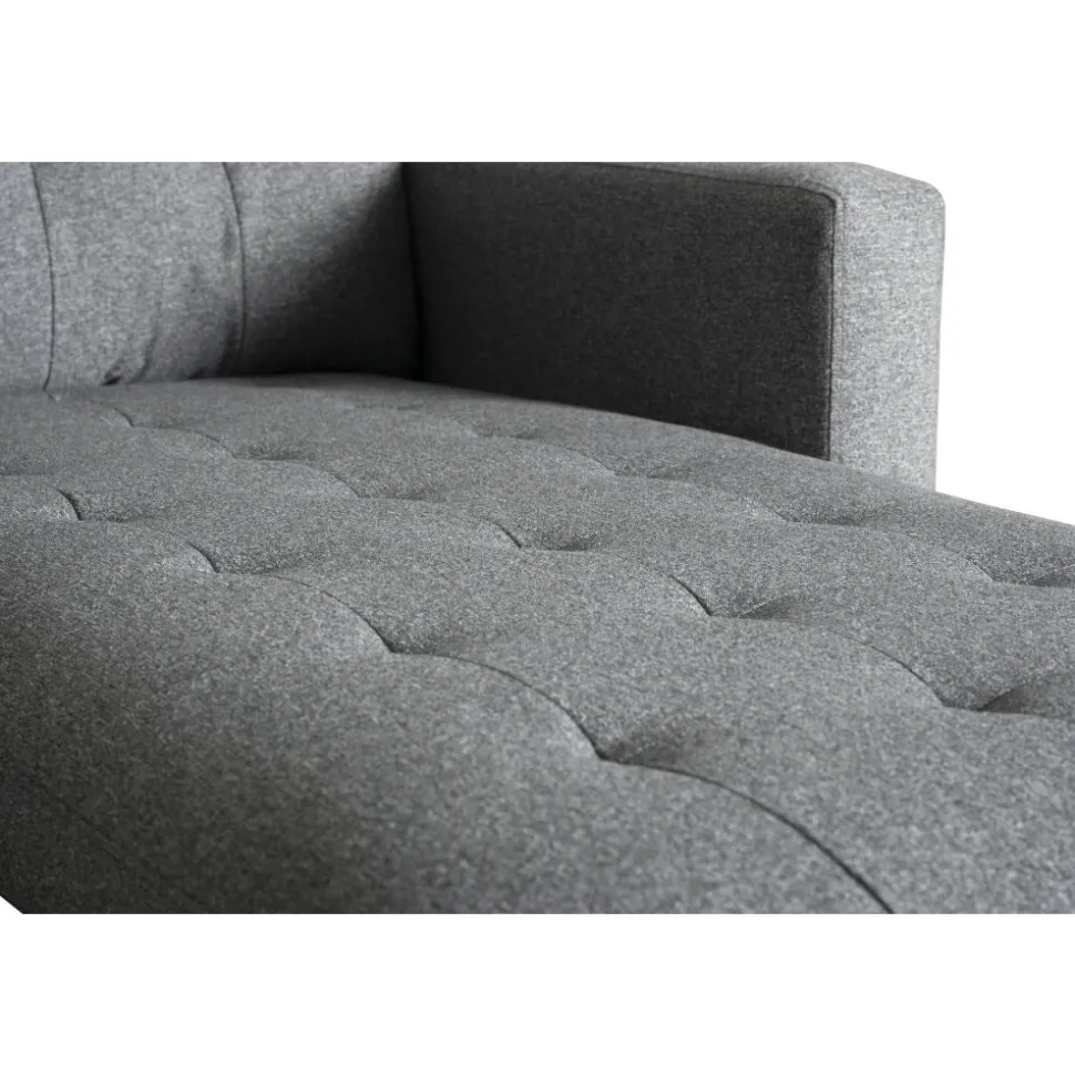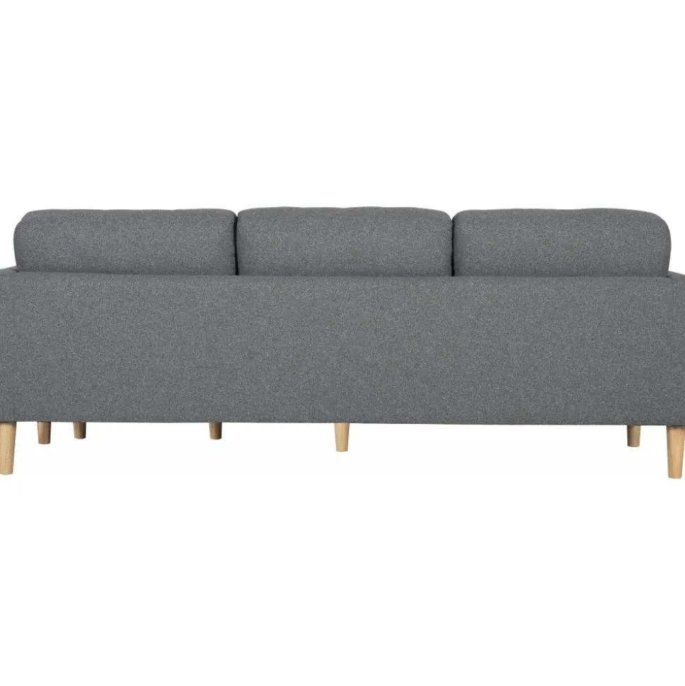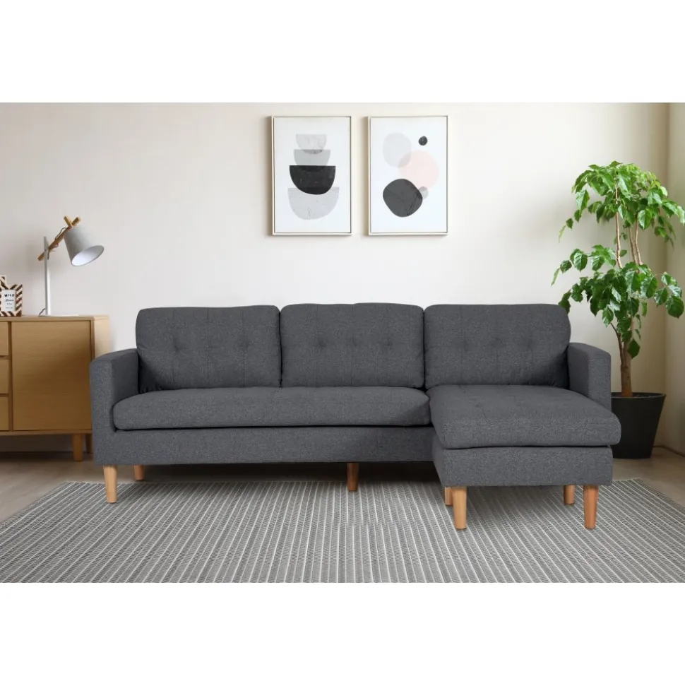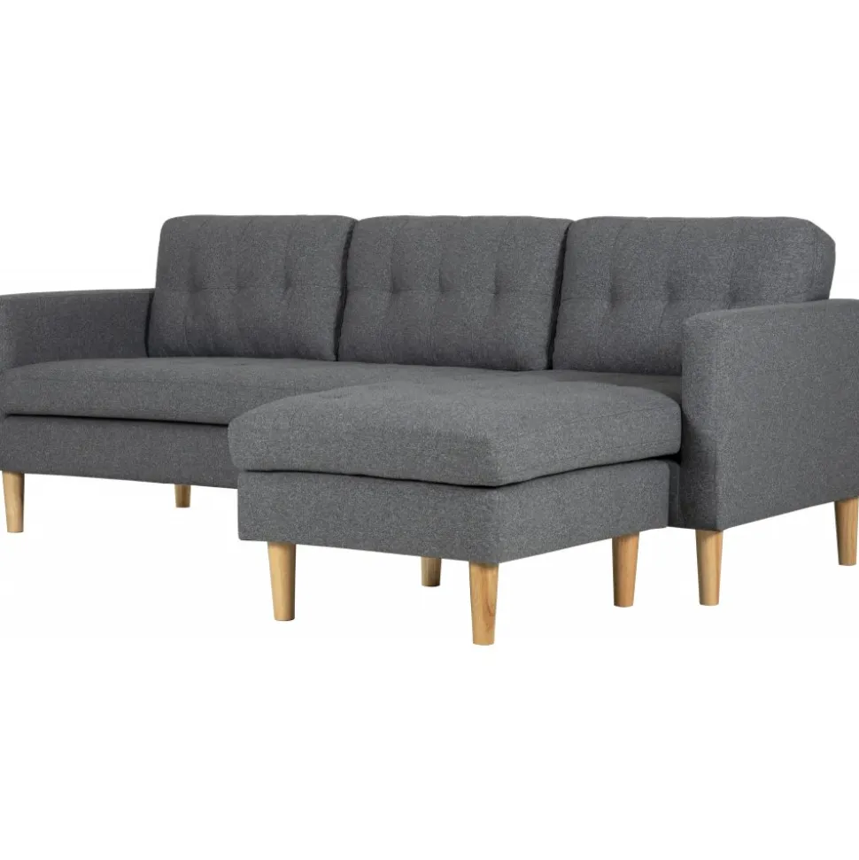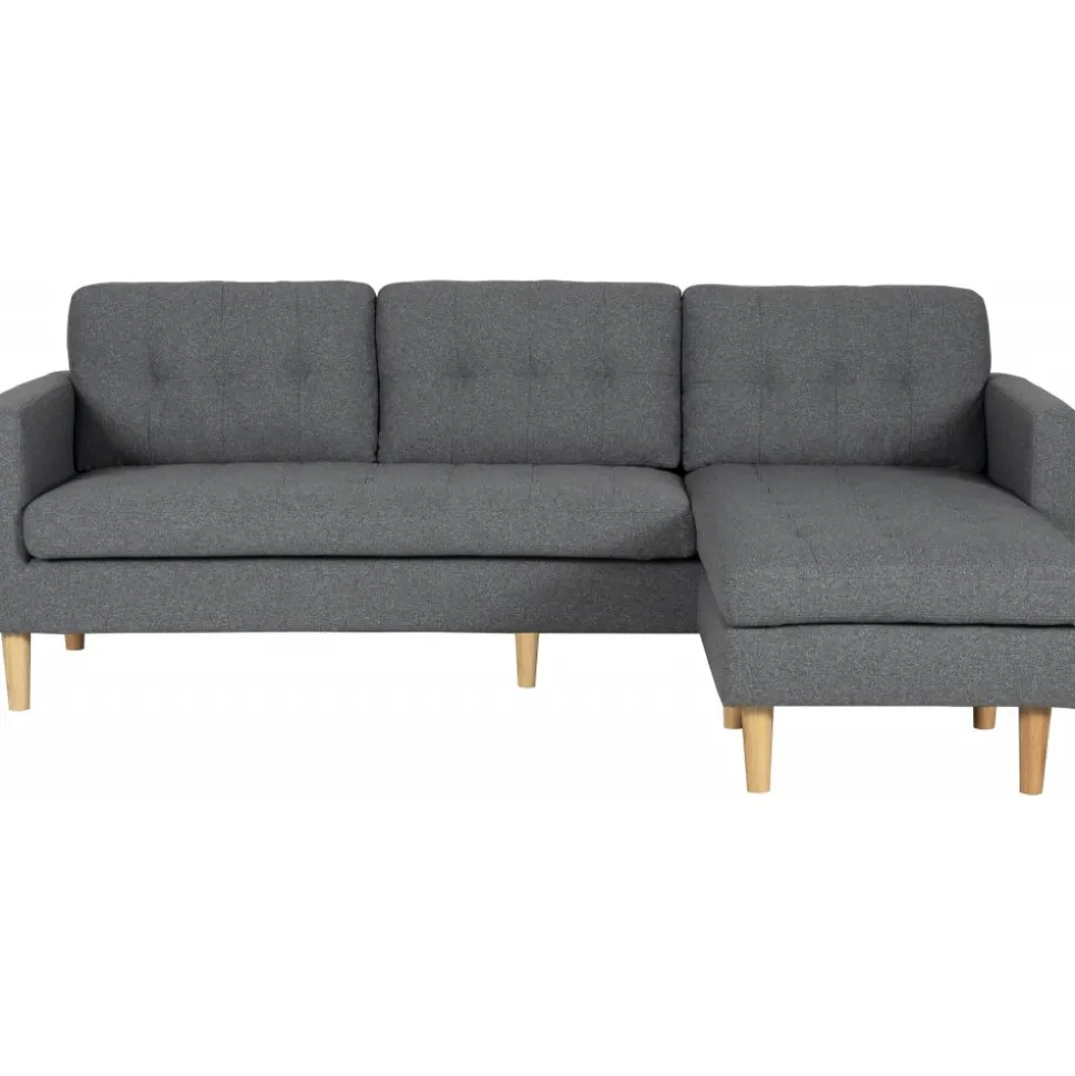 Divansoffa i mörkgrått tyg med träben. Sitt- och ryggdynor är löstagbara och divandelen är vändbar och kan placeras på valfri sida.