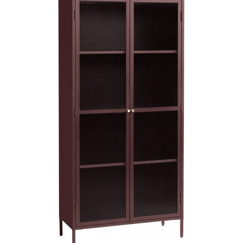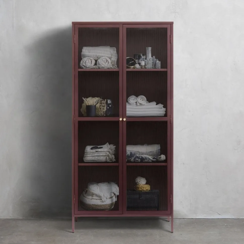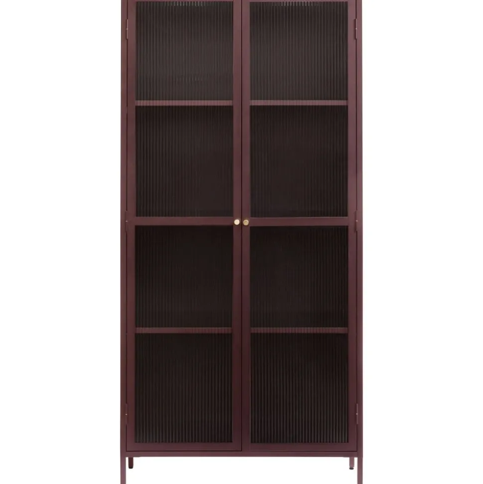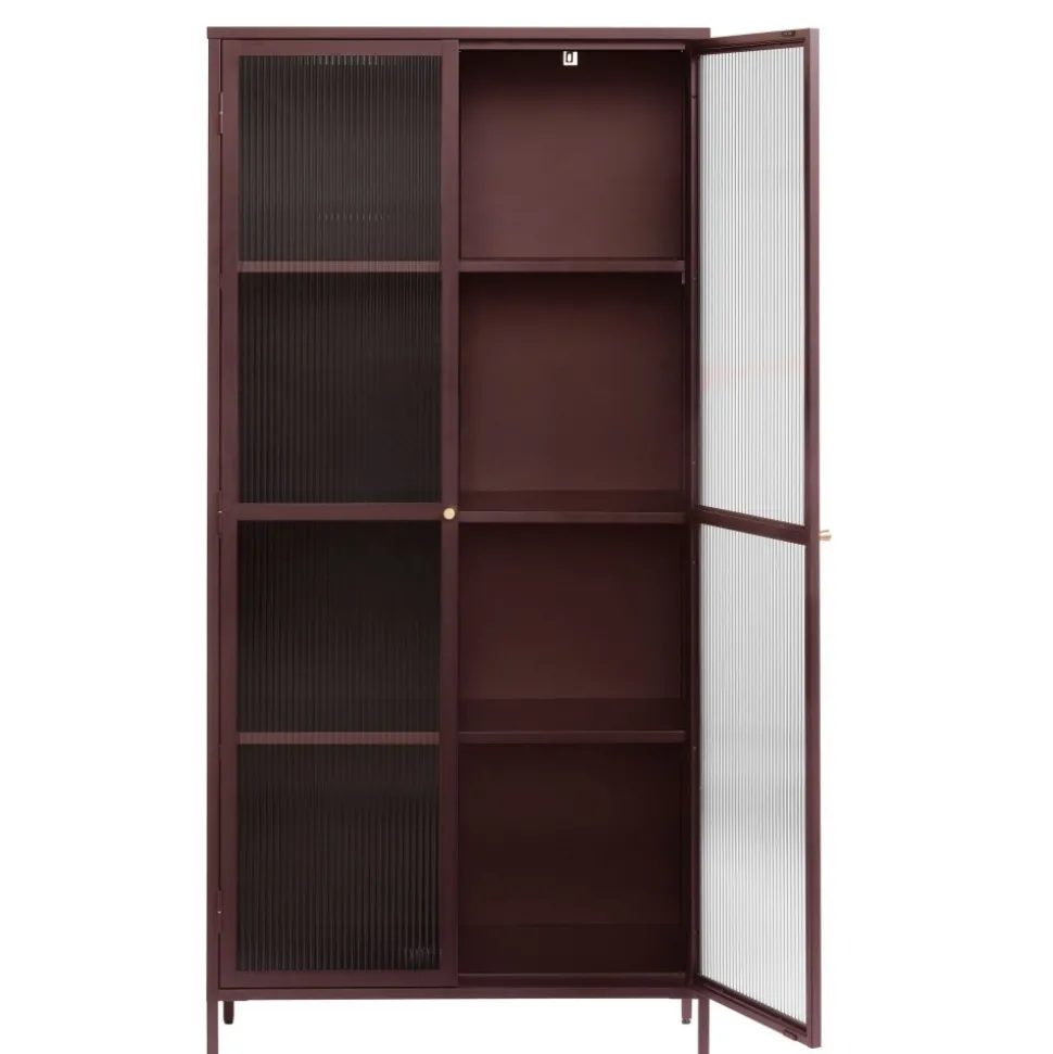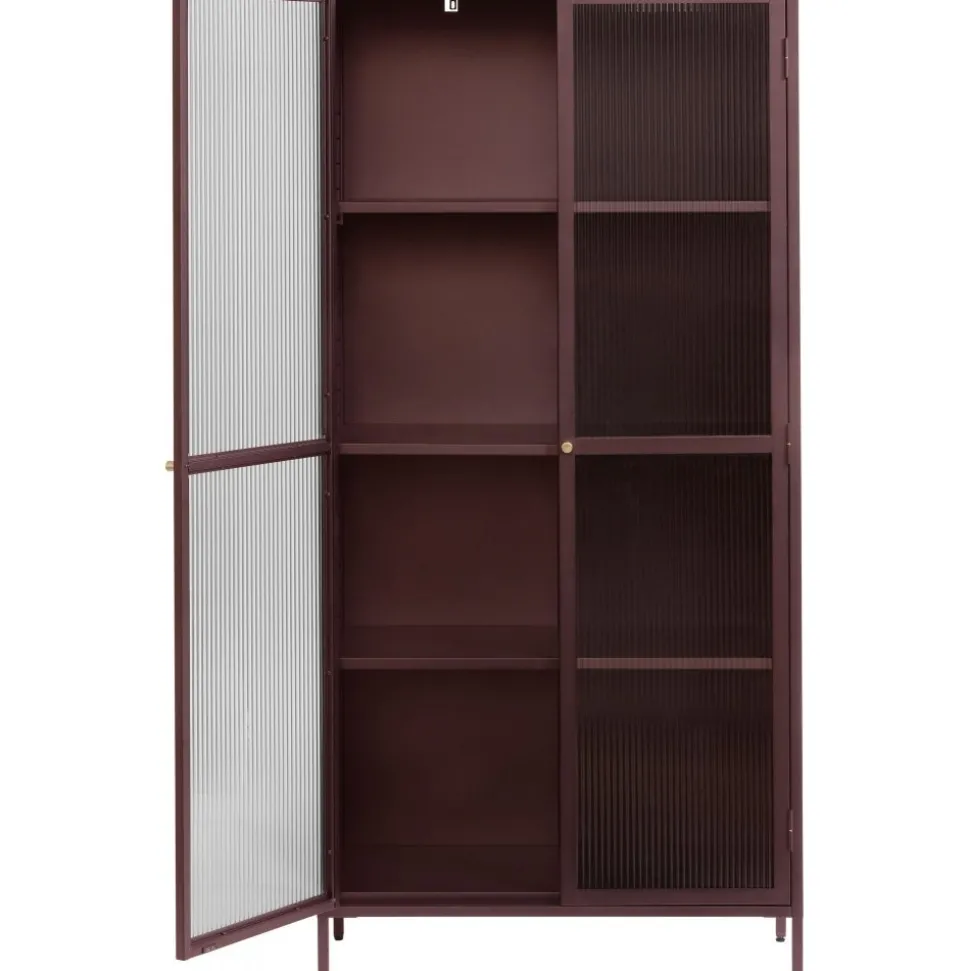 Dobb vinrött metallskåp med dörrar i riktigt linjerat glas. Handtag i mässing. Skåpet har en stabil konstruktion i metall.
