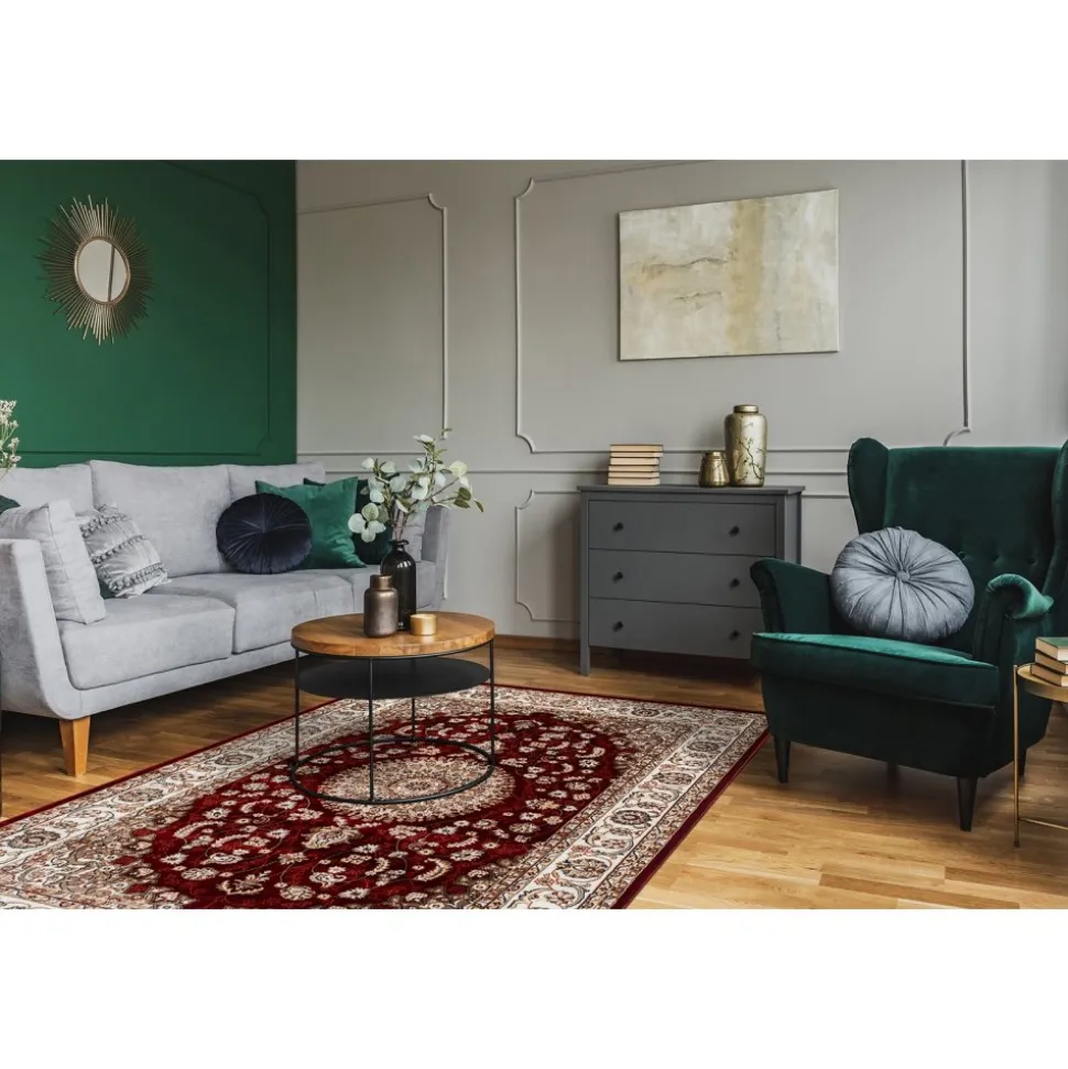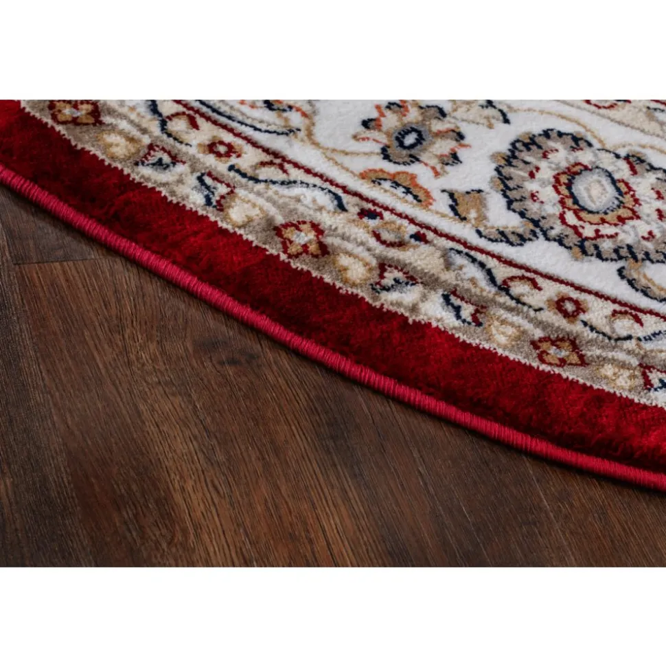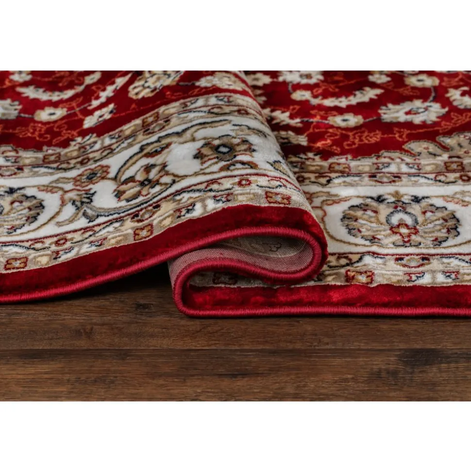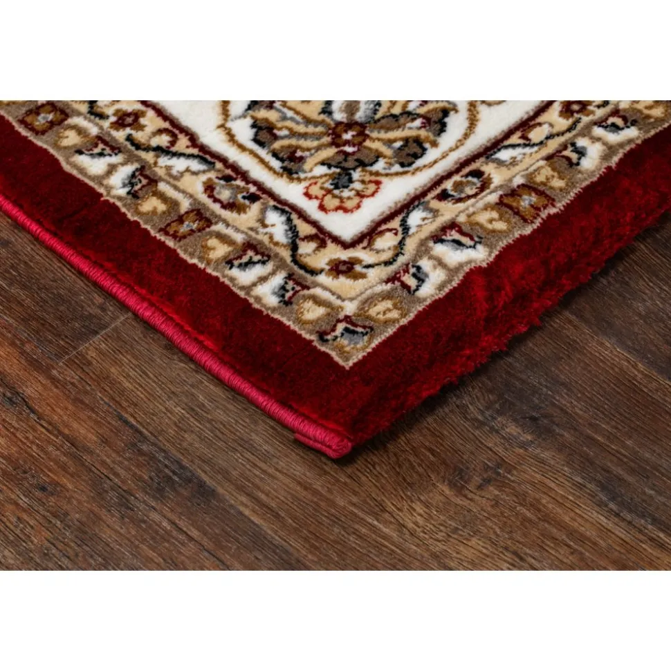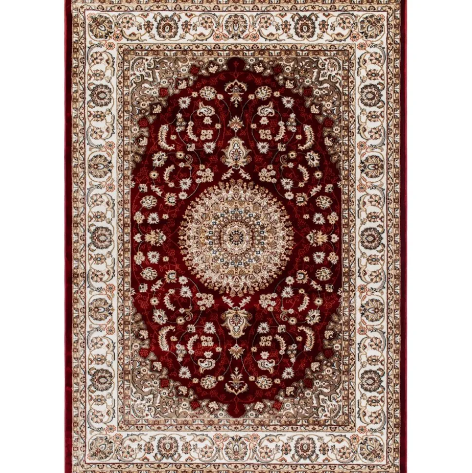 Dubai Medallion Röd är en vacker med rubinröd botten. Mattan har ett klassiskt orientaliskt medaljongmönster i creme med inslag av blått, vitt och natur. Runt om går en matchande bård och kanten har en langett med den vackra rubinröda färgen. Dubai har en fin lyster och finns i flertal storlekar och längder.