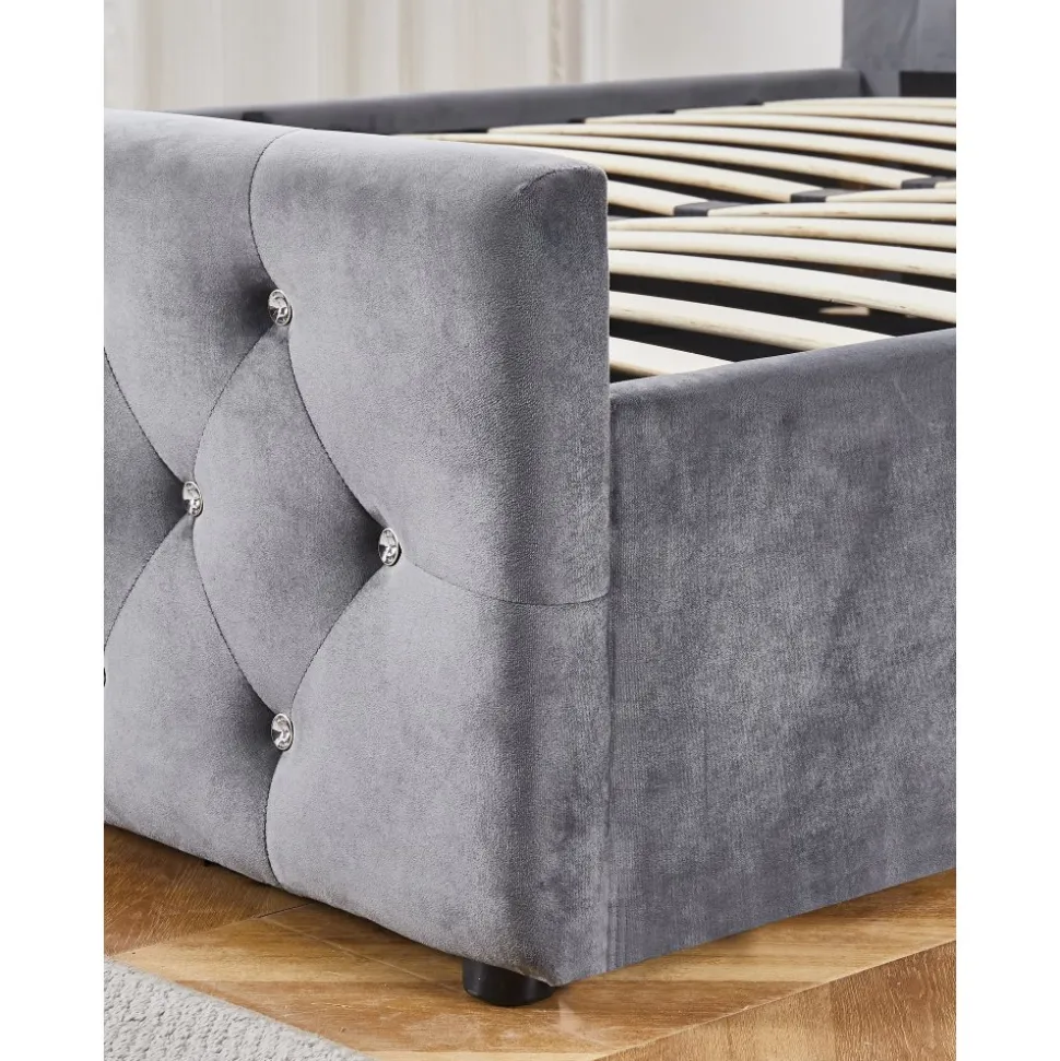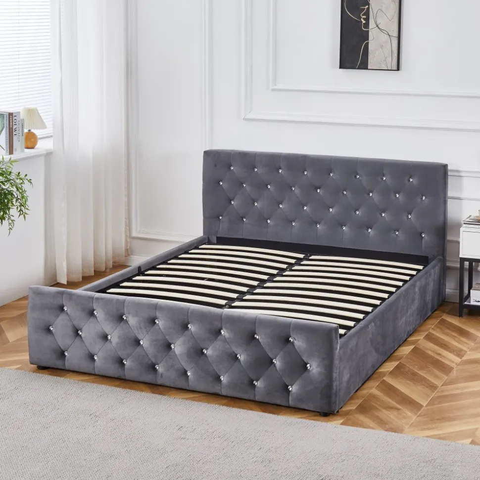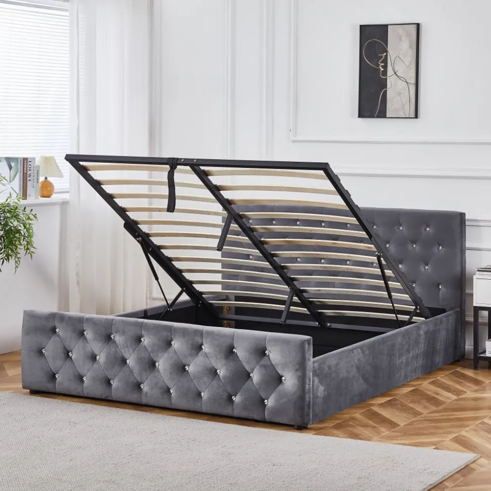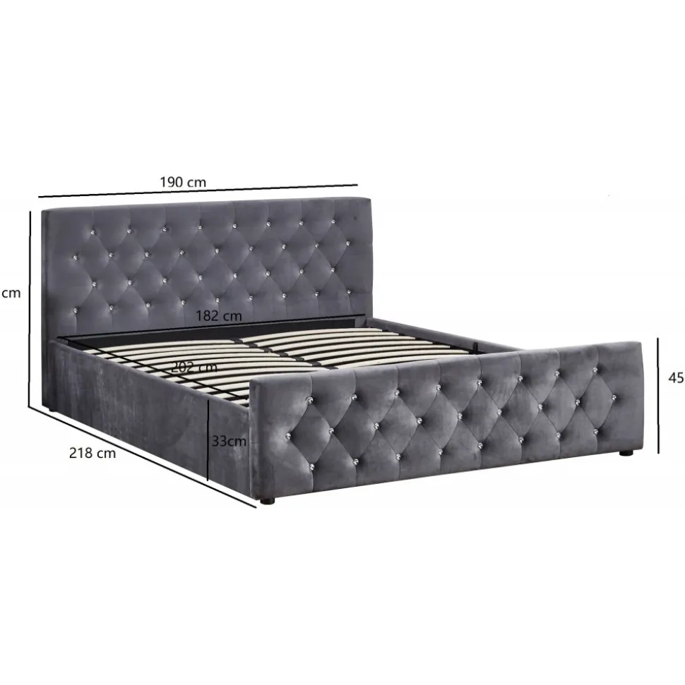 Dubbel som kommer med sänggavel och förvaringsutrymme under sängen. Dubai är designad för att erbjuda maximal komfort och en elegant estetik med sin klädsel i grått sammet och insydda kristalliknande knappar.