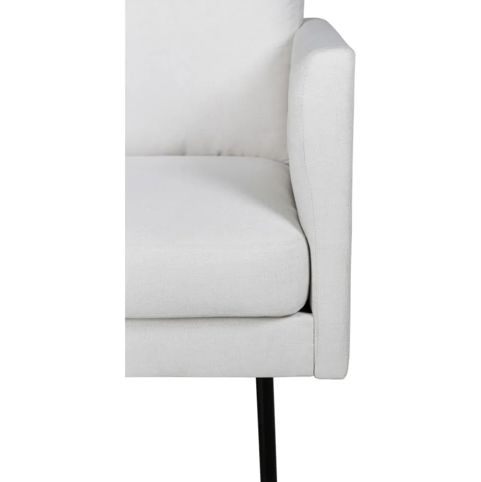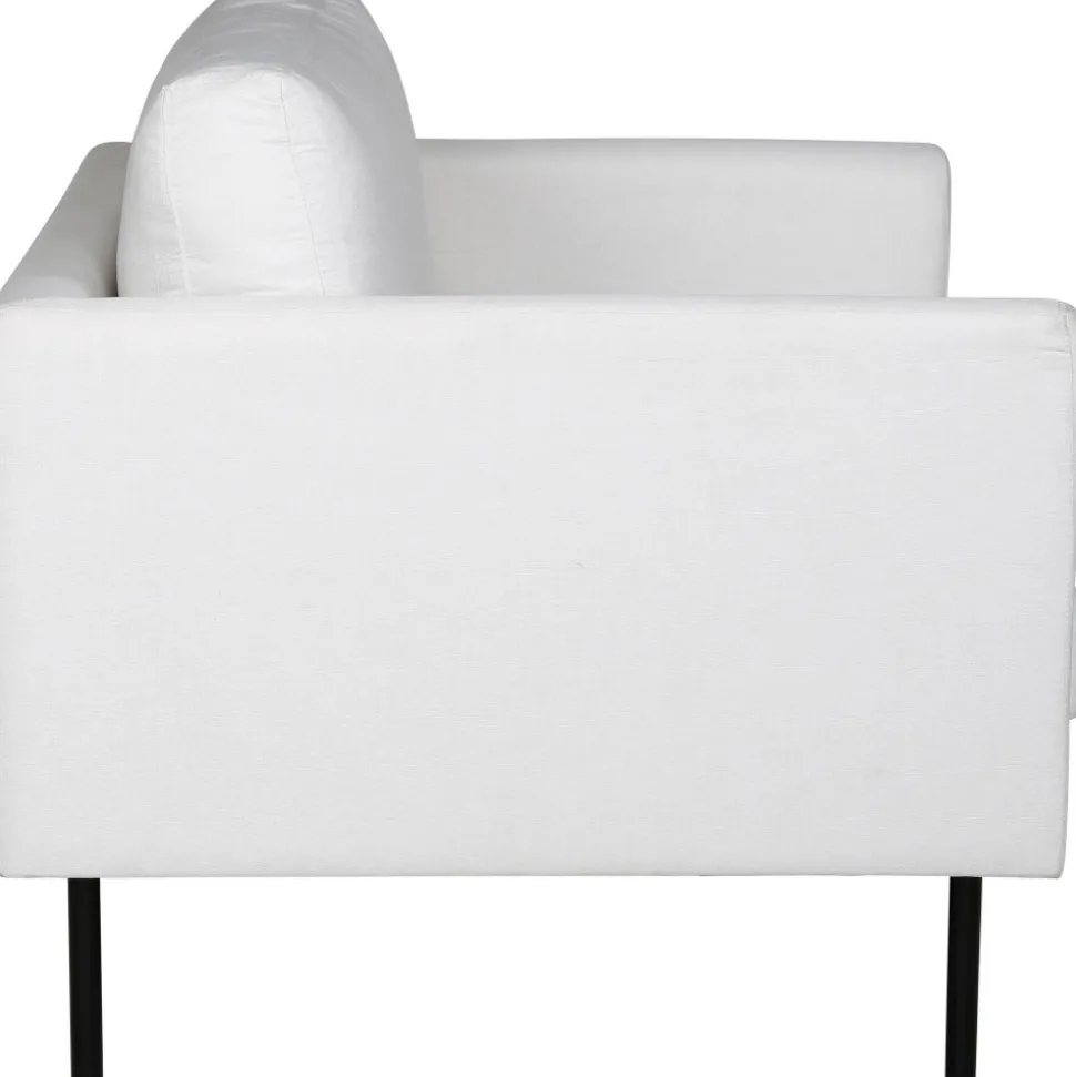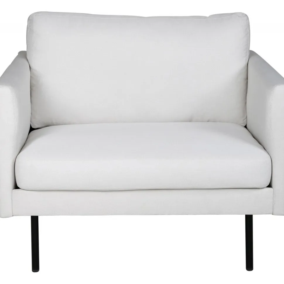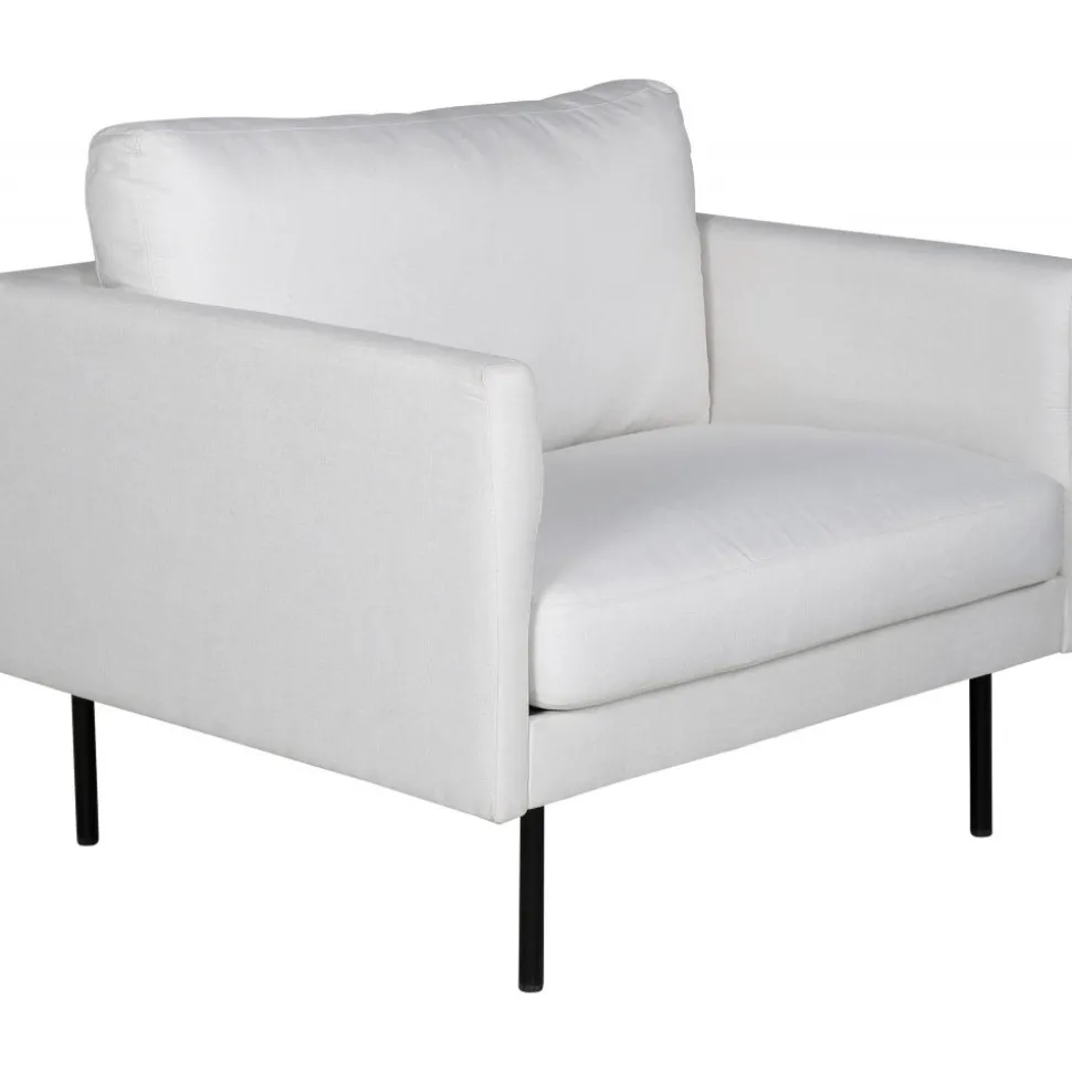 Fåtölj av metall och återvunnet trä, klädd med polyestertyg.
