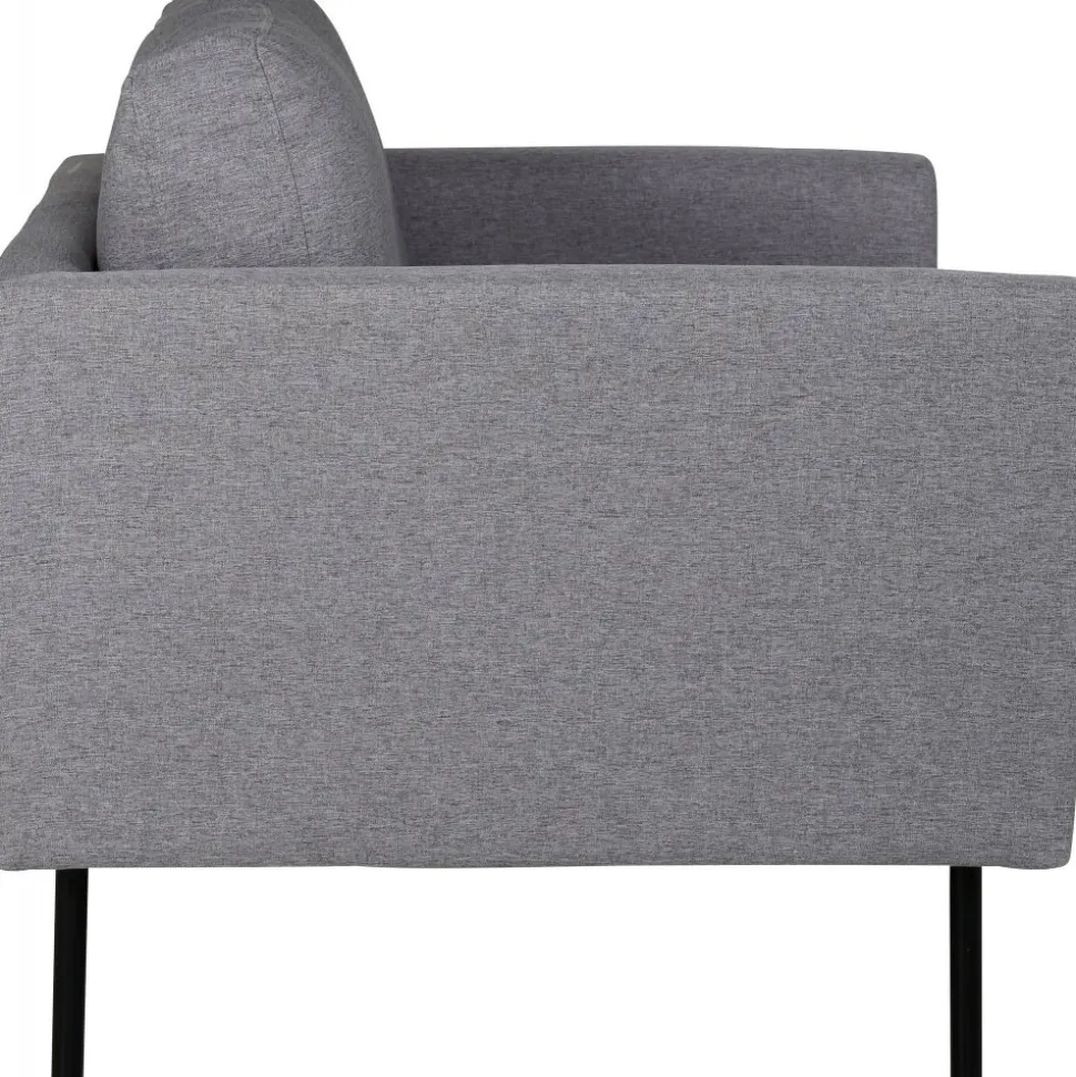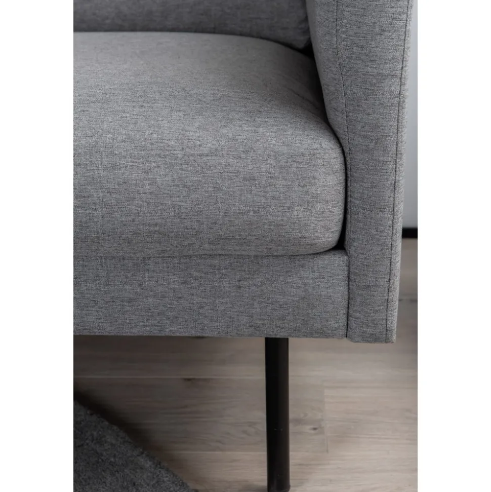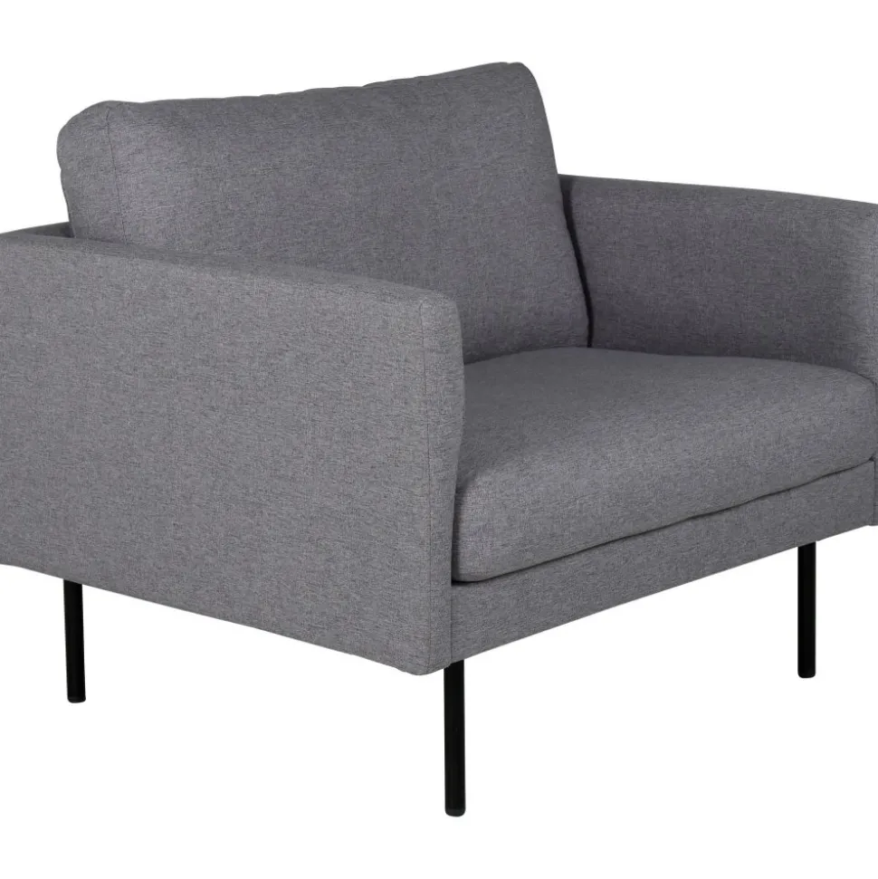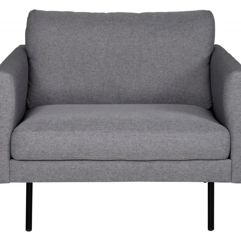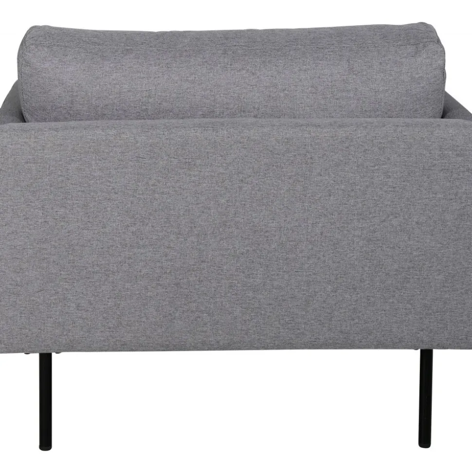 Fåtölj av metall och återvunnet trä, klädd med polyestertyg.