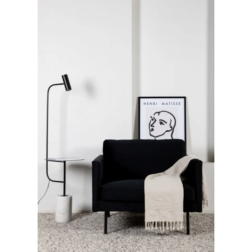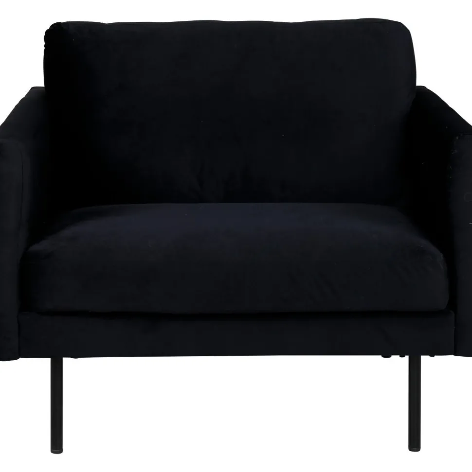 Fåtölj av metall och återvunnet trä, klädd med polyestertyg.
