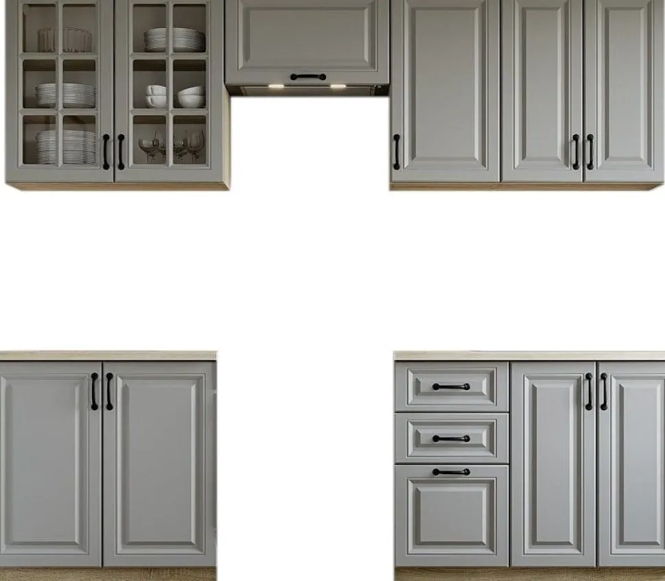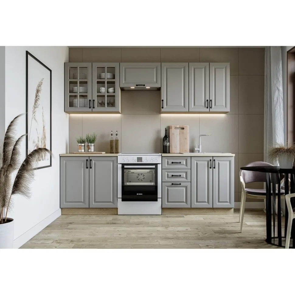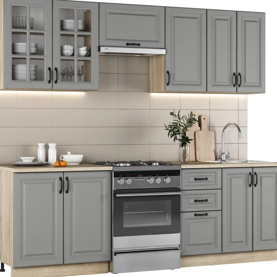 I grått och sonoma ek är en elegant och funktionell kökslösning som kombinerar modern design med praktiska funktioner. Med en total längd på 240 cm erbjuder detta gott om förvaringsutrymme och arbetsyta för både daglig matlagning och sociala tillställningar.