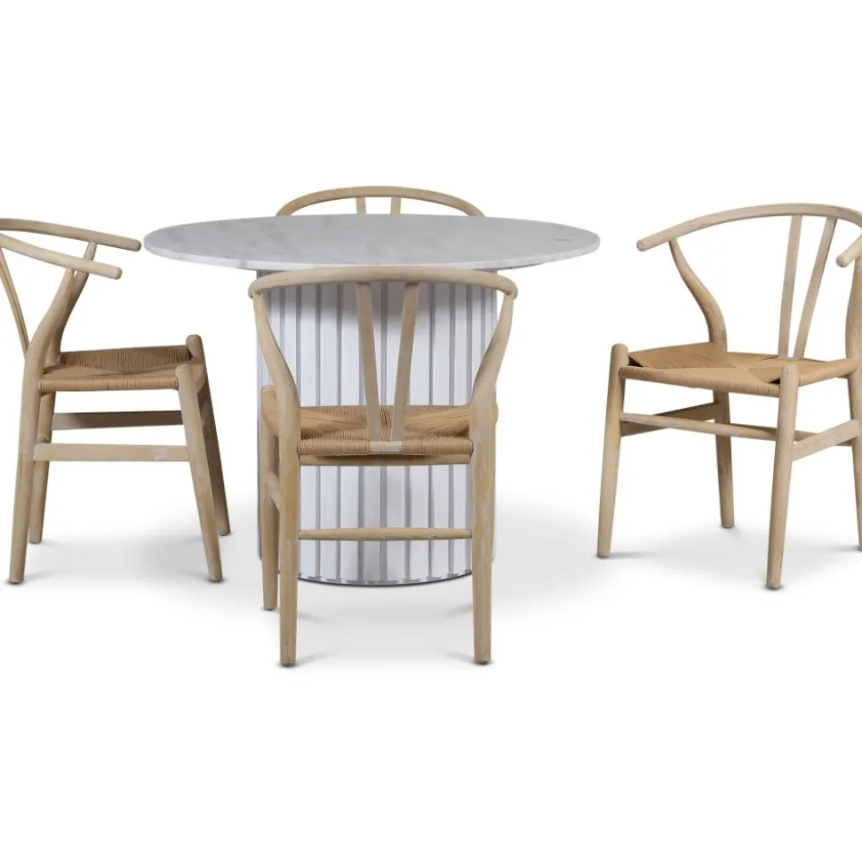 - Empire matgrupp Ø105 cm inkl. 4 st Brandon matstolar whitewash – Ljus marmor / Vit lamell träfot