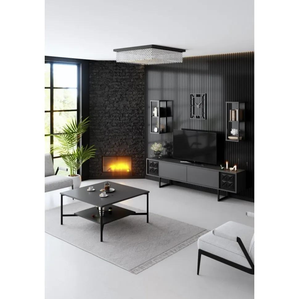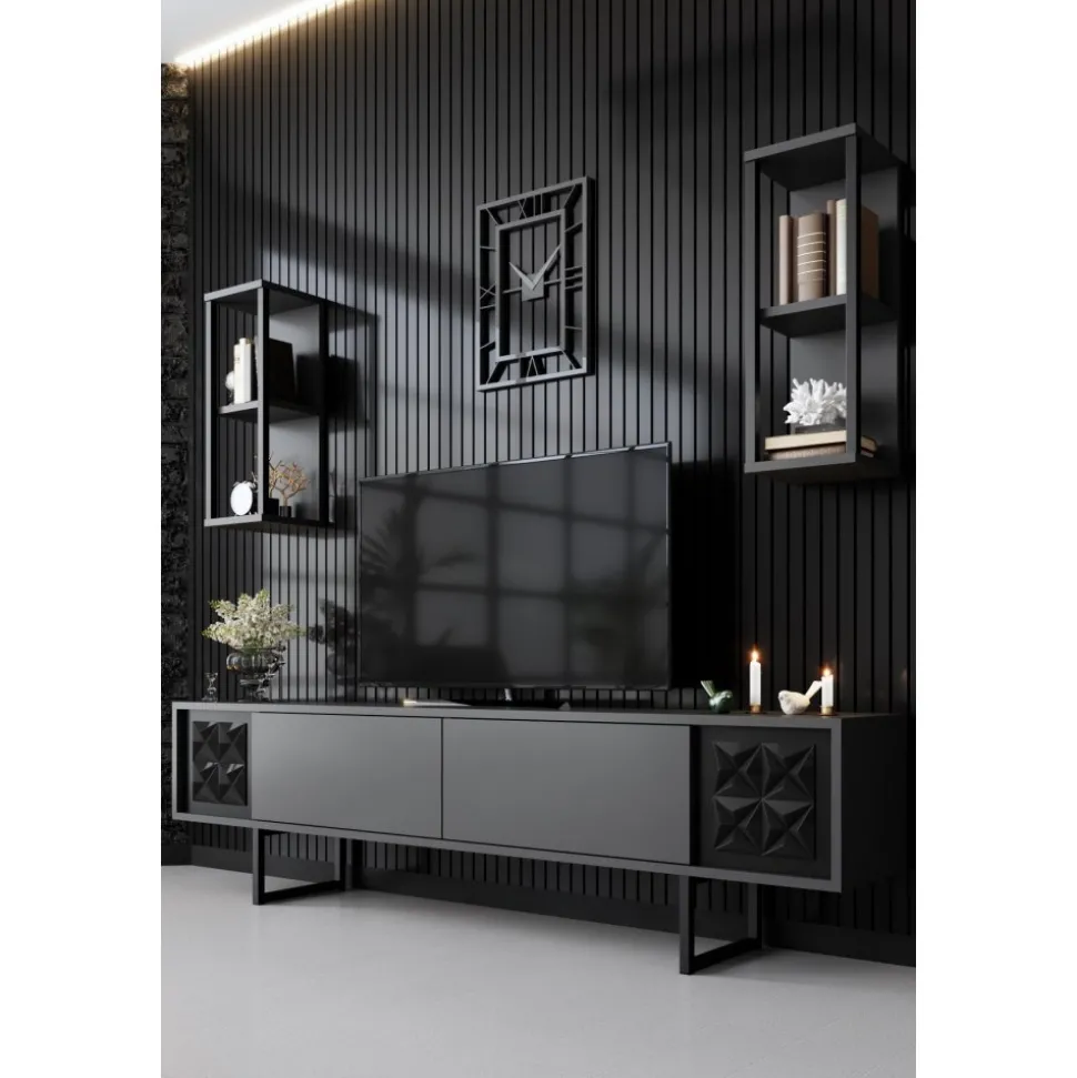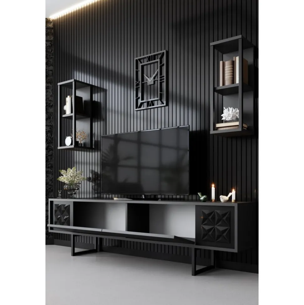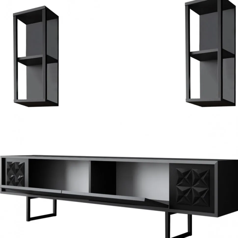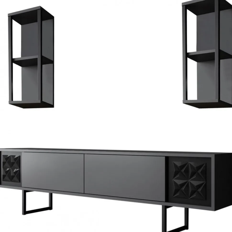 Mediabänk och vägghyllor av melaminbelagd spånskiva med ben av metall.