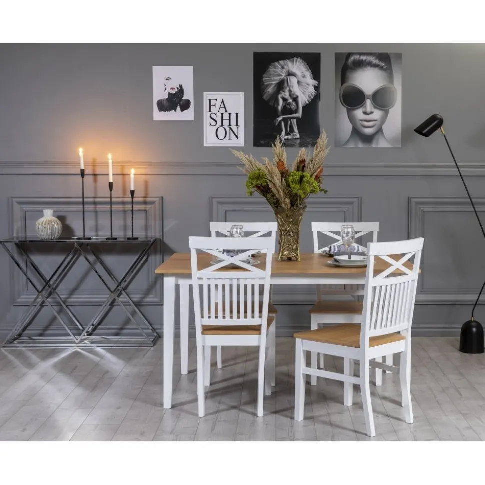 Klassiskt matgrupp, bord med underrede av massivt vitmålat trä med bordsskiva av MDF med stryktålig oljad ekfanér. Denna finns även med 180 cm bord. Modern stol i massivt heveaträ, vitlackad med sits av ekfaner.