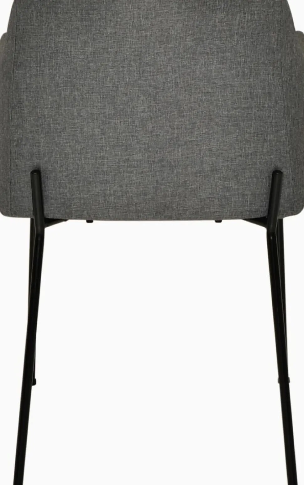Karmstol i ett behagligt grått tyg, underrede av svartlackad metall.