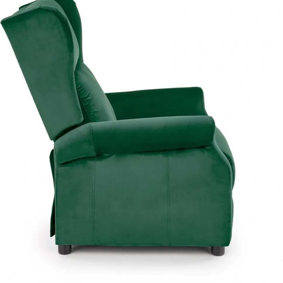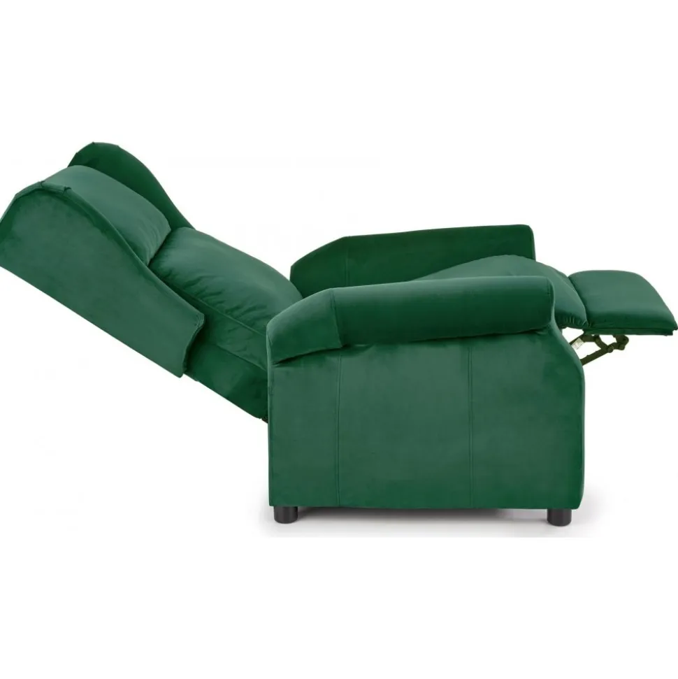 Reclinerfåtölj i ett mjukt grönt tyg med fällbar funktion.