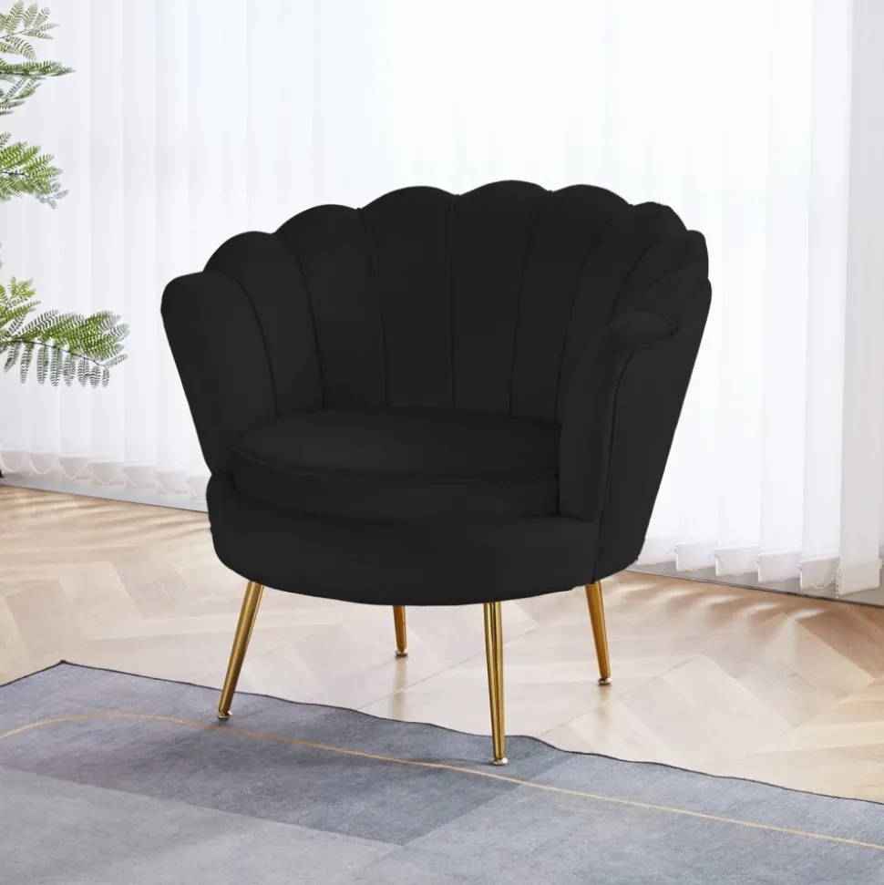 Fåtölj klädd i ett behagligt sammetstyg, olika utförande på klädsel och ben. Utmärkande vågigt mönster på ryggstödet, tjock skummstoppad dyna för god komfort.