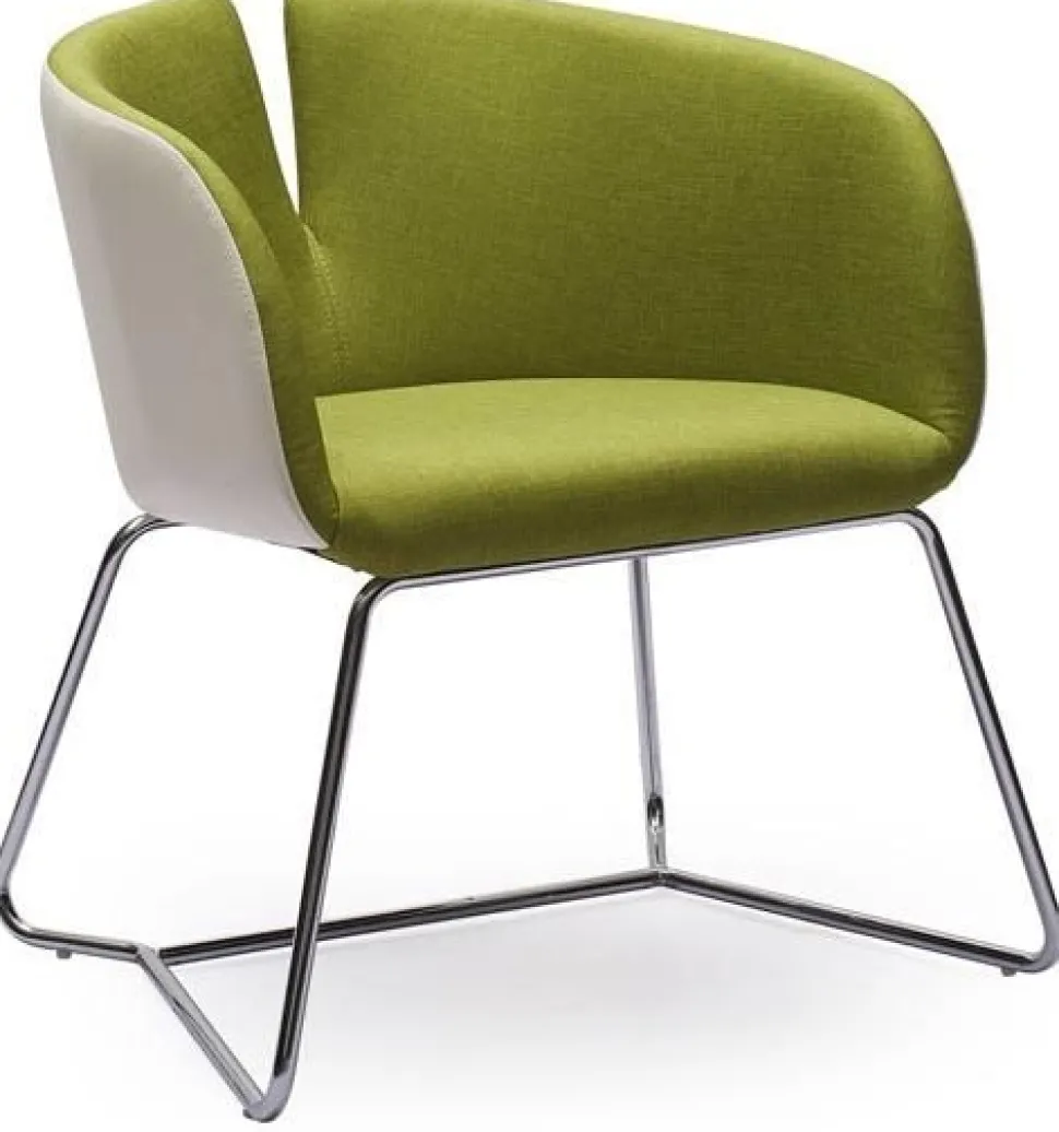 En mysig med en stilren design. Underredet är tillverkat i kromad metall och sitsen är klädd med ett härligt vitt konstläder och grönt tyg för maximal komfort.