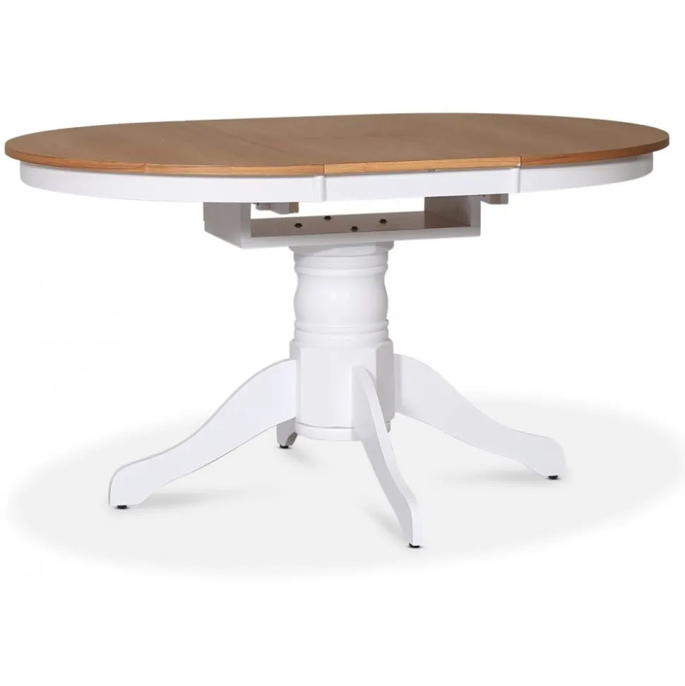Fitchburg från Skånska Möbelhuset, förlägningsbart matbord 106-141 cm med vitt underrede och en toppskiva i oljad ekfanèr. Det ingår fyra stycken matchande Danderyd matstolar i svartlackat trä med rottingsits.