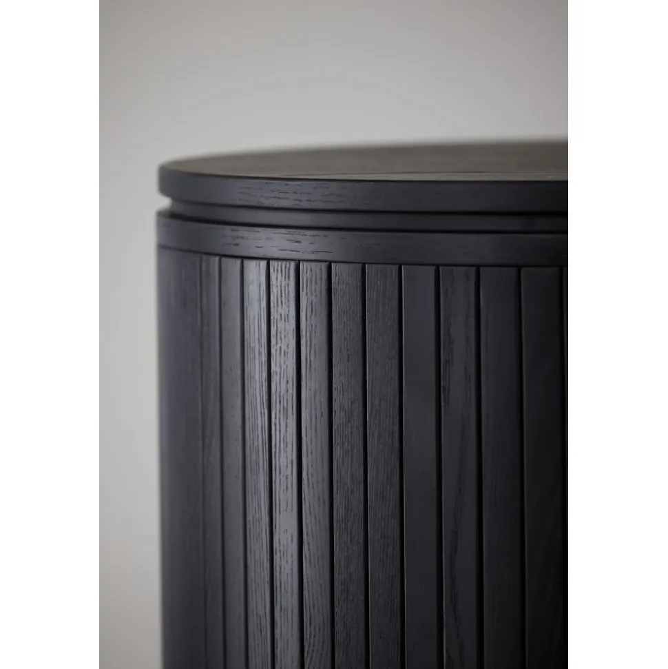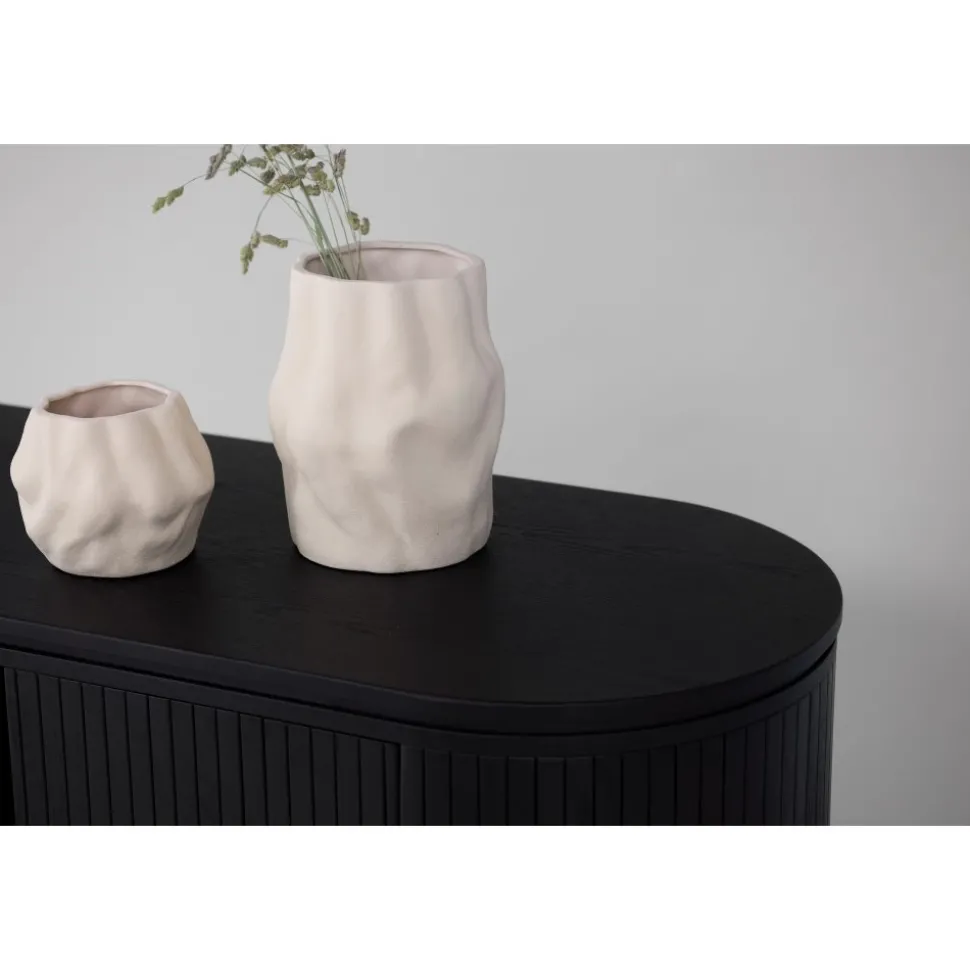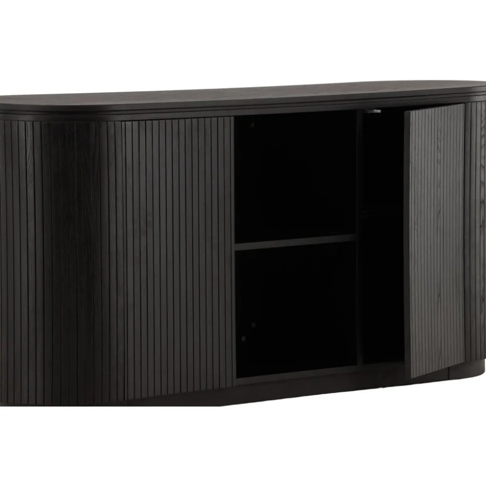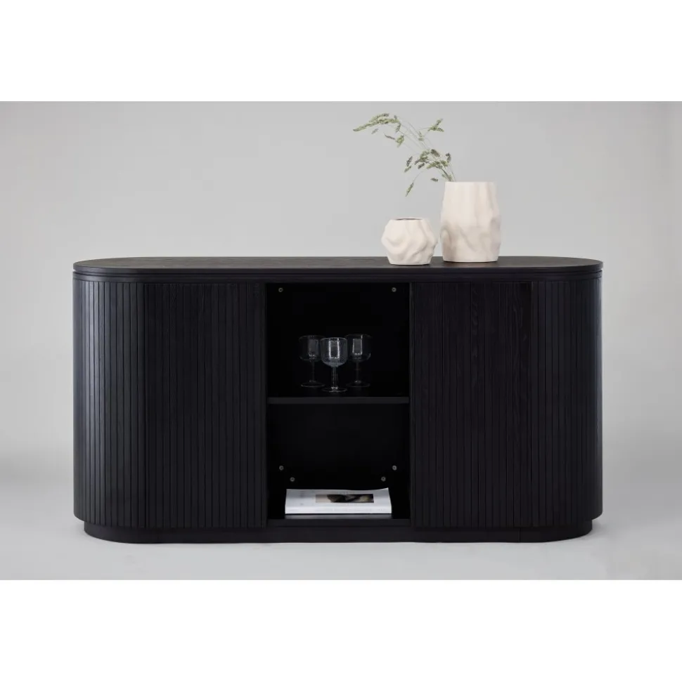 En oval skänk som möjliggör både synlig och dold förvaring. Skänken har en smäcker, skandinavisk design i svart ek med faner. Här finns både skåp för dold förvaring och två öppna hyllplan som passar utmärkt för lite vackra inredningsdetaljer eller små ljuslyktor. Höj stilnivån i ditt hem med en trendsäker förvaringsmöbel som står sig över tid.
