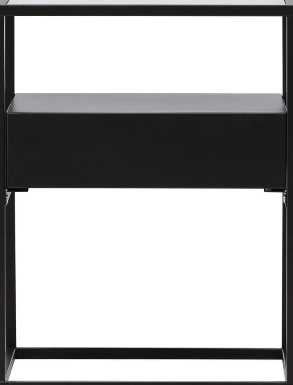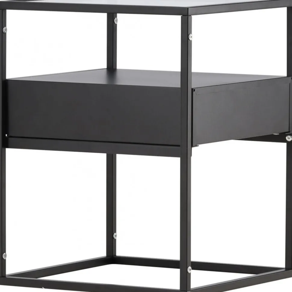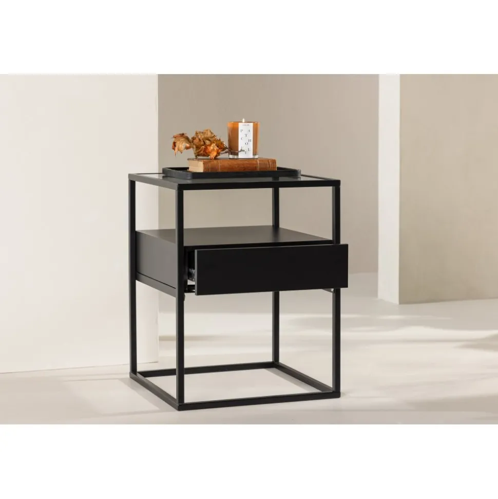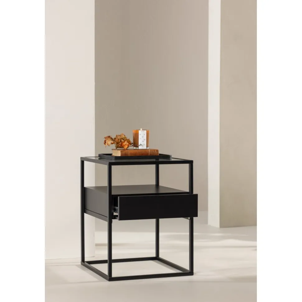 Förnya din inredning med ett stilrent, modernt från vår serie Fortaleza! Det ger inte bara en sofistikerad touch till din inredning utan reflekterar även din personliga stil och modemedvetenhet. Det här svarta sidobordet har en toppskiva i glas och en ramkonstruktion i svart stål. Med plats för smidig förvaring är det här sidobordet också utrustat med en diskret låda och hyllplan, vilket möjliggör både dold och synlig förvaring. Aldrig mer oordning – håll dina ägodelar organiserade och pryd med något vacker ljuslykta eller favoritbok för en personlig och hemtrevlig touch. Den smidiga storleken gör också att det går att använda till mycket. Placera som nattduksbord eller som ett sofistikerat sidobord i vardagsrummet – bara fantasin sätter gränser. Fortaleza sidobord finns även i en vacker vit färg om det passar just din inredningsstil bättre! Levereras omonterad.