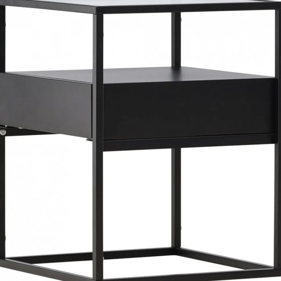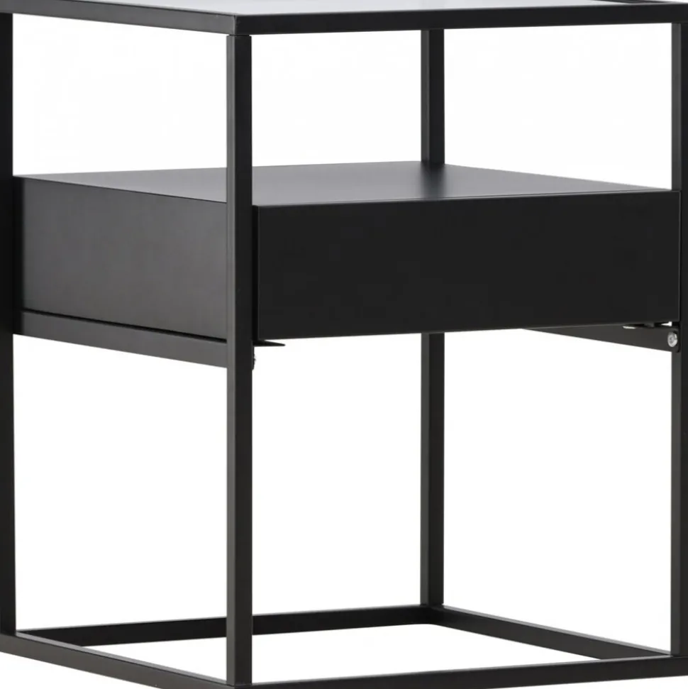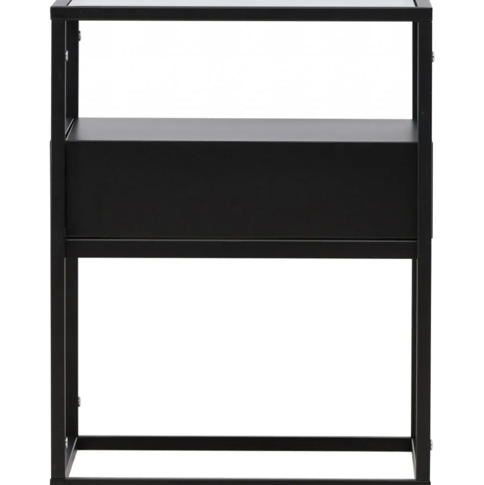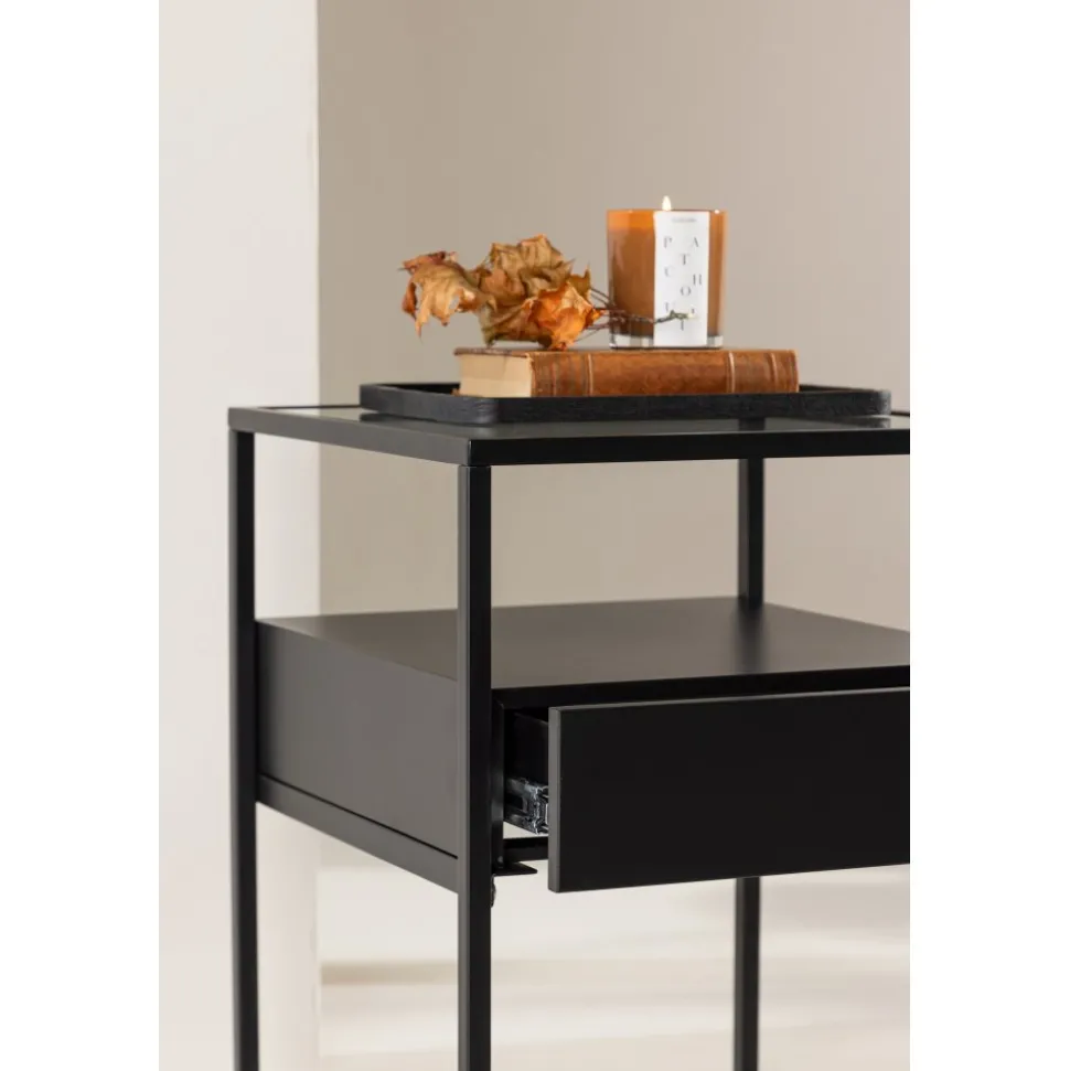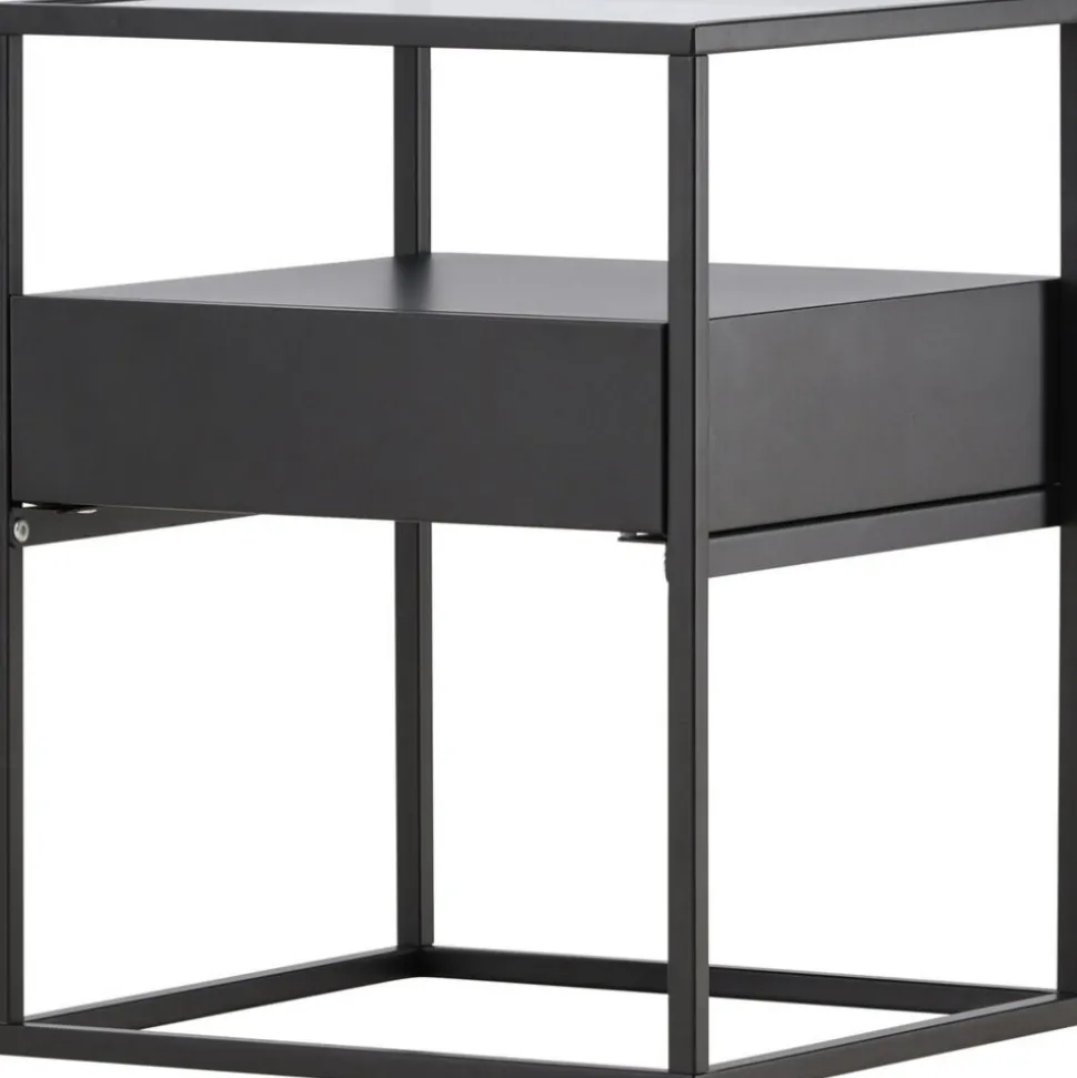 Förnya din inredning med ett stilrent, modernt från vår serie Fortaleza! Det ger inte bara en sofistikerad touch till din inredning utan reflekterar även din personliga stil och modemedvetenhet. Det här svarta sidobordet har en toppskiva i glas och en ramkonstruktion i svart stål. Med plats för smidig förvaring är det här sidobordet också utrustat med en diskret låda och hyllplan, vilket möjliggör både dold och synlig förvaring. Aldrig mer oordning – håll dina ägodelar organiserade och pryd med något vacker ljuslykta eller favoritbok för en personlig och hemtrevlig touch. Den smidiga storleken gör också att det går att använda till mycket. Placera som nattduksbord eller som ett sofistikerat sidobord i vardagsrummet – bara fantasin sätter gränser. Fortaleza sidobord finns även i en vacker vit färg om det passar just din inredningsstil bättre! Levereras omonterad.