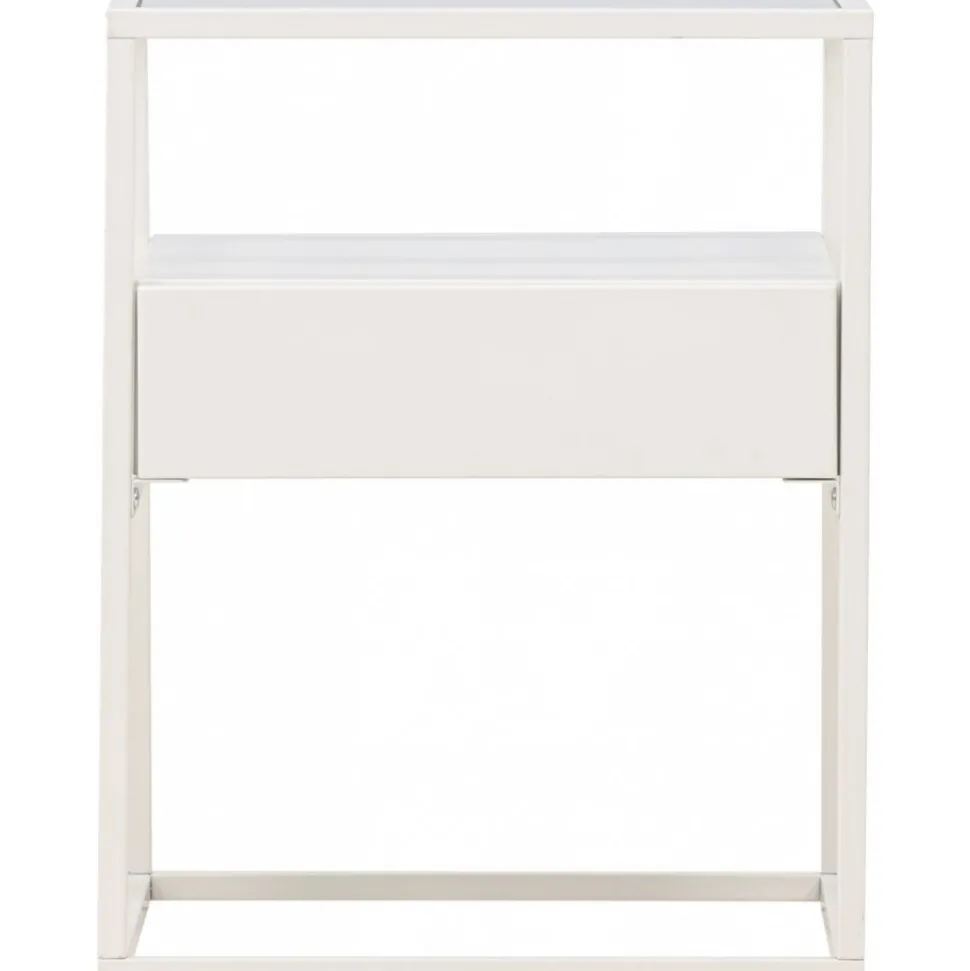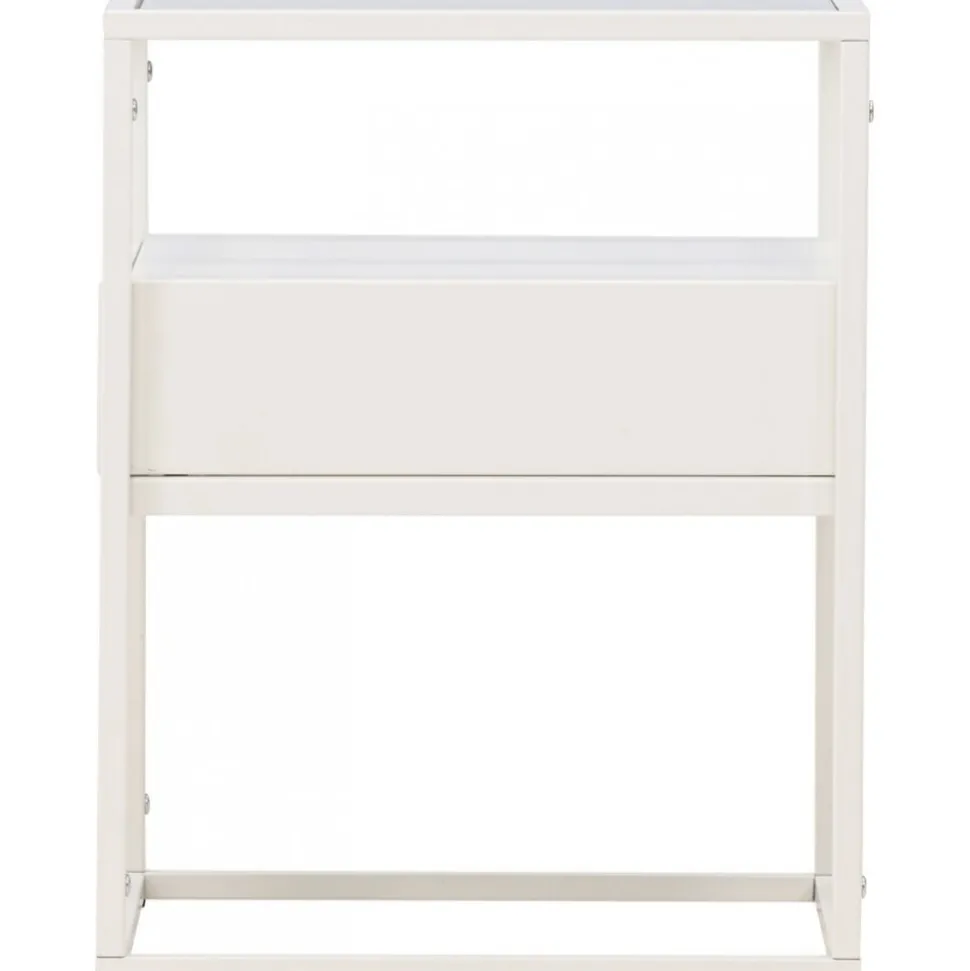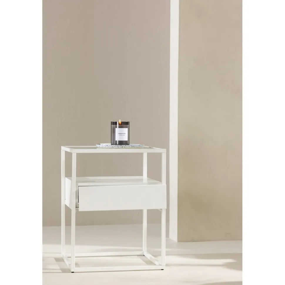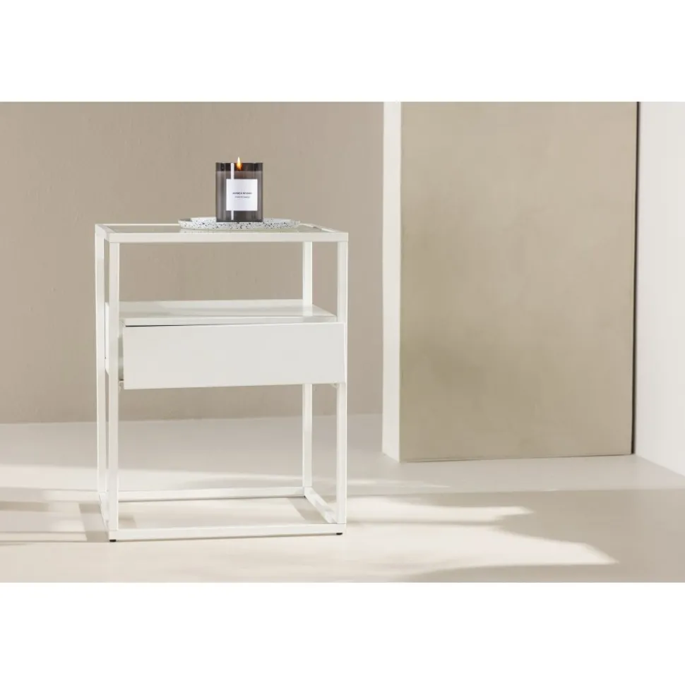 Rama in sängen med ett vackert vitt nattduksbord i glas och stål från vår serie Fortaleza! Det här vita sidobordet i nätt storlek ger inte bara en sofistikerad touch till din inredning utan reflekterar även din personliga stil och modemedvetenhet. Med en toppskiva i glas och en ramkonstruktion i vitt stål blir detta snabbt en favorit. Det här sidobordet är också utrustat med en diskret låda och hyllplan, vilket möjliggör både dold och synlig förvaring. Aldrig mer oordning – håll dina ägodelar organiserade och pryd med något vacker ljuslykta eller favoritbok för en personlig och hemtrevlig touch. Den smidiga storleken gör också att det går att använda till mycket. Placera som nattduksbord eller som ett sofistikerat i vardagsrummet – bara fantasin sätter gränser. Fortaleza sidobord finns även i en sotig svart färg om det passar just din inredningsstil bättre! Levereras omonterad.