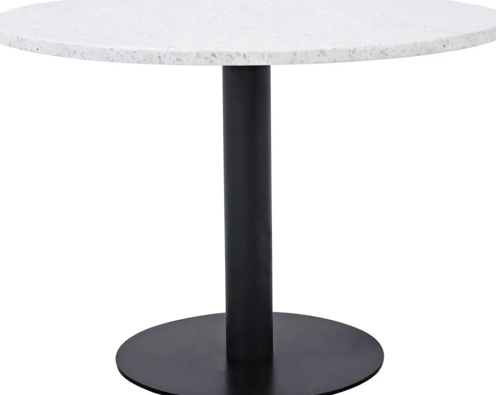 Modernt med vit Terazzo marmorskiva och underrede i svart metall.