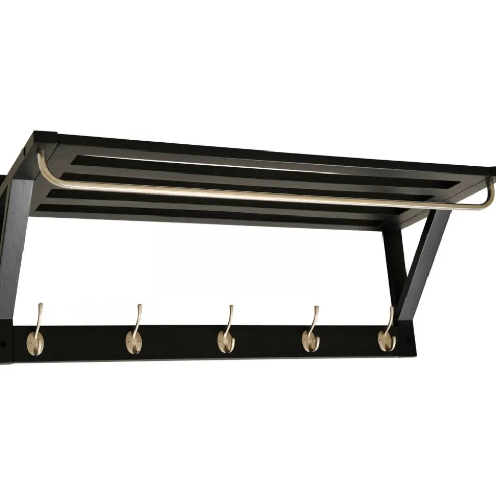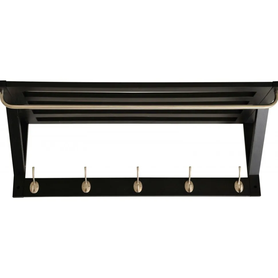 Hatthylla med 5 hängkrokar och en klädstång. Gjord i svarlackerad ek och metall