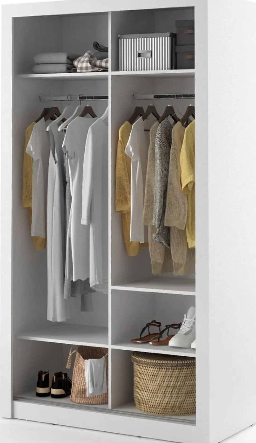En snygg och mycket rymlig med en modern design. Tillverkad i Chipboard och med många förvaringsmöjligheter. Bakom de två skjutdörrarna, varav en med spegel, finner du massa med utrymme, klädstång och hyllplan. Handtag av plast med blank finish. Levereras omonterad.